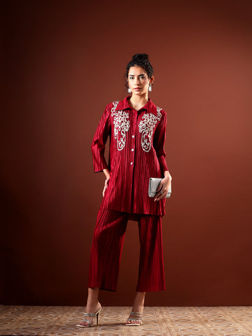 Party co-ord sets feature statement elements like sequins, metallic finishes, satin fabrics, bold cuts and dramatic sleeves. Crop tops paired with flared pants or fitted skirts create a strong, confident silhouette.