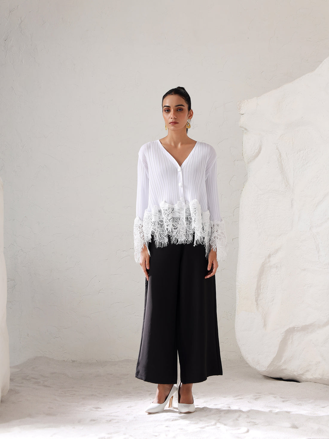Elegant and effortlessly feminine, this pleated lace-detail top is designed to elevate your everyday wardrobe...