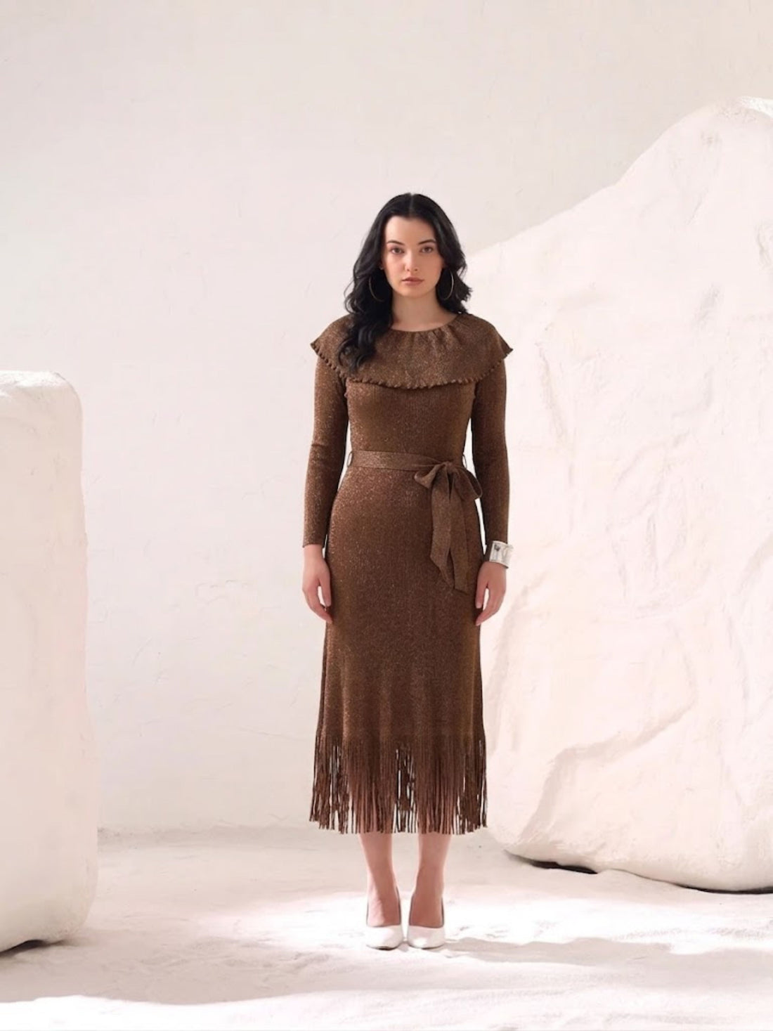 Add elegance to your wardrobe with our curated midi metallic dress collection. Perfect for work events, dinner dates, or special occasions, these dresses offer a classic look with a stylish sparkle. Choose from different neck designs, sleeve styles, and lengths to find the one that suits you best.