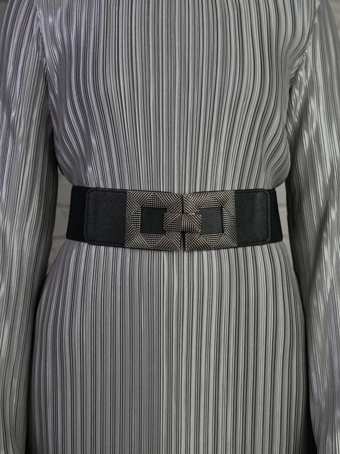Geo Luxe Belt A sophisticated elastic belt featuring a statement geometric buckle with intricate textured...