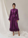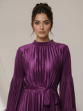 This pleated dress blends refined glamour with feminine detailing. Featuring a high neck, voluminous sleeves with soft tulle accents, and a cinched waist, it flows gracefully with every movement-ideal for elevated evening dressing.nimal heels and statement earrings for a polished, modern look.