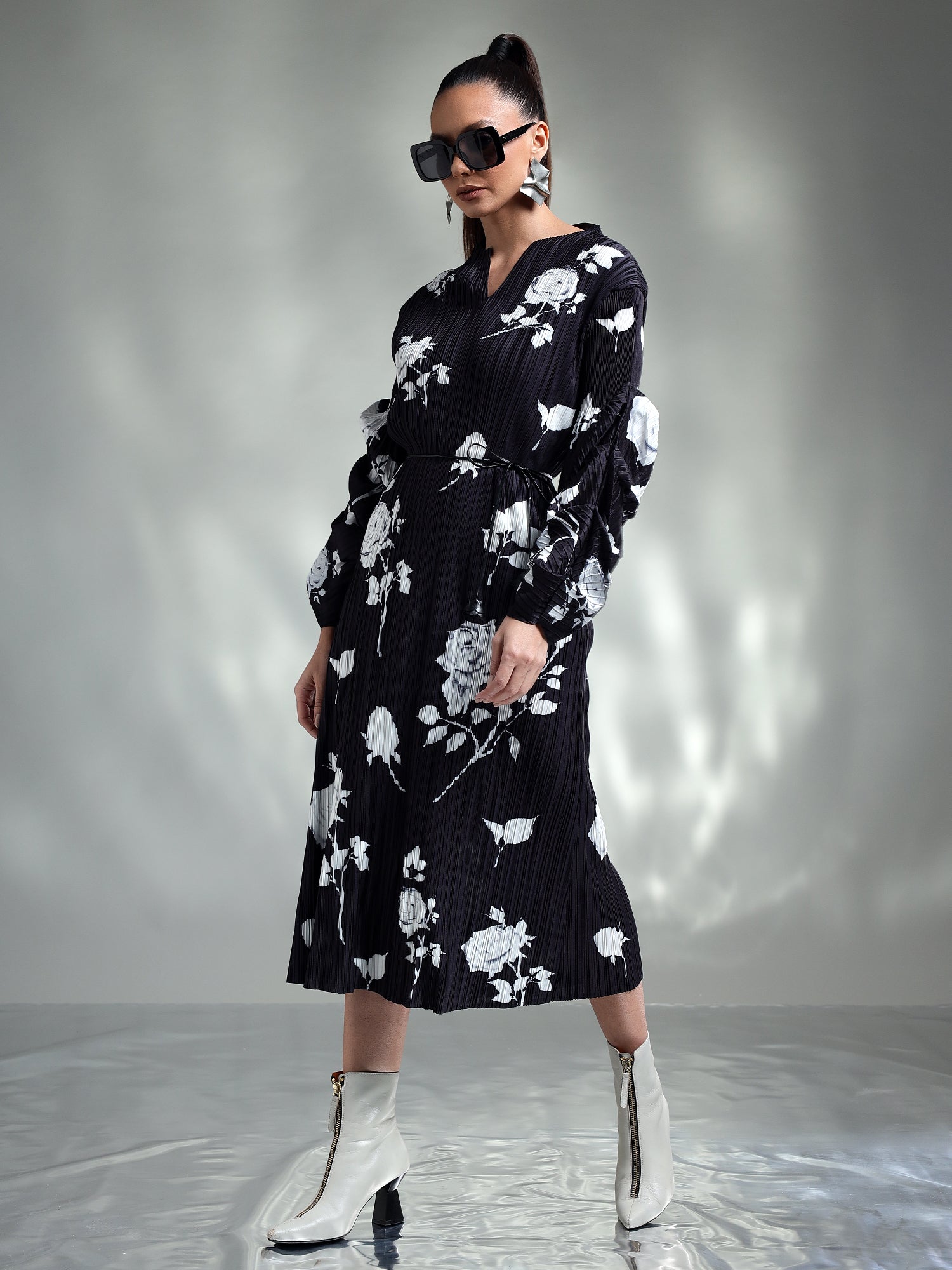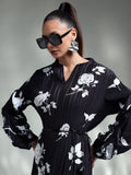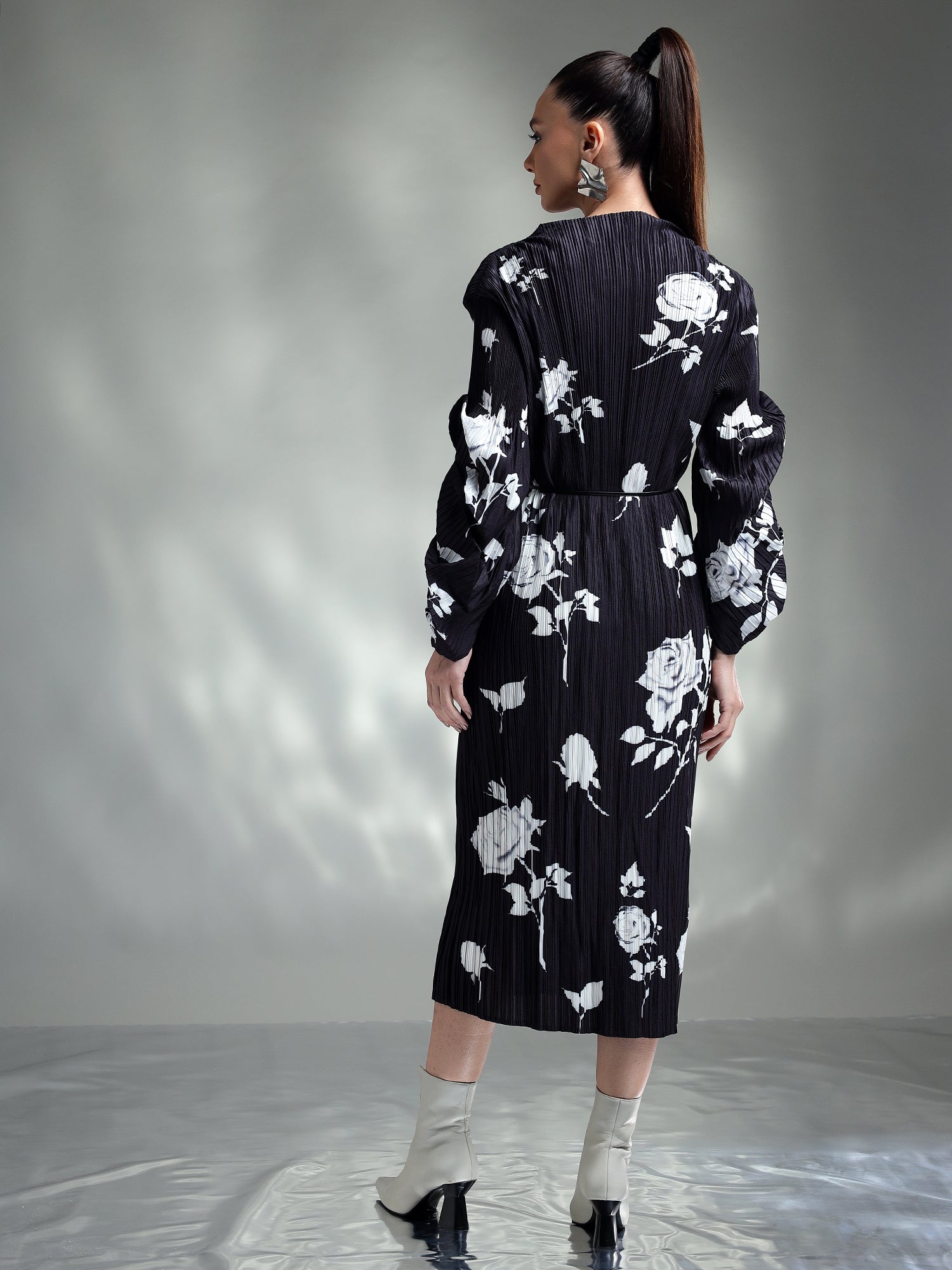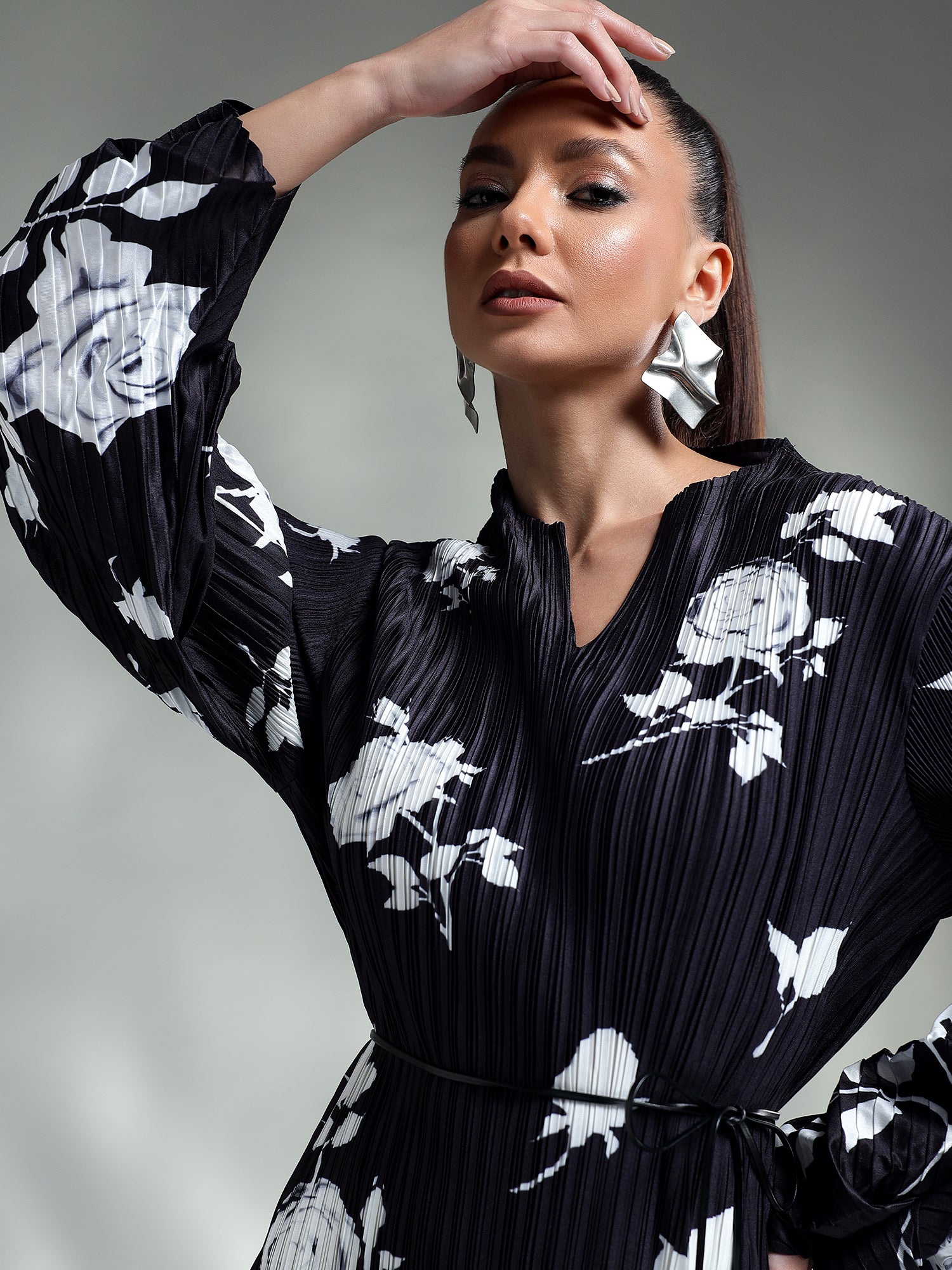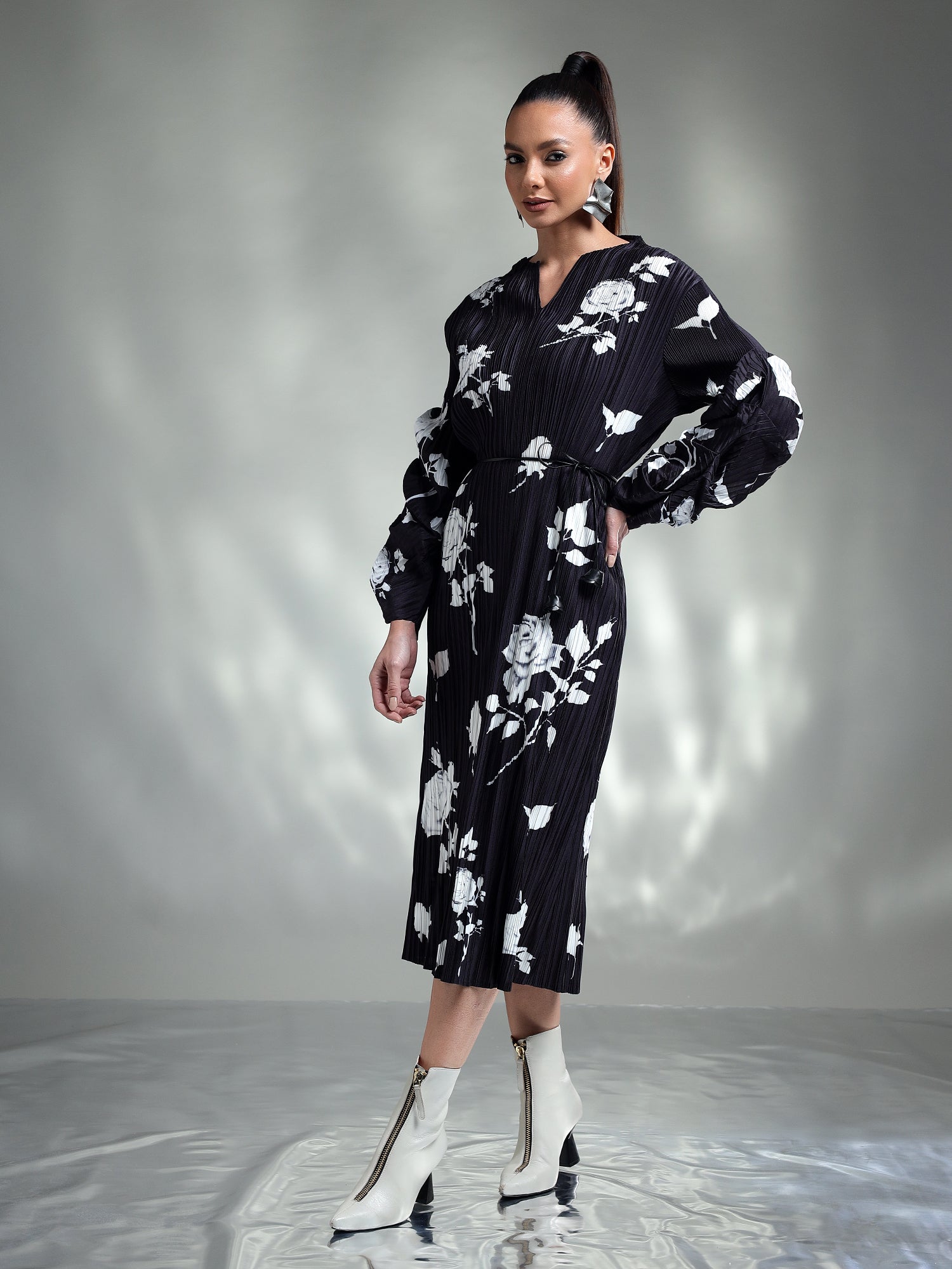 Step into timeless sophistication with the Alira Dress. Designed in a sleek black base adorned with bold floral prints, this midi dress exudes modern elegance. Featuring a flattering V-neckline, cinched waist with a tie-up belt, and full-length sleeves, it’s the perfect blend of comfort and chic style.