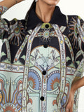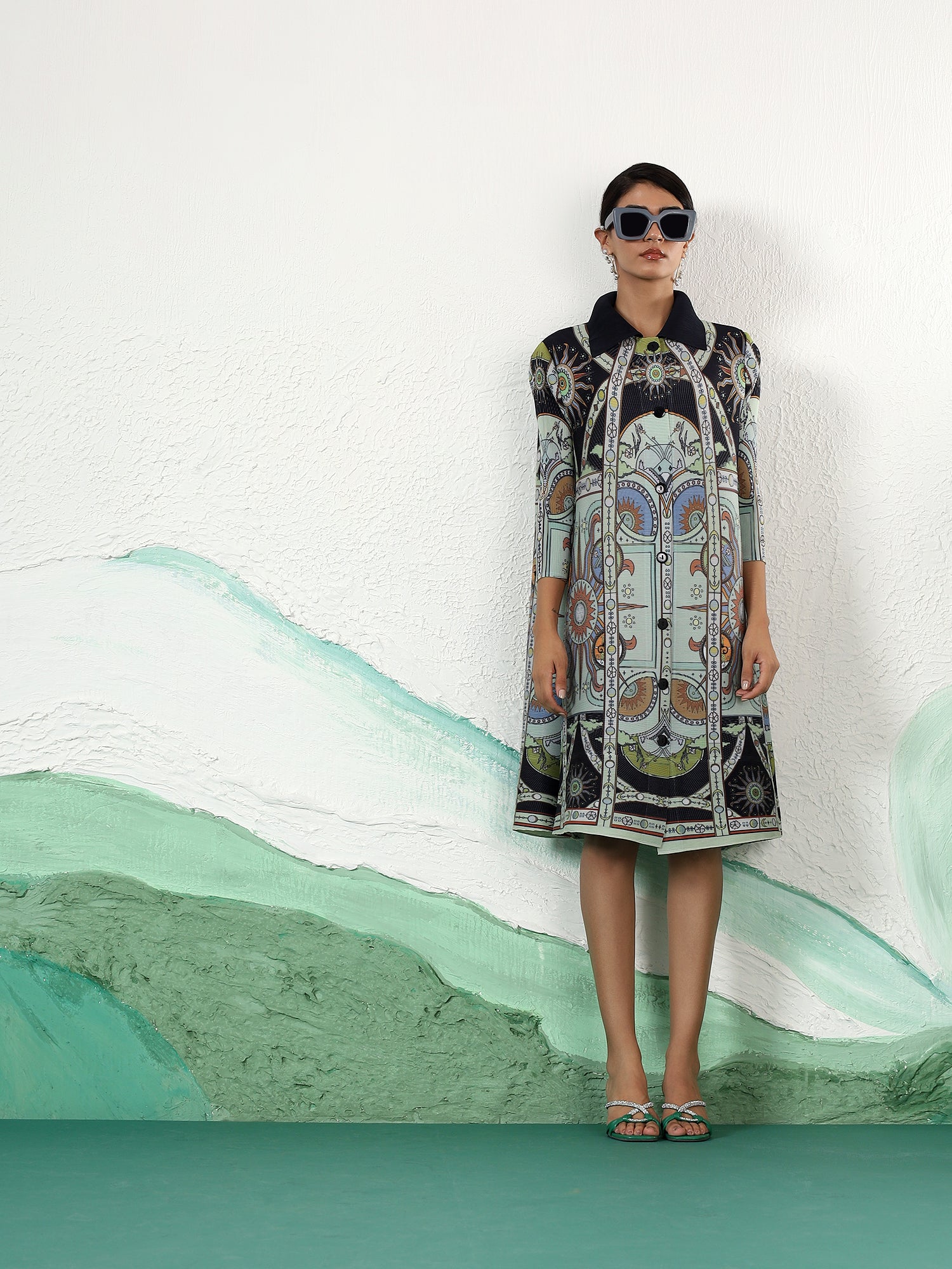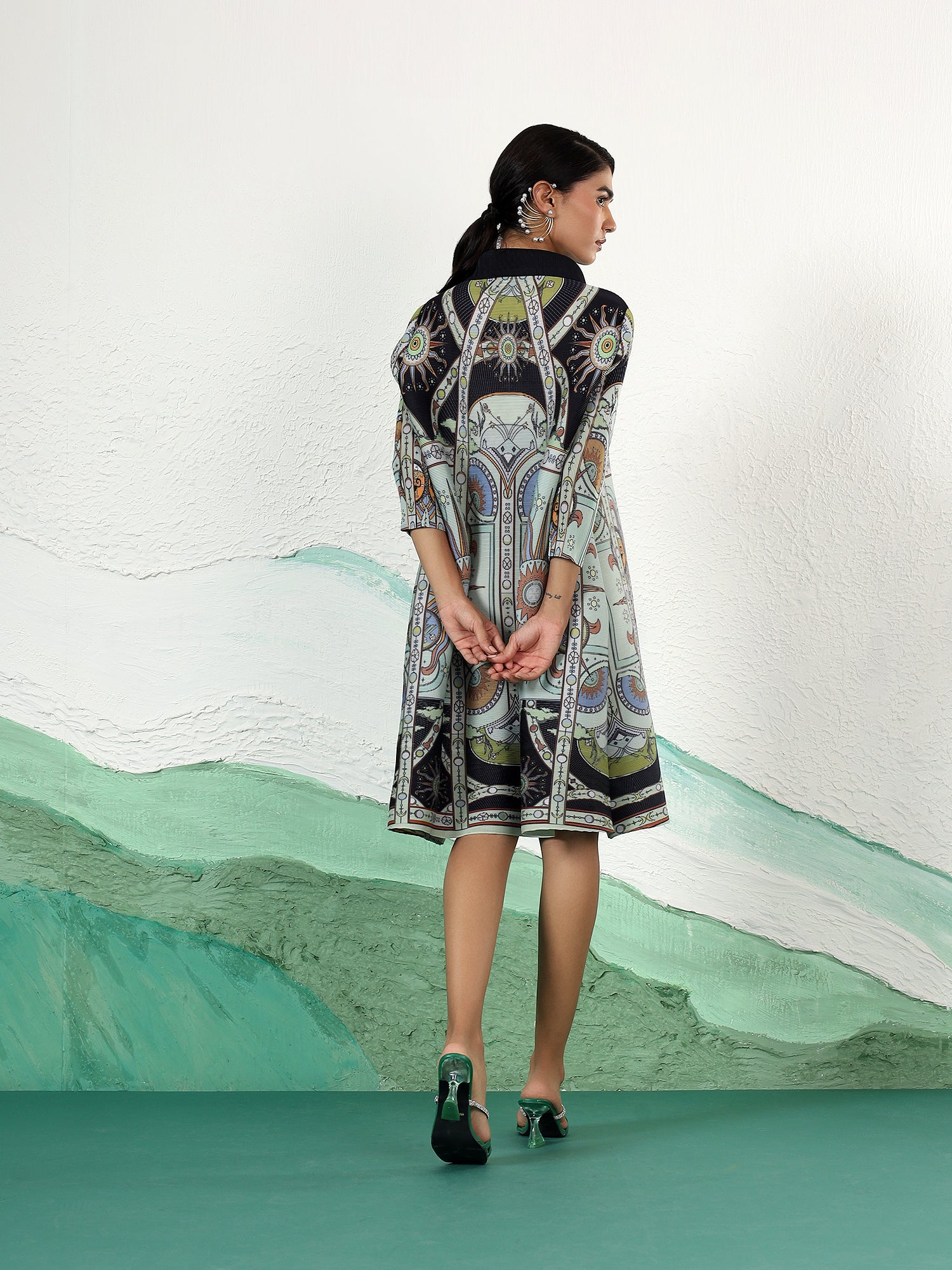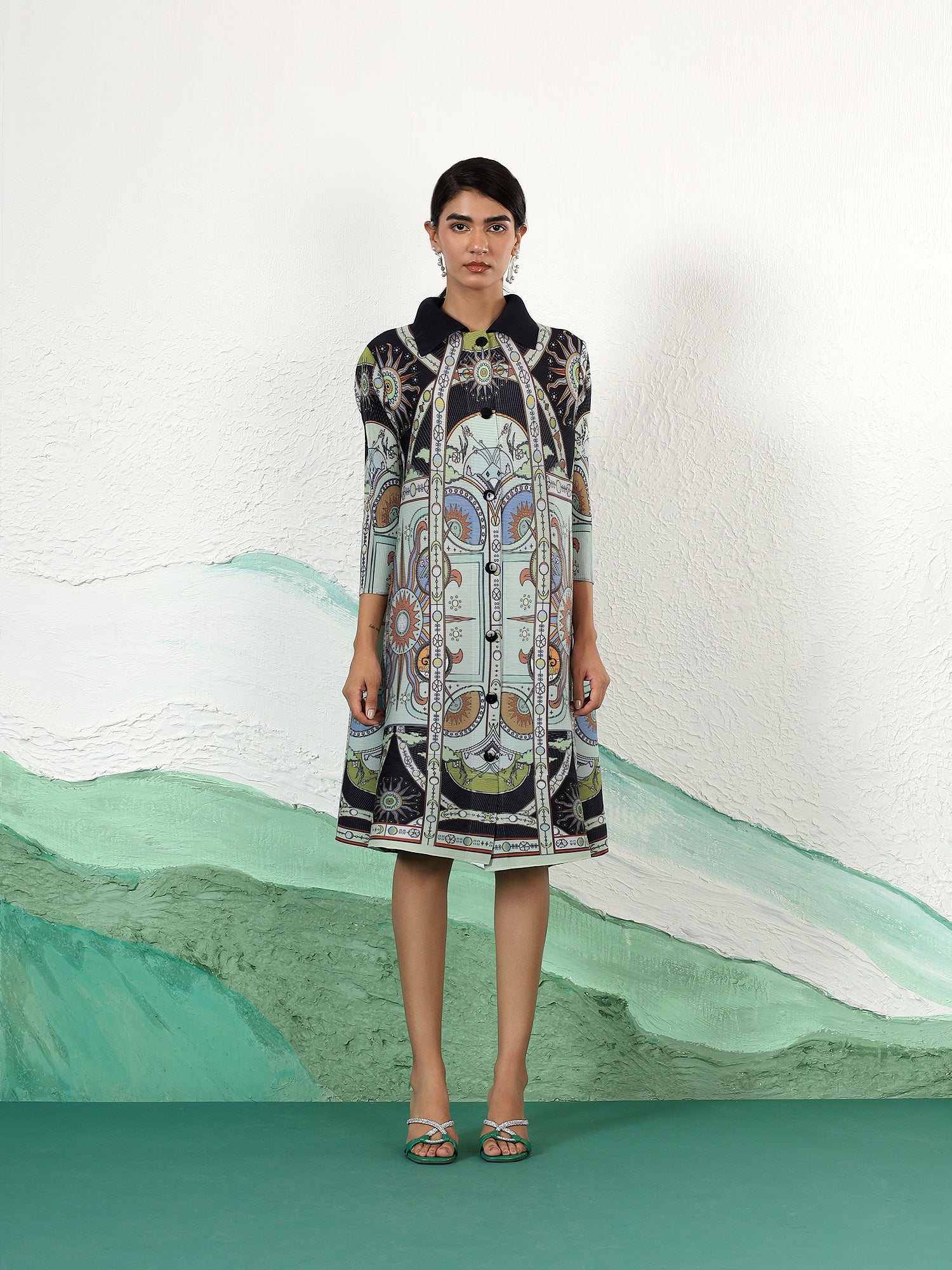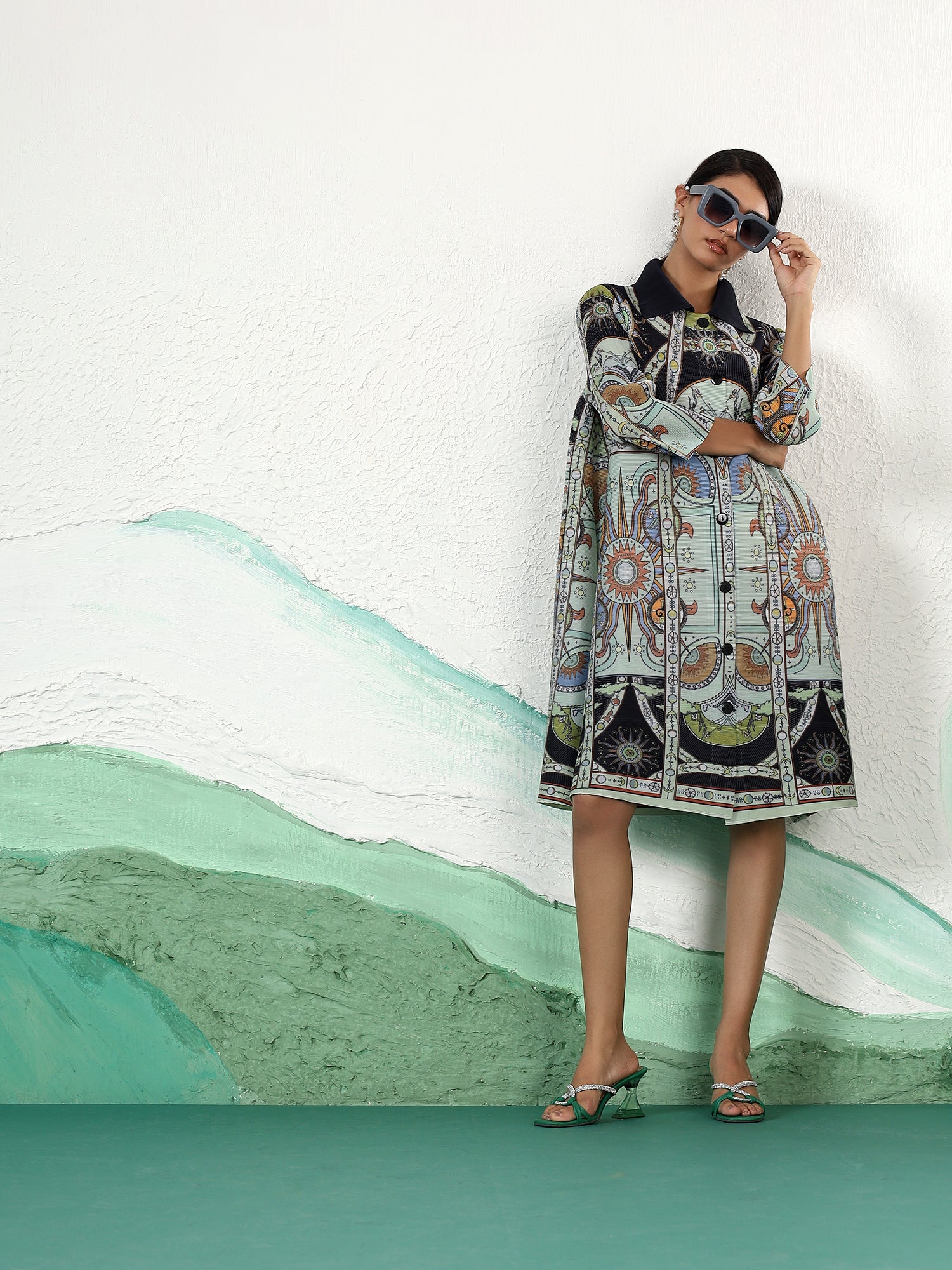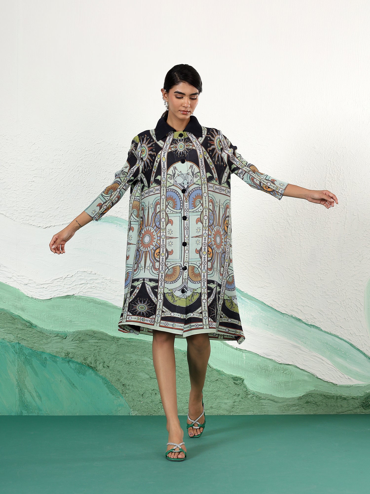 Step into a cosmic daydream with our Astranova Shirt Dress — a statement piece inspired by celestial maps and astral energy. Crafted in soft pleated fabric, this collared shirt dress features intricate sunburst and galaxy motifs in a rich blend of navy, sage, and sunset hues. The relaxed silhouette offers both comfort and flair, making it perfect for brunches, holidays, or a standout casual day out.