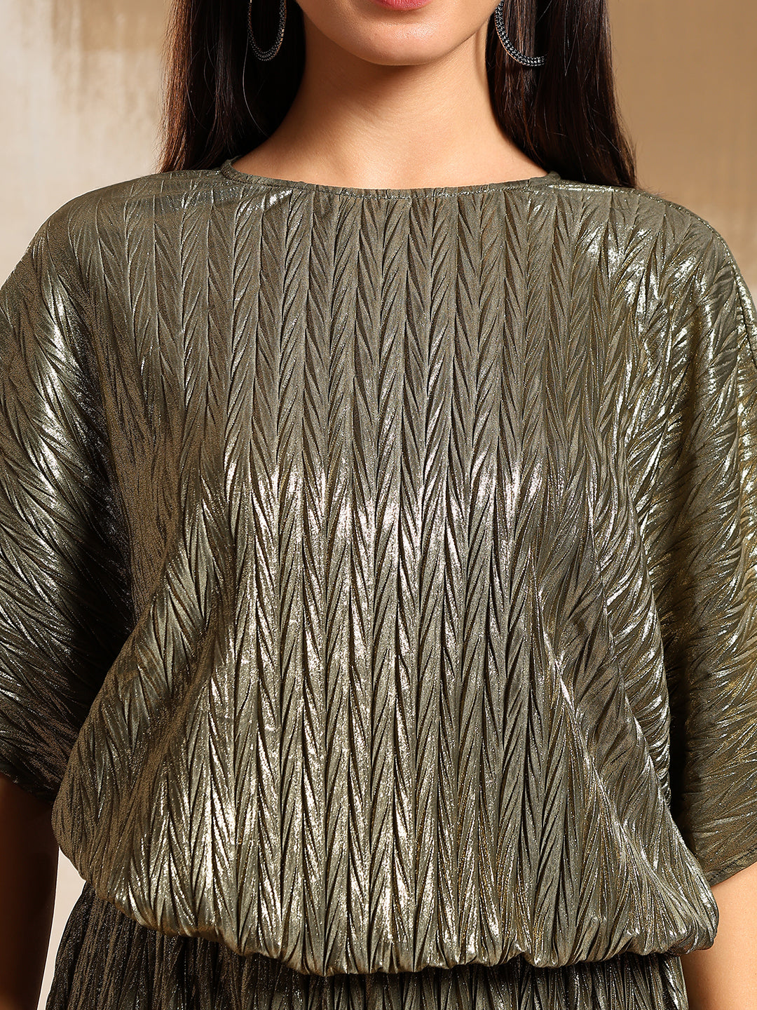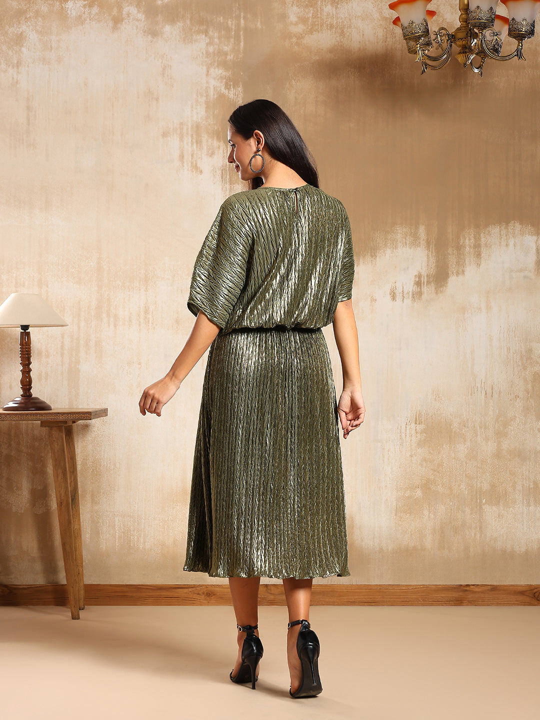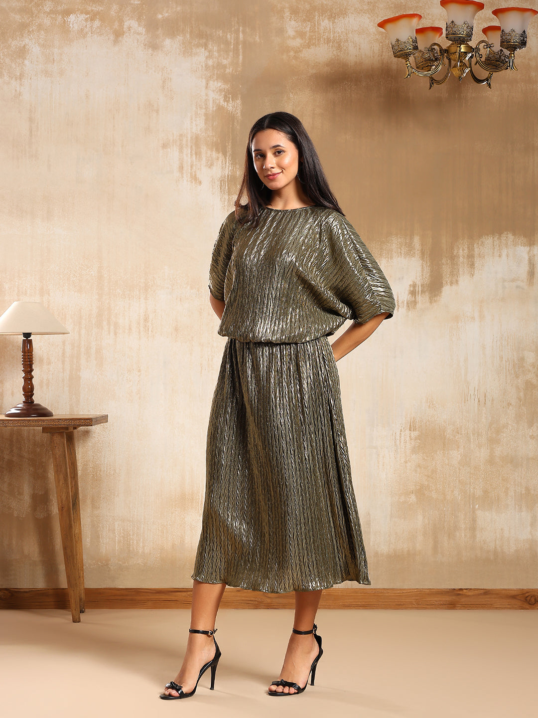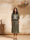 The Aurea Metallic Dress is where effortless glamour meets modern ease. Crafted in a soft metallic pleated knit, this olive-gold dress shimmers subtly with every movement. The relaxed silhouette features a round neckline, dolman sleeves, and an elasticated waist for a comfortable, flattering fit.