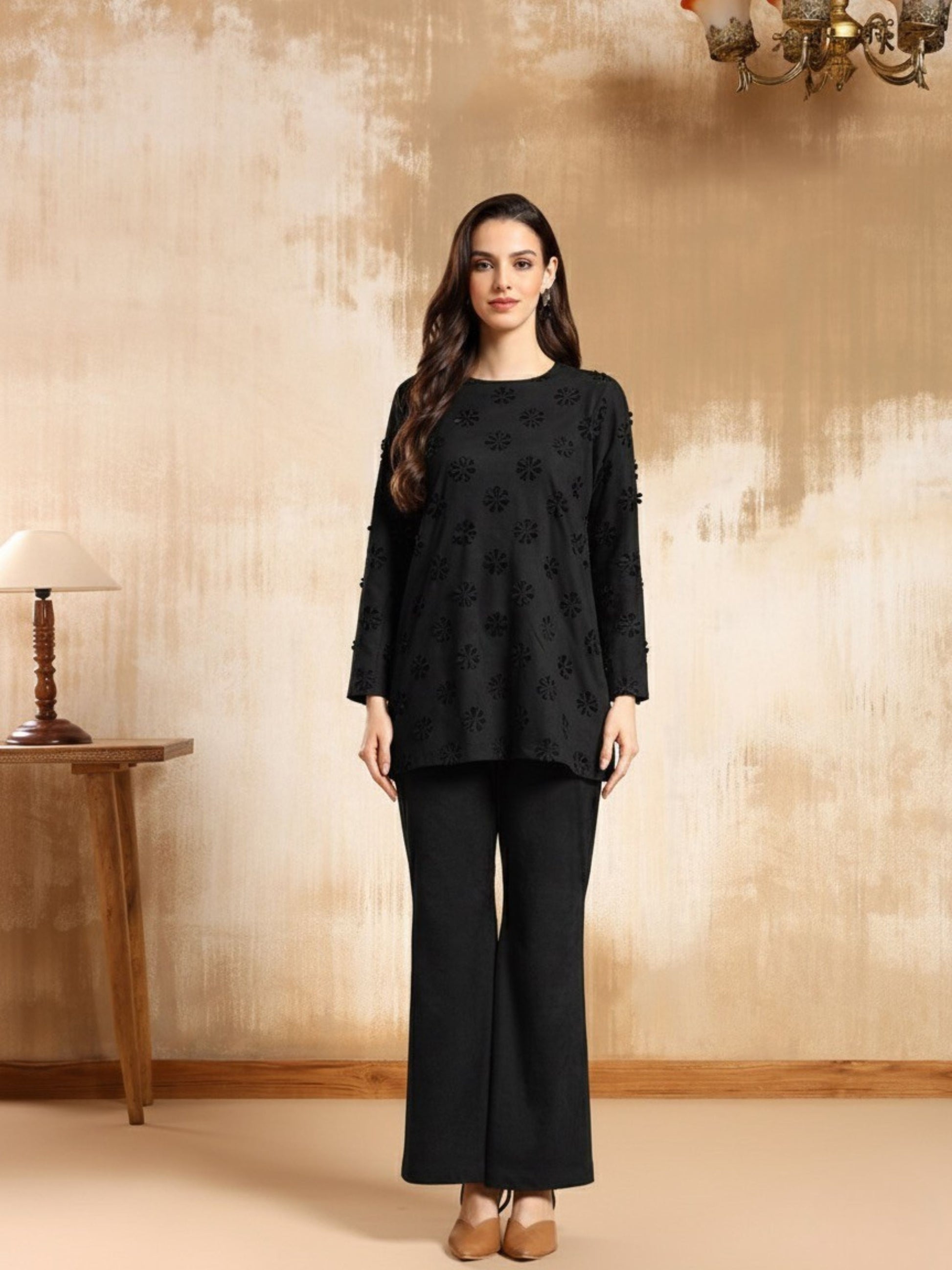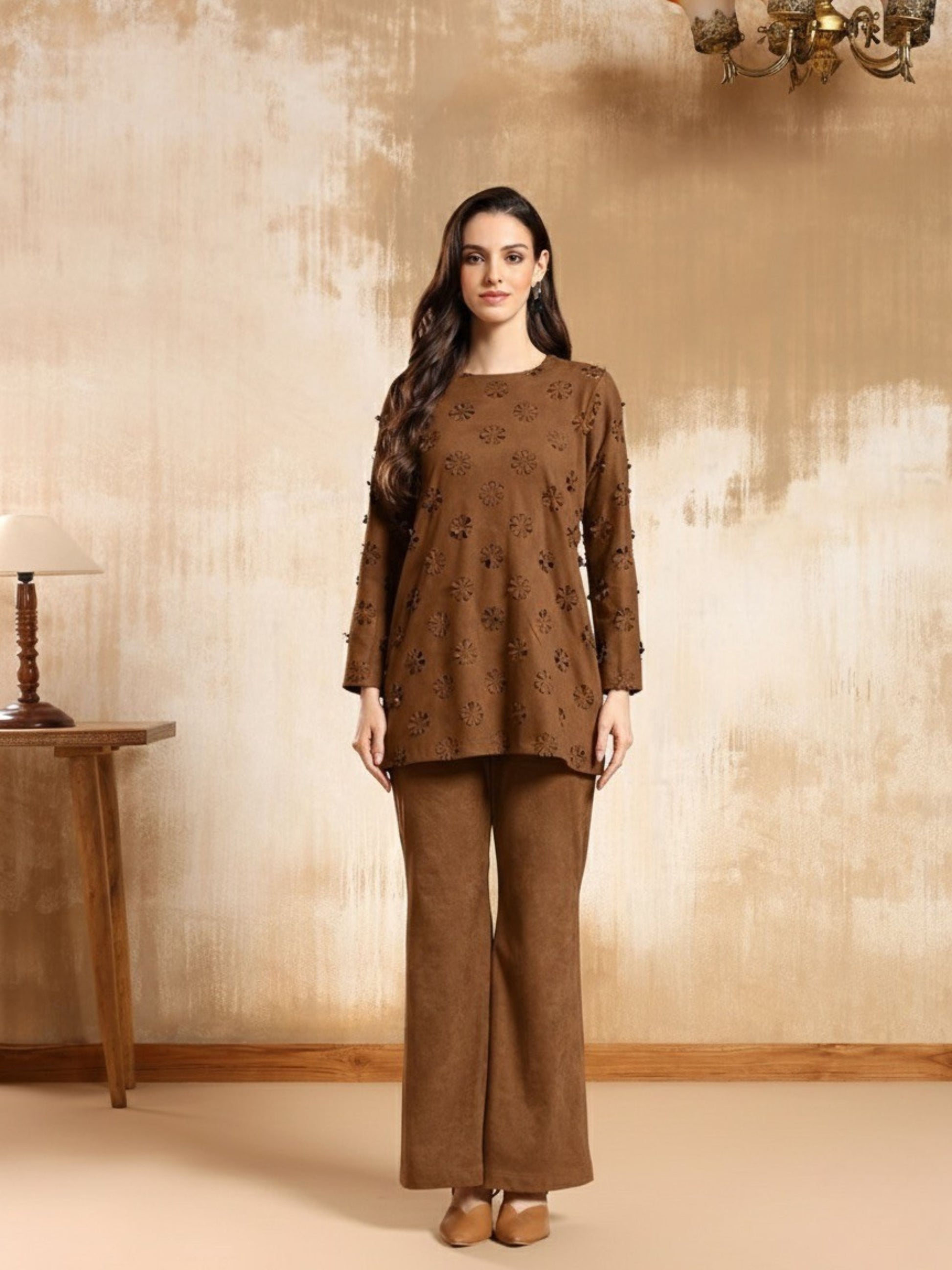 Elevate your everyday elegance with our Rylin Floral Set, a beautifully detailed outfit crafted from soft, suede-like fabric in a warm beige tone. The long tunic features intricate laser-cut floral motifs that add a touch of feminine charm and modern artistry. Paired with comfortable straight-fit pants that offer a flattering silhouette, this set combines style and ease effortlessly.