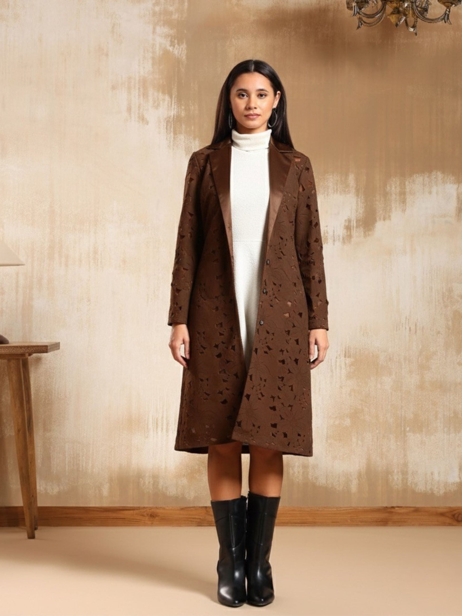 Exude timeless sophistication with this structured longline coat, designed to elevate your winter wardrobe. The tailored silhouette features a sleek front closure, accentuating the waist while maintaining an effortlessly refined look. Subtle detailing and clean lines create a perfect balance of modern minimalism and classic charm. Whether layered over a dress or styled with trousers, this piece adds a touch of understated luxury to any ensemble.