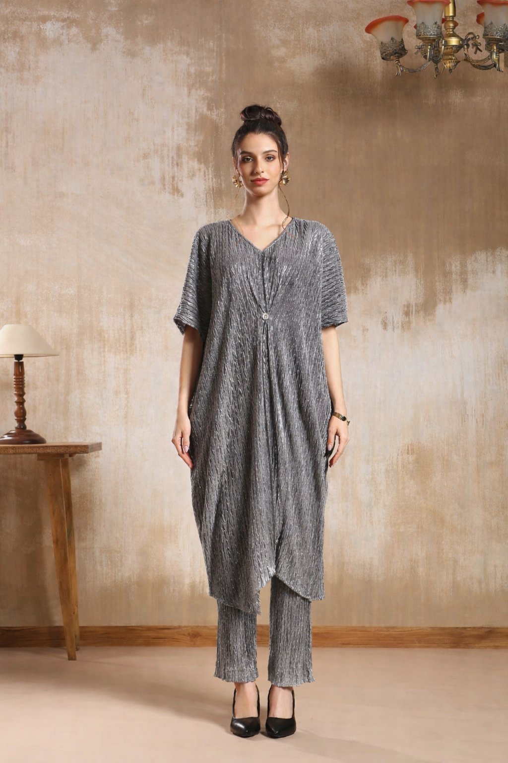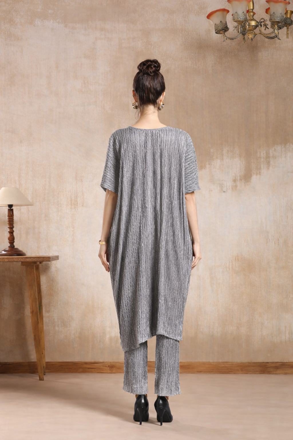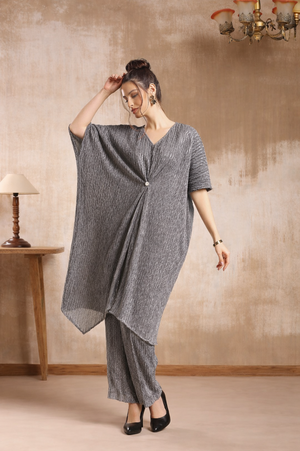 The Essence luxe Set brings effortless sophistication to your wardrobe. Designed in soft pleated fabric, this co-ord features a relaxed sleeveless top paired with fluid wide-leg bottoms, creating a look that moves with grace. Minimal yet striking, it blends comfort with modern elegance perfect for evenings out, travel days, or elevated everyday style.