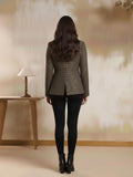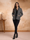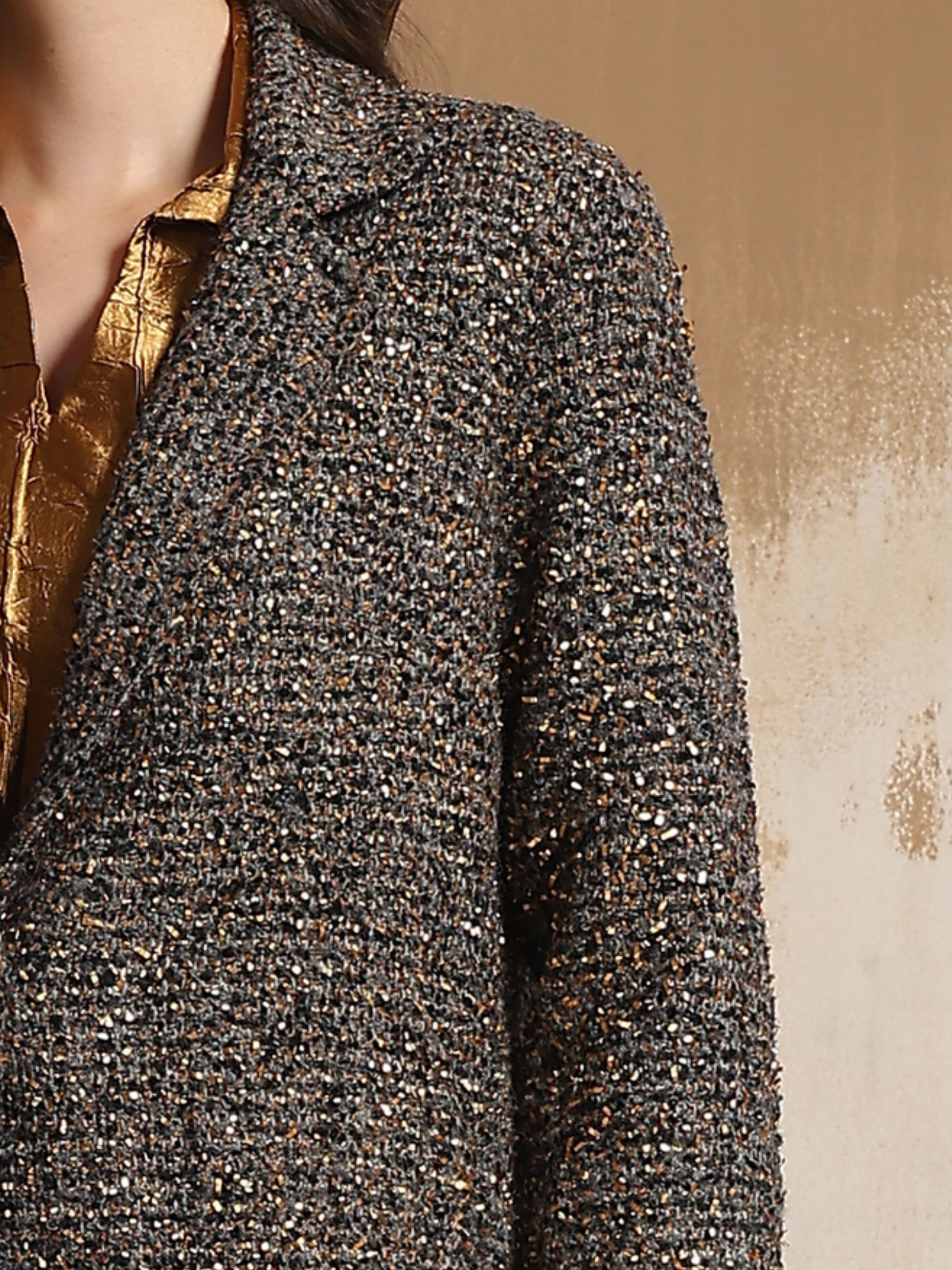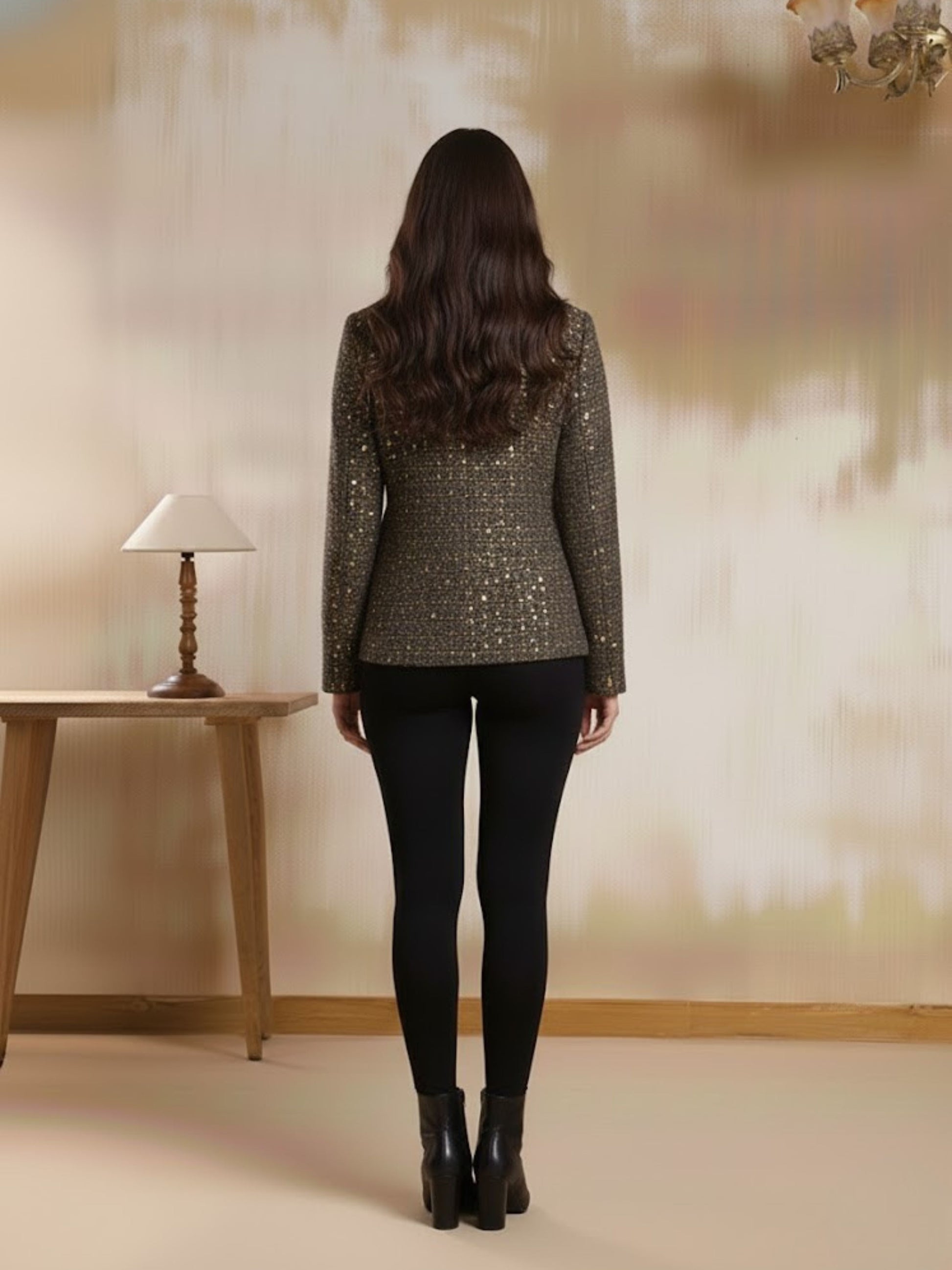 Step into refined winter glamour with this chic textured blazer set. The look features a statement tweed blazer embellished with subtle gold accents, adding a touch of festive sparkle without overpowering the outfit. Layered over a plush, velvety top in a rich caramel hue, it brings warmth, depth, and effortless sophistication.