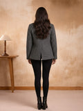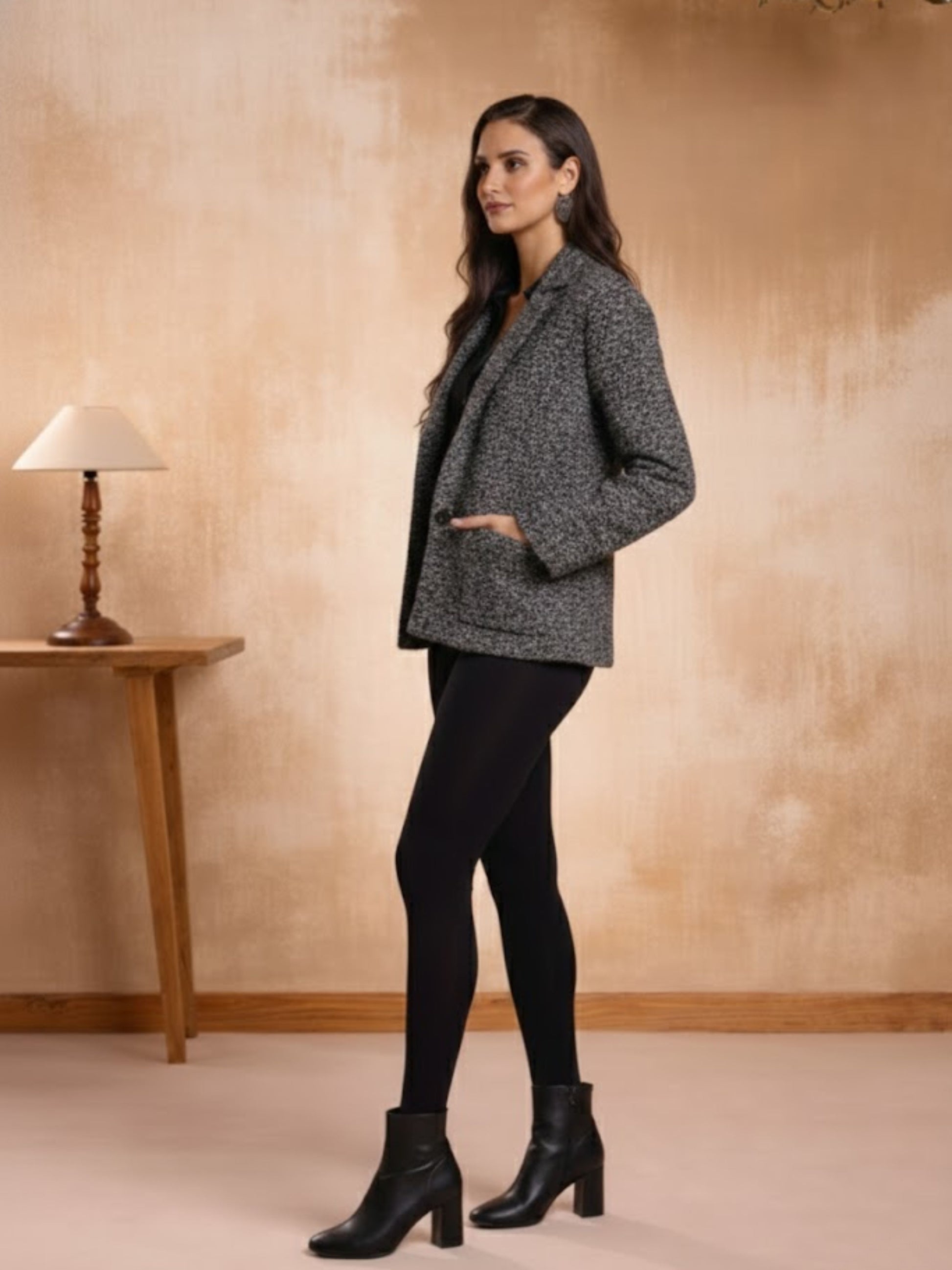 Paired with sleek black fitted bottoms and classic heeled boots, this ensemble strikes the perfect balance between polished and modern. Ideal for evening gatherings, work events, or winter outings, this look blends comfort, luxury, and timeless style in one elegant frame.