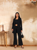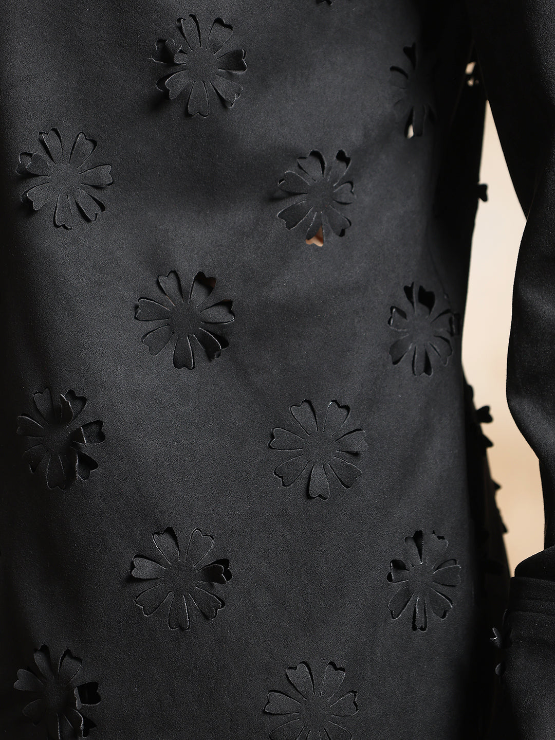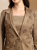 The Camila Suede Co-ord Set brings together texture and refinement in perfect balance. Crafted in soft, warm beige suede, it features delicate laser-cut floral motifs along the shirt and cuffs. The relaxed-fit pants and fluid shirt silhouette make it both comfortable and chic- ideal for winter brunches, travel days, or casual evening plans.
