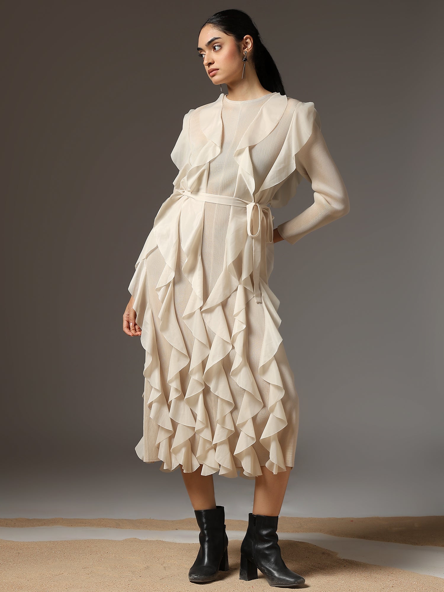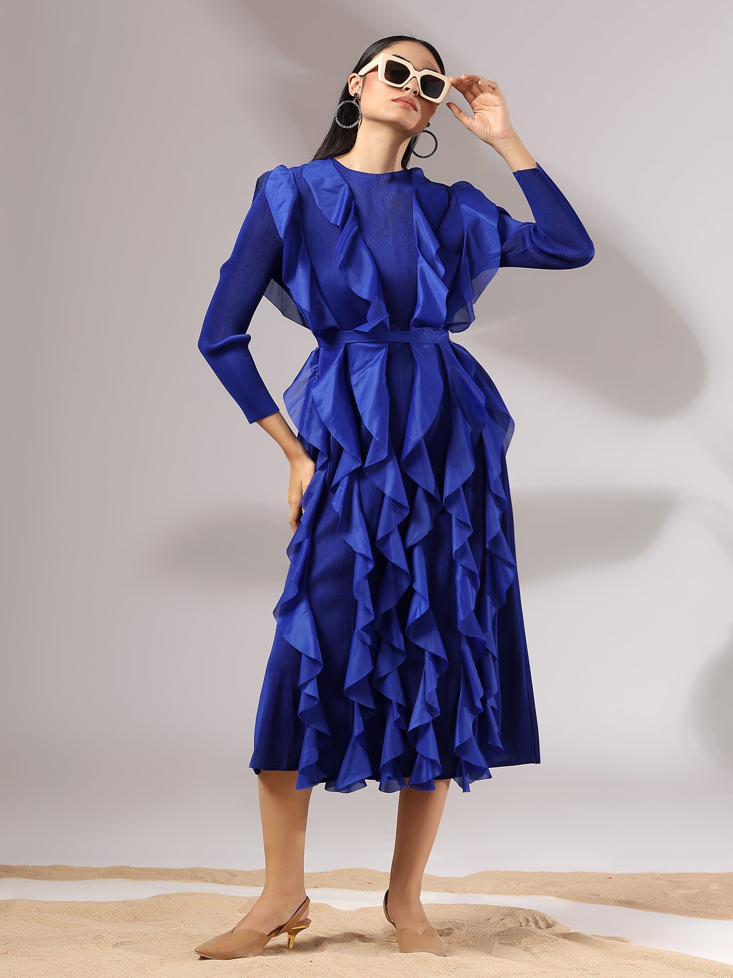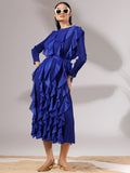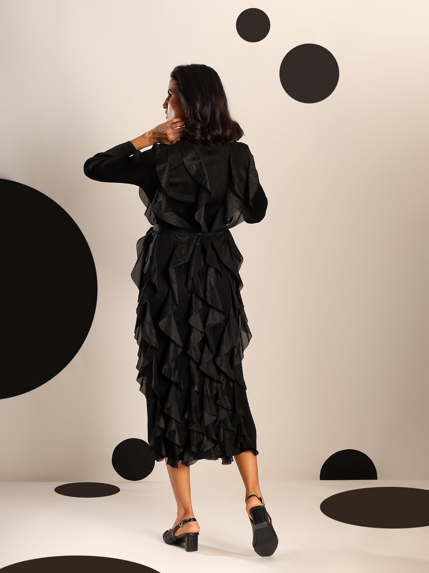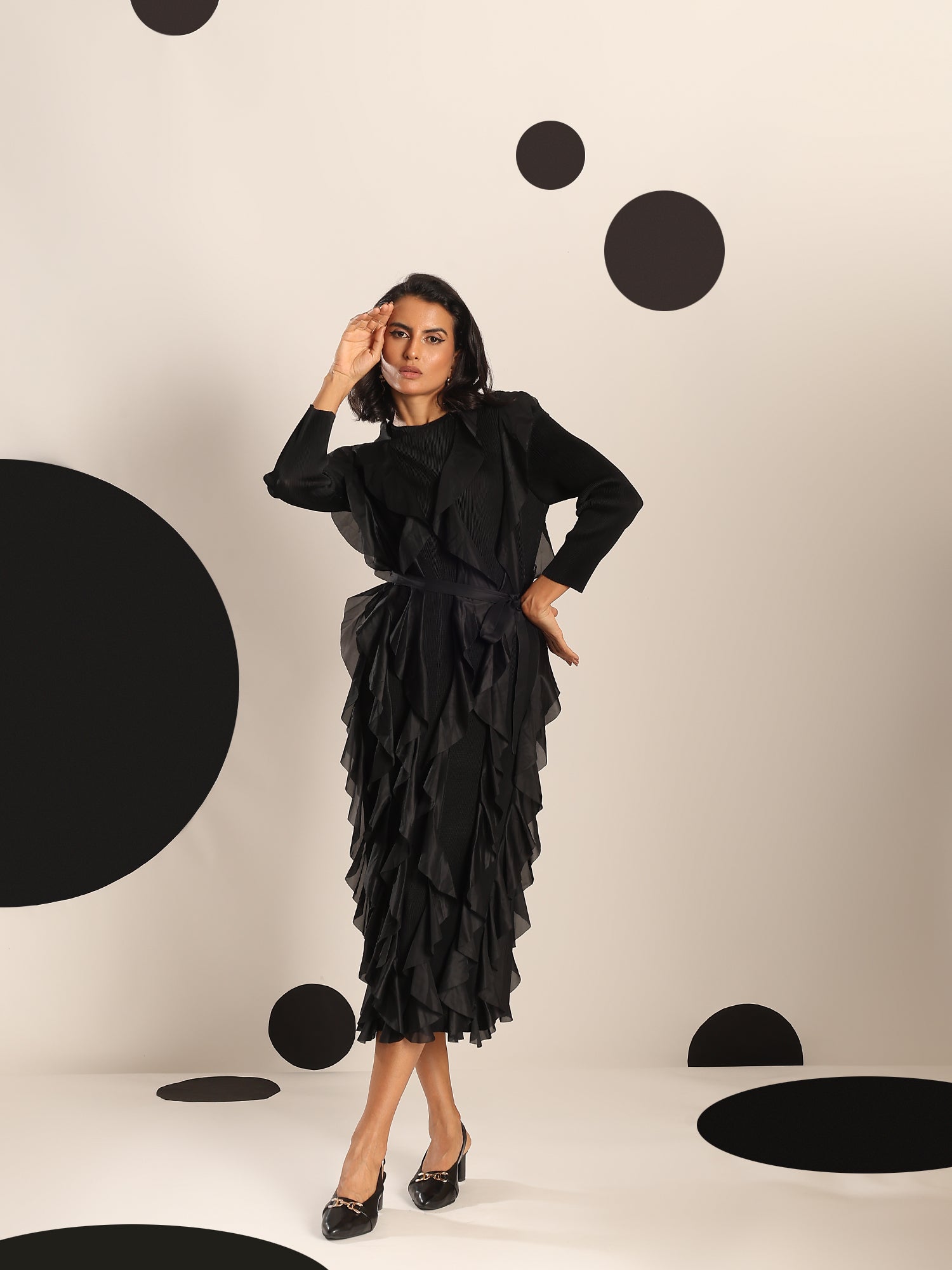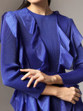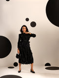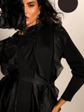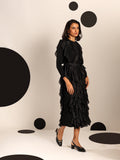 A celebration of movement and modern femininity, the Cascade Ruffle Dress is designed to captivate. With sculptural ruffle layers that flow effortlessly down the silhouette, this piece brings both volume and grace. The structured bodice and full sleeves balance the drama with sleek elegance.
