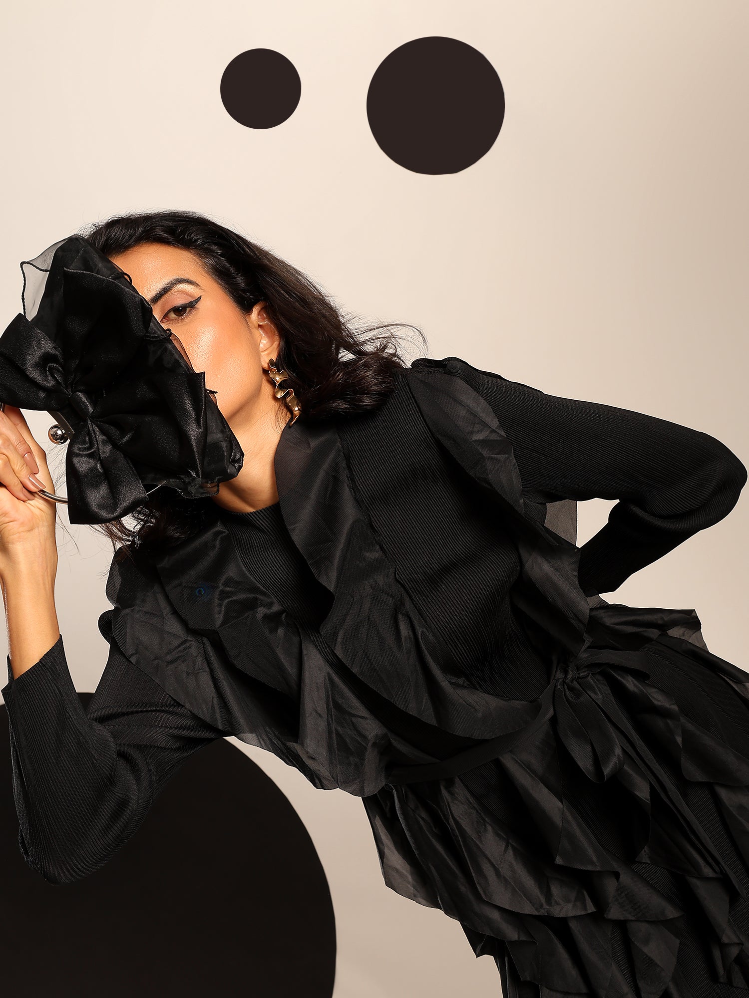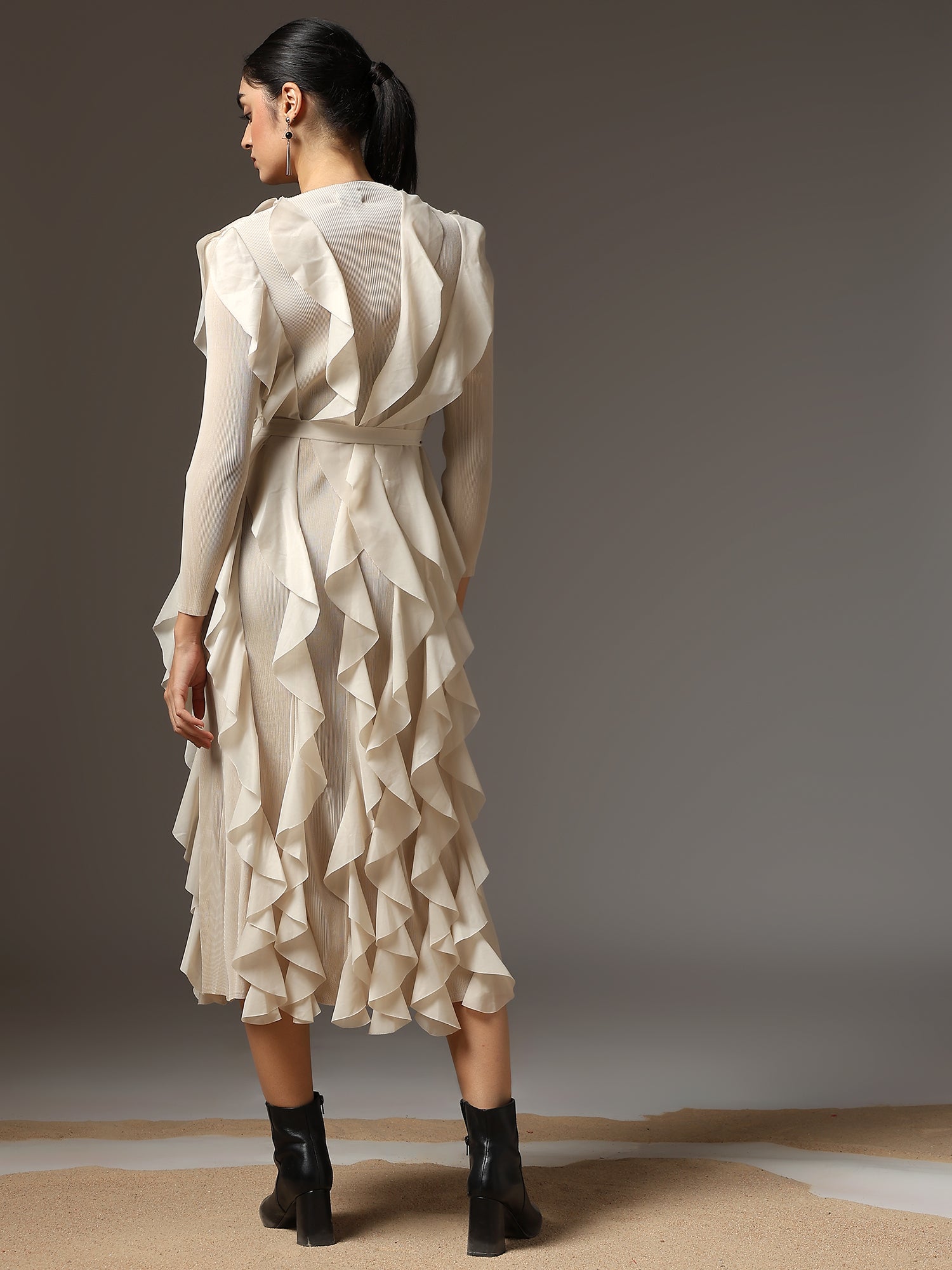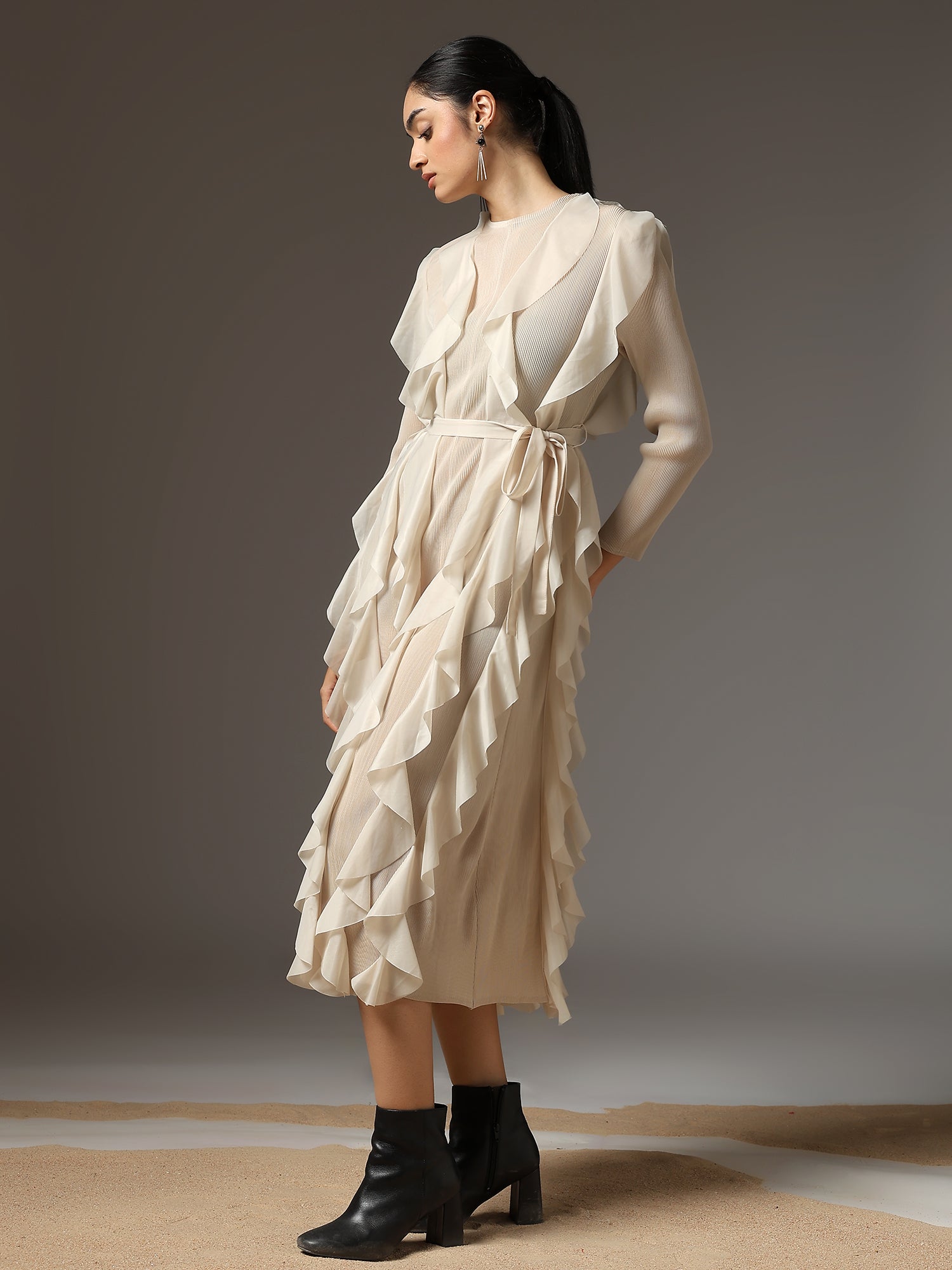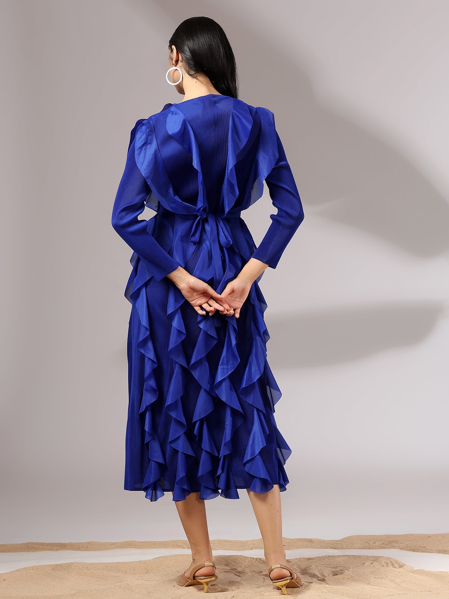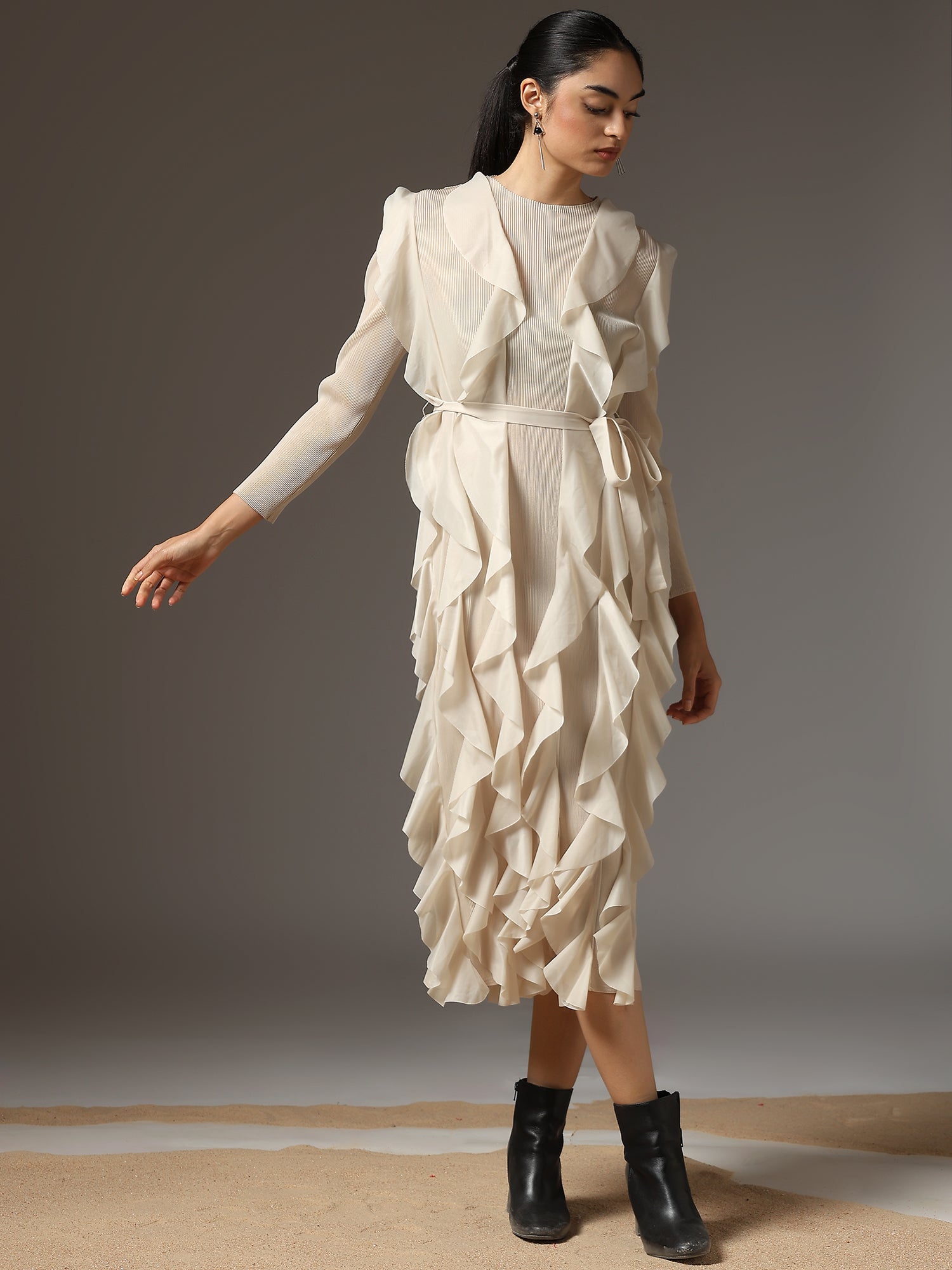 A celebration of movement and modern femininity, the Cascade Ruffle Dress is designed to captivate. With sculptural ruffle layers that flow effortlessly down the silhouette, this piece brings both volume and grace. The structured bodice and full sleeves balance the drama with sleek elegance.