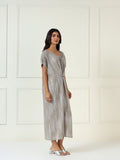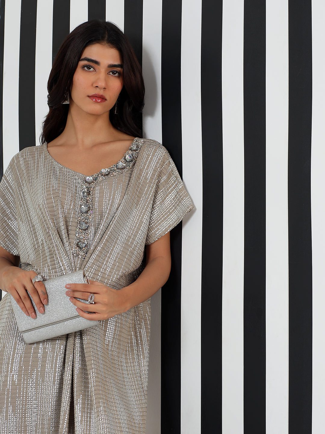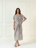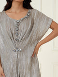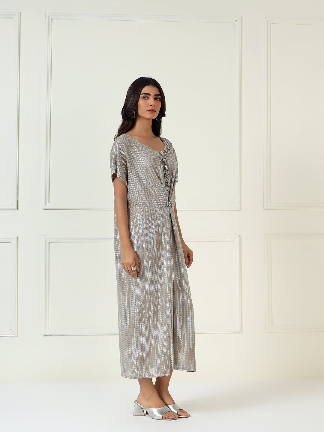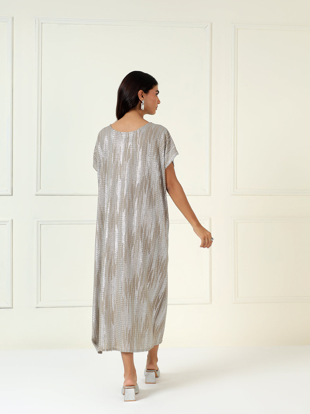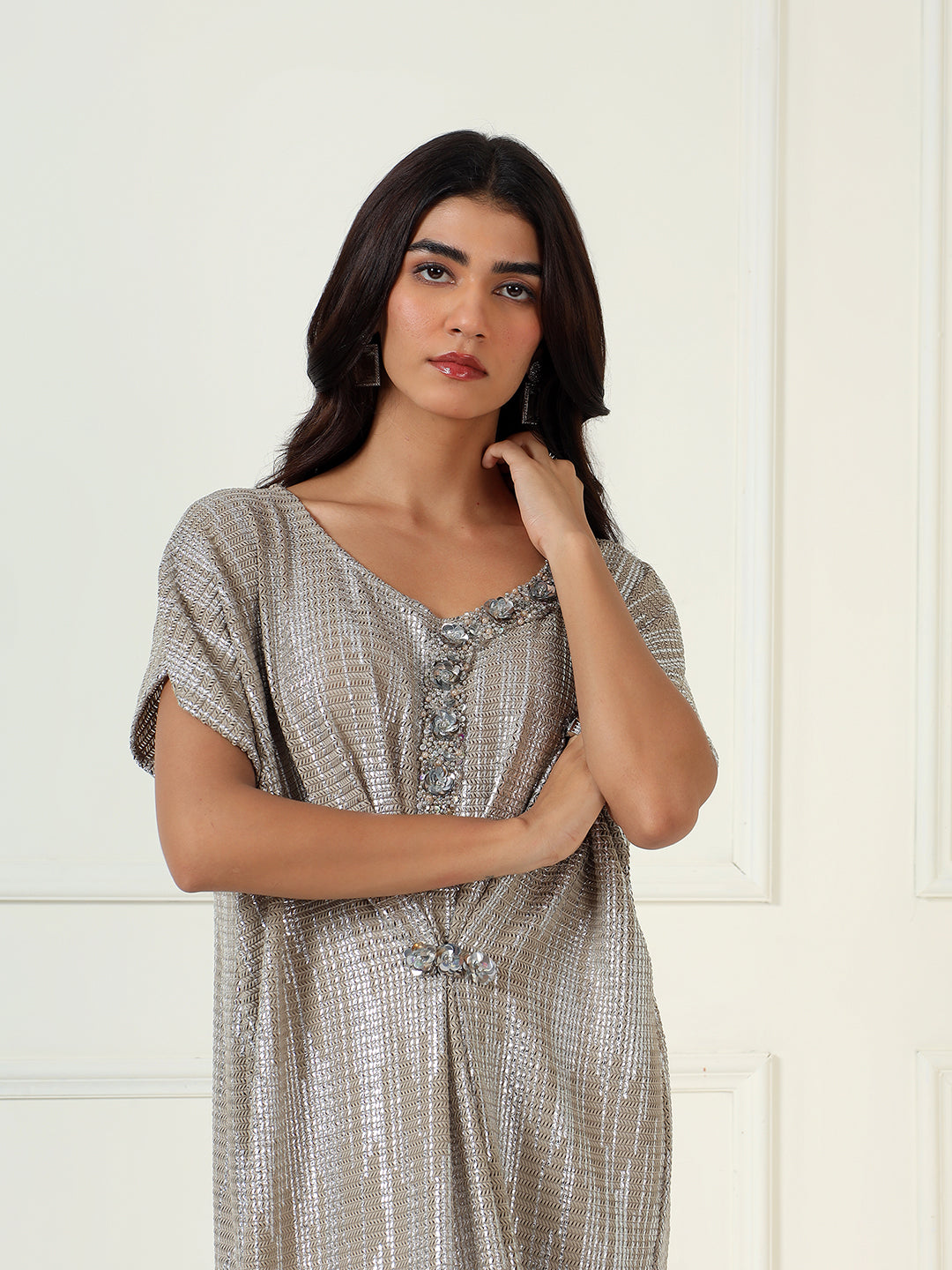 Drape yourself in understated glamour with the Celeste Metallic Kaftan Dress. Crafted in a gleaming silver fabric with a fluid silhouette, this dress features a gathered front detail and embellished neckline that adds a touch of luxe. Perfect for cocktail evenings, festive dinners, or modern celebrations, it’s an effortless statement piece that pairs beautifully with heels or metallic sandals.