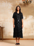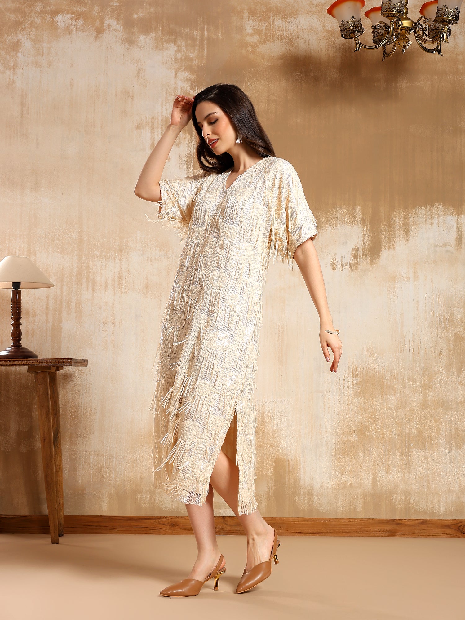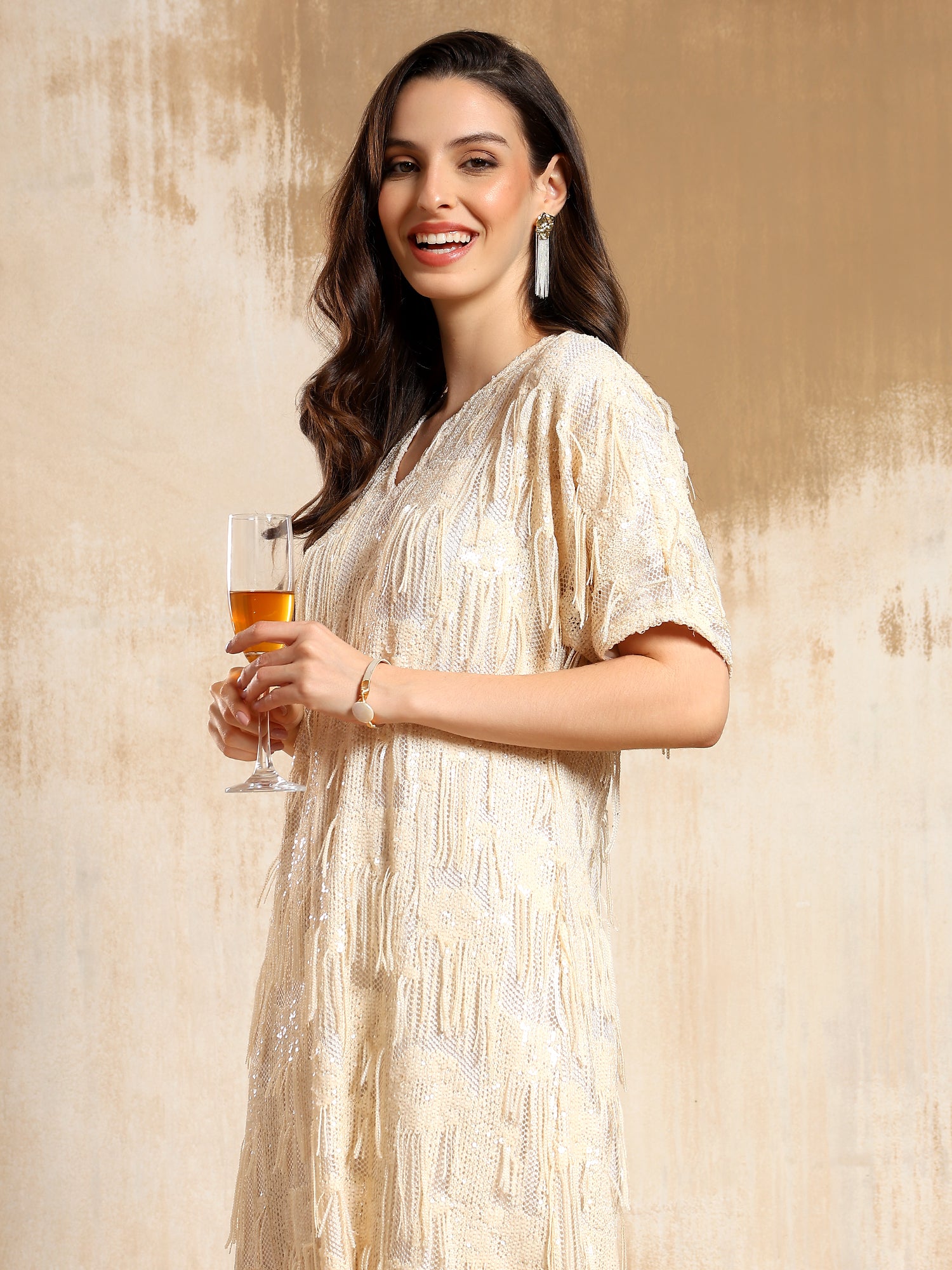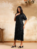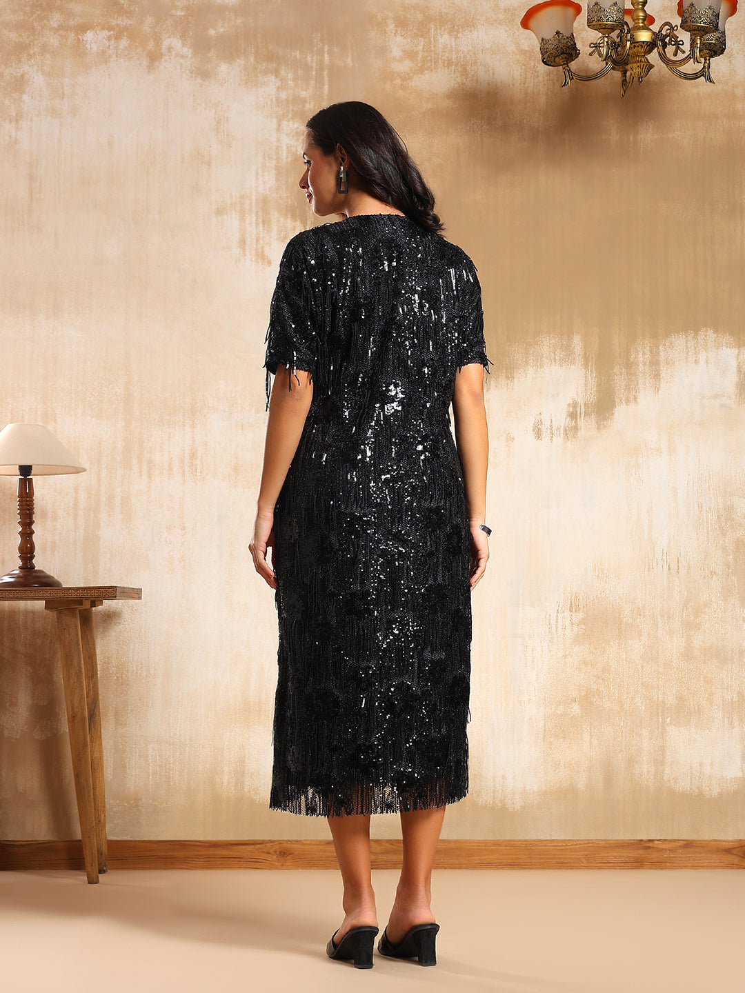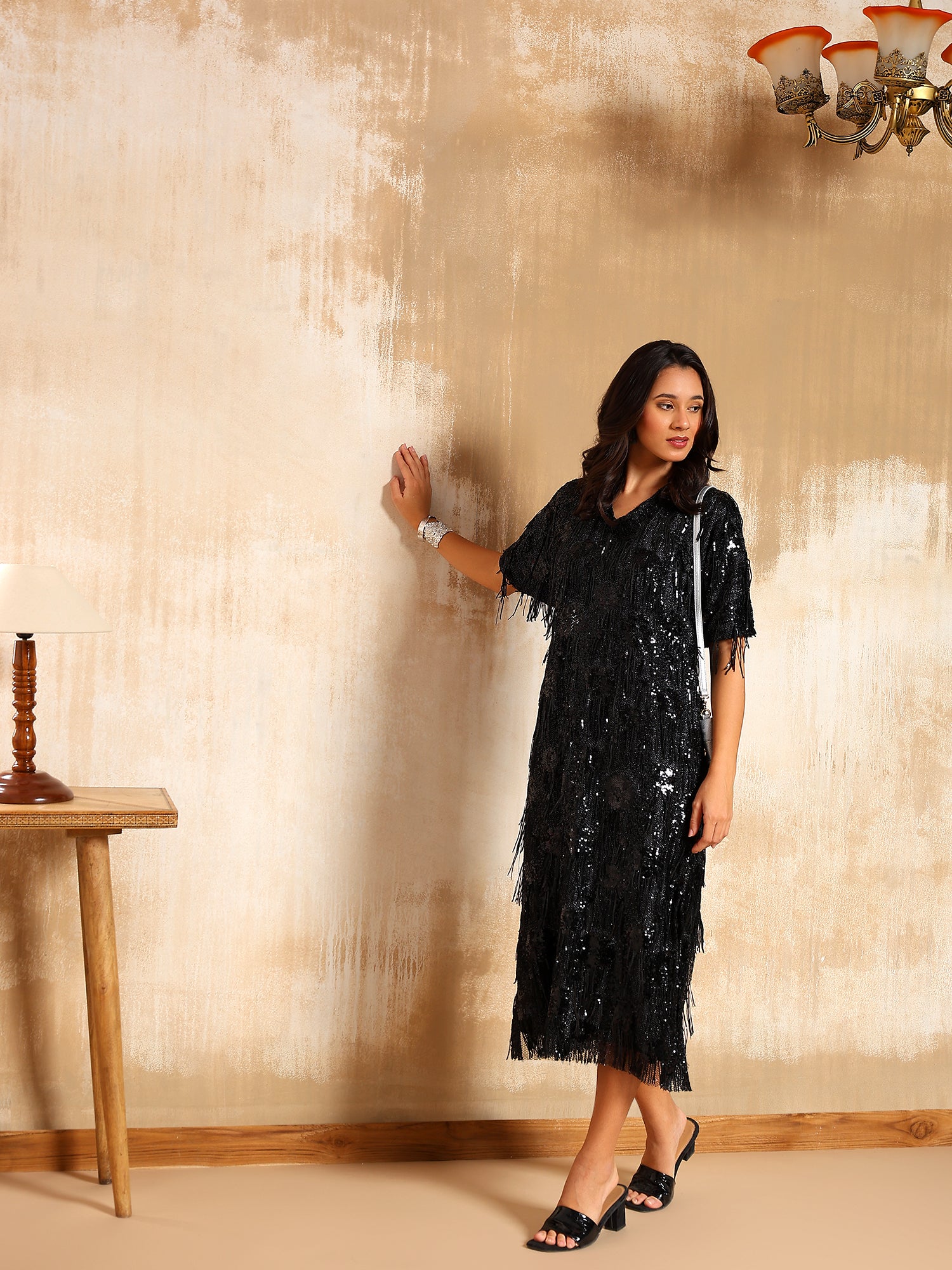 The Elen Luxe Dress is designed to make every moment feel special. Crafted with shimmering sequins and soft textured fringes, it moves beautifully with every step. Its relaxed silhouette, V-neckline, and side slit add effortless charm while keeping it comfortable for long hours. Perfect for cocktail nights, celebrations, and evening events—this dress brings sparkle, fluidity, and sophistication together.