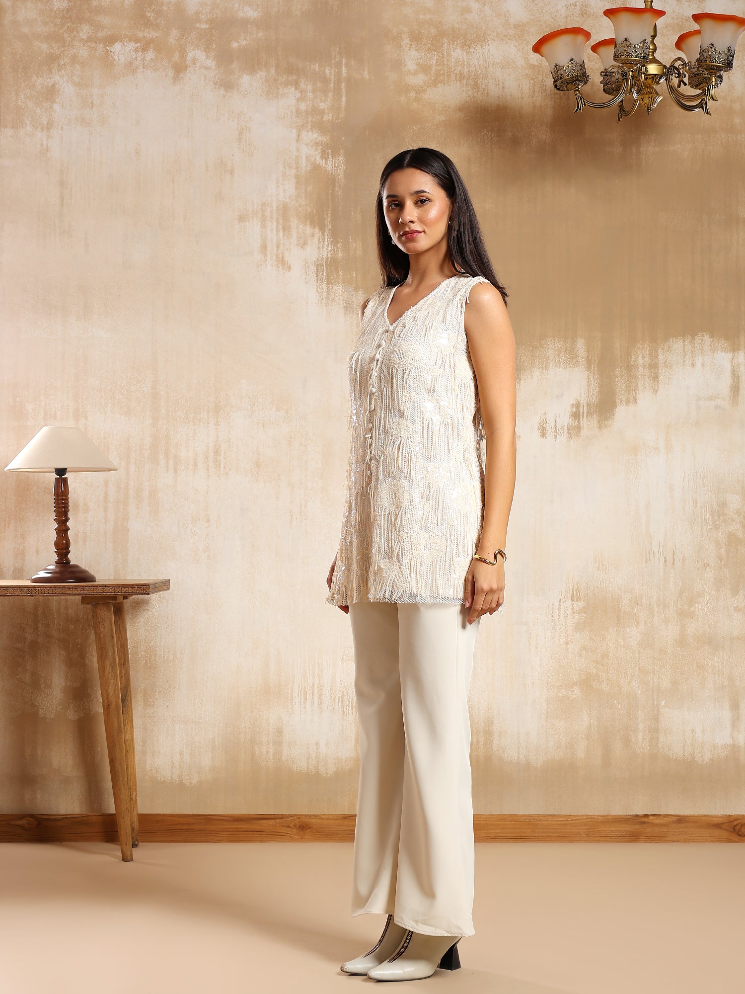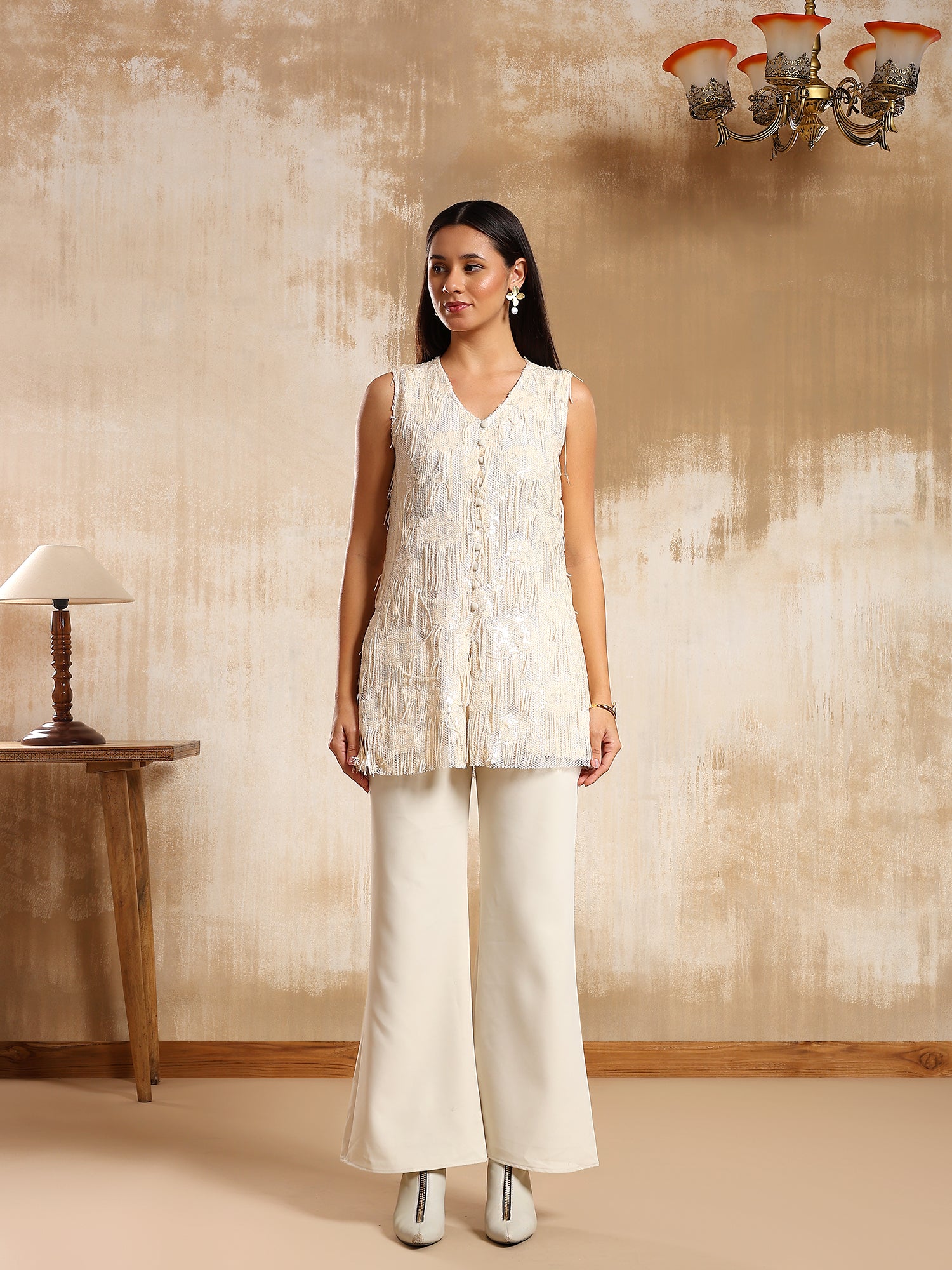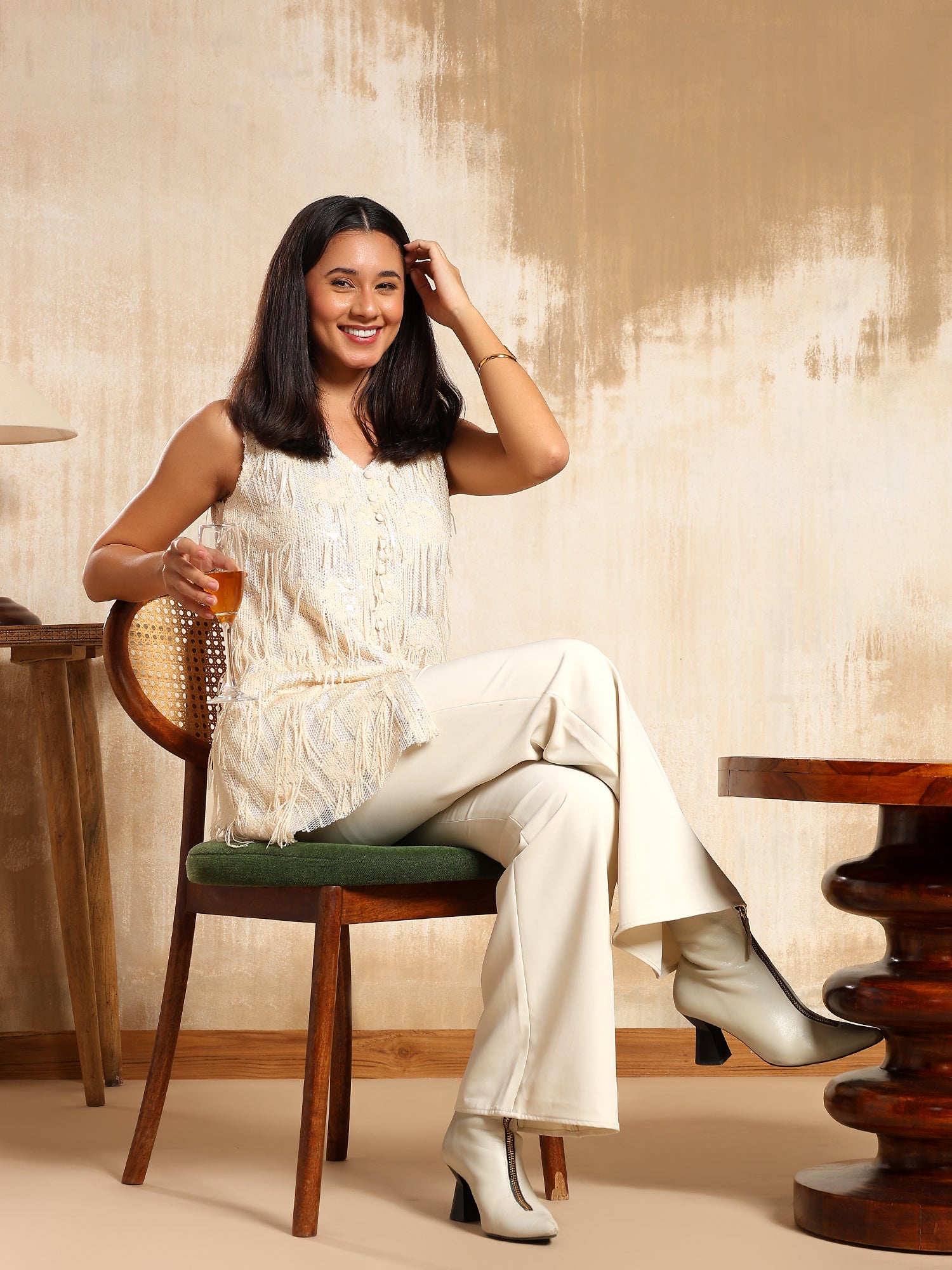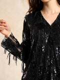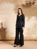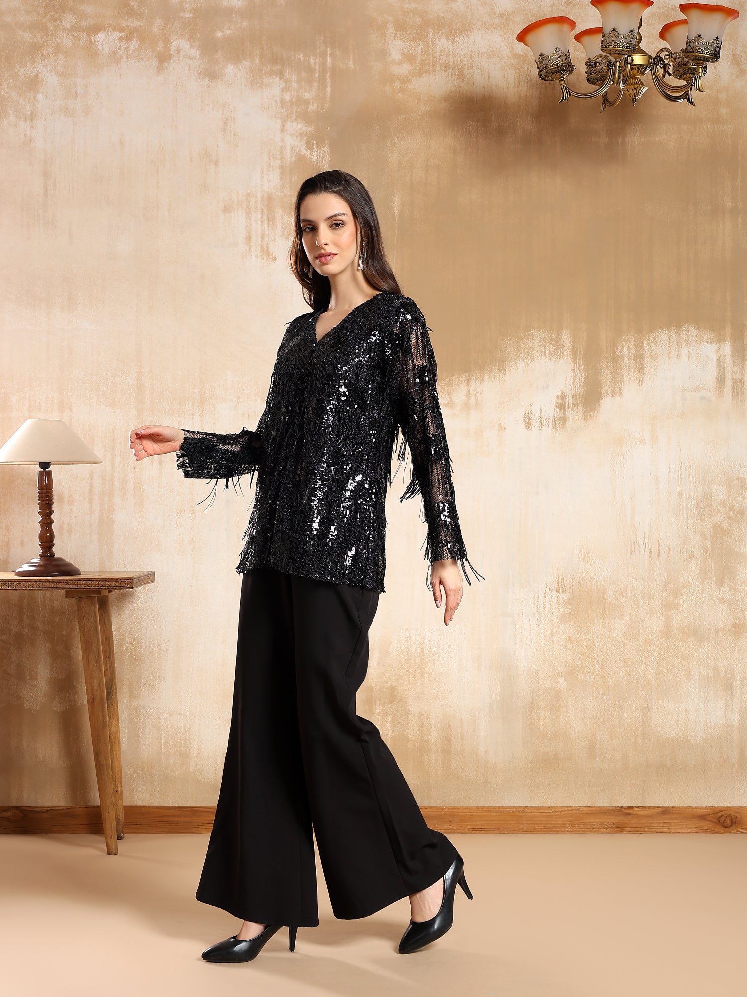 Dazzle through the night in this striking black sequin Elen Luxe Set. The top is adorned with intricate all-over sequin and fringe detailing that adds fluid movement and sparkle with every step. Designed with a soft inner lining for comfort, it pairs seamlessly with tailored black trousers, creating a look that’s both chic and effortlessly modern. Perfect for evening soirées, cocktail events, or festive nights out.