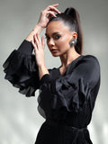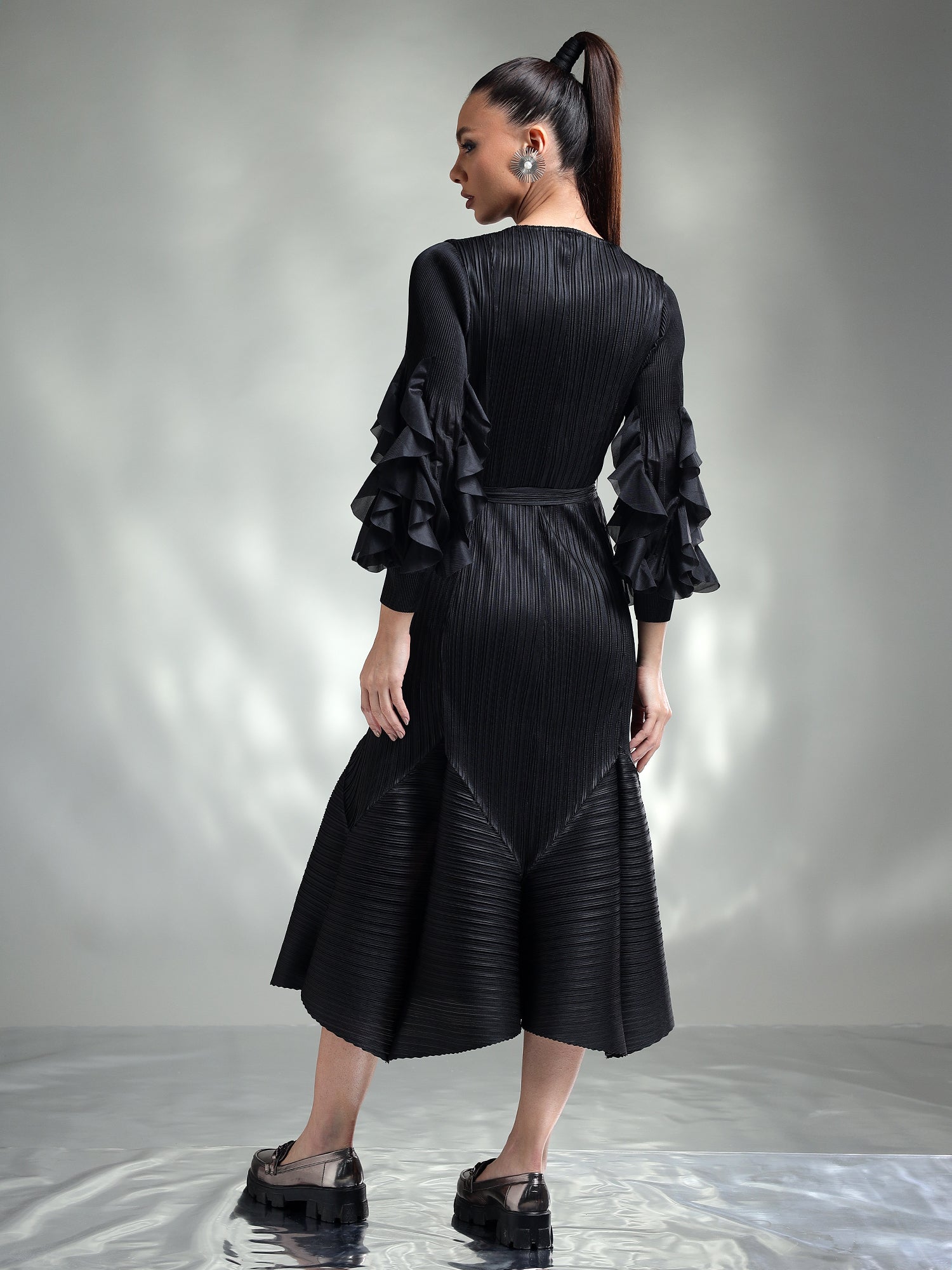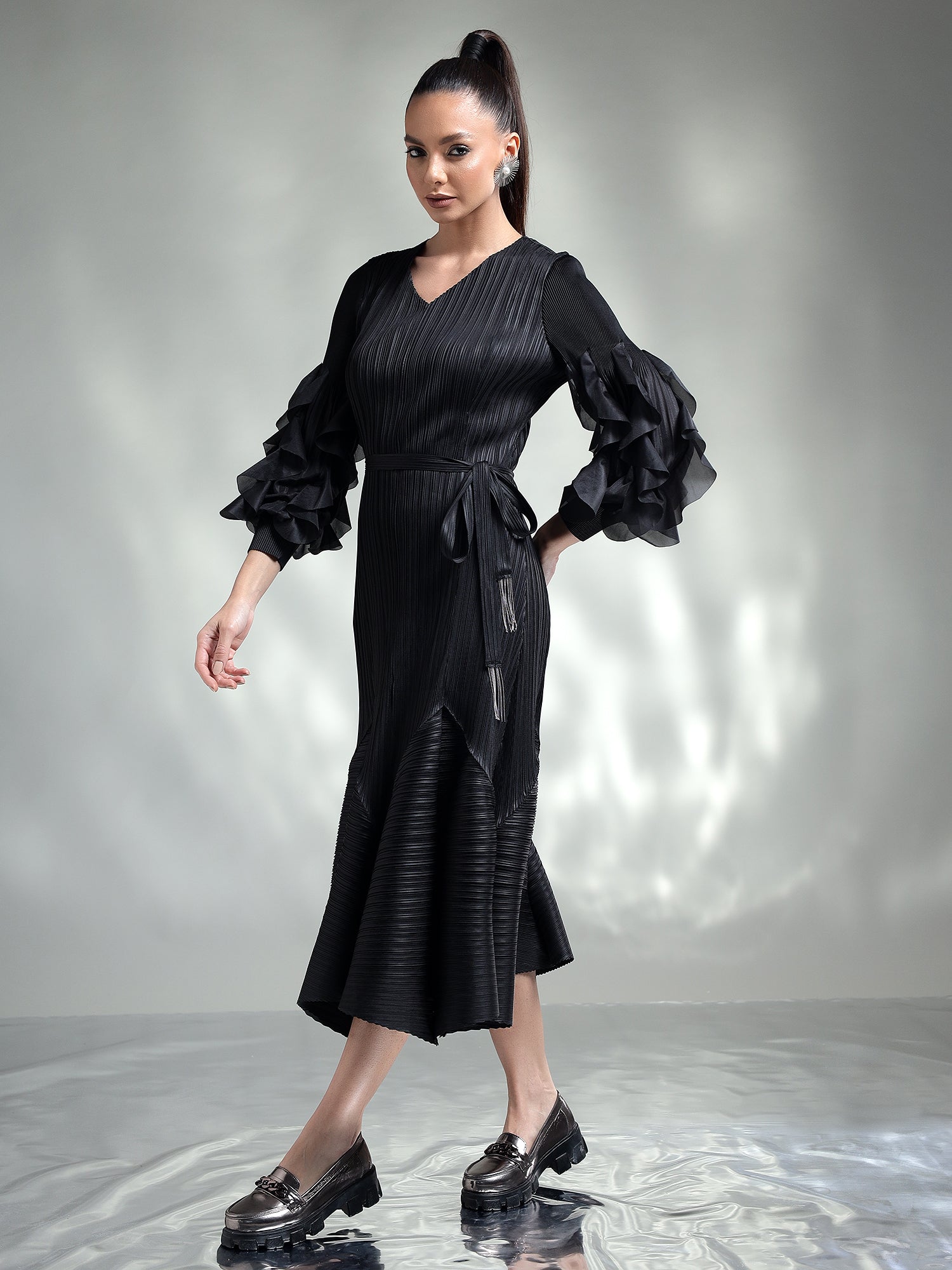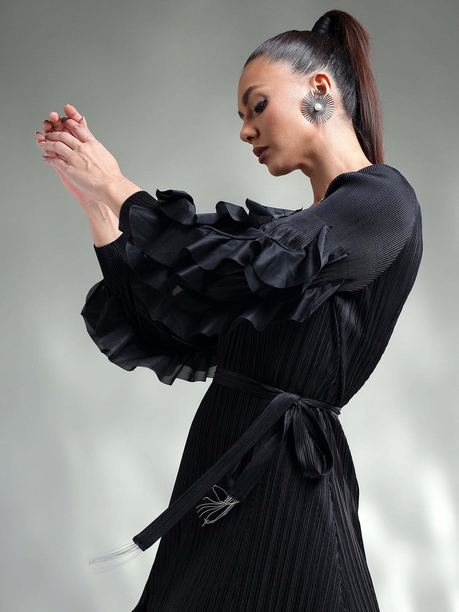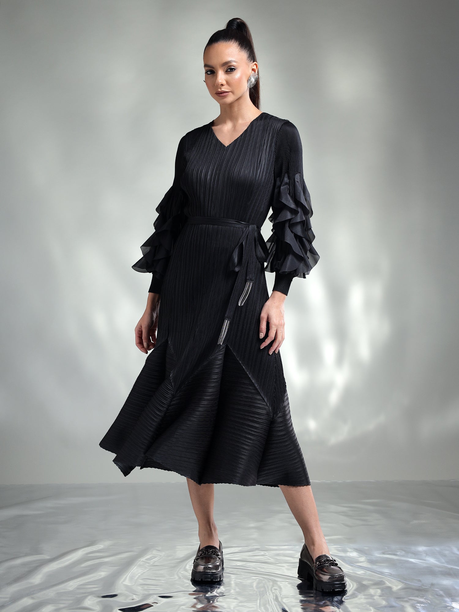 Featuring intricate sleeve detailing and a beautifully accented hem, it blends subtle sophistication with unique design elements. The pleated fabric flows gracefully, creating a flattering silhouette that ensures you look effortlessly chic.