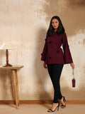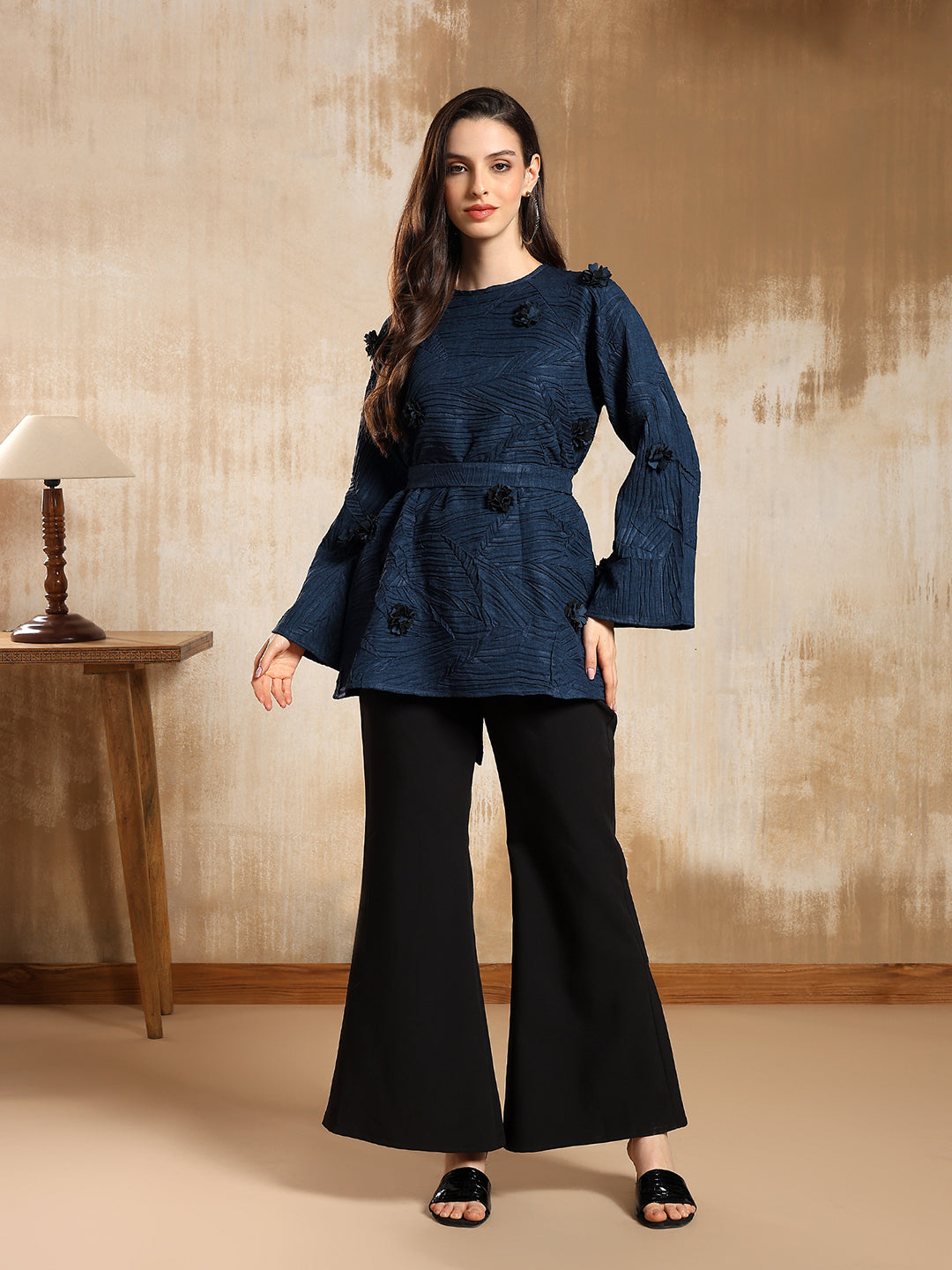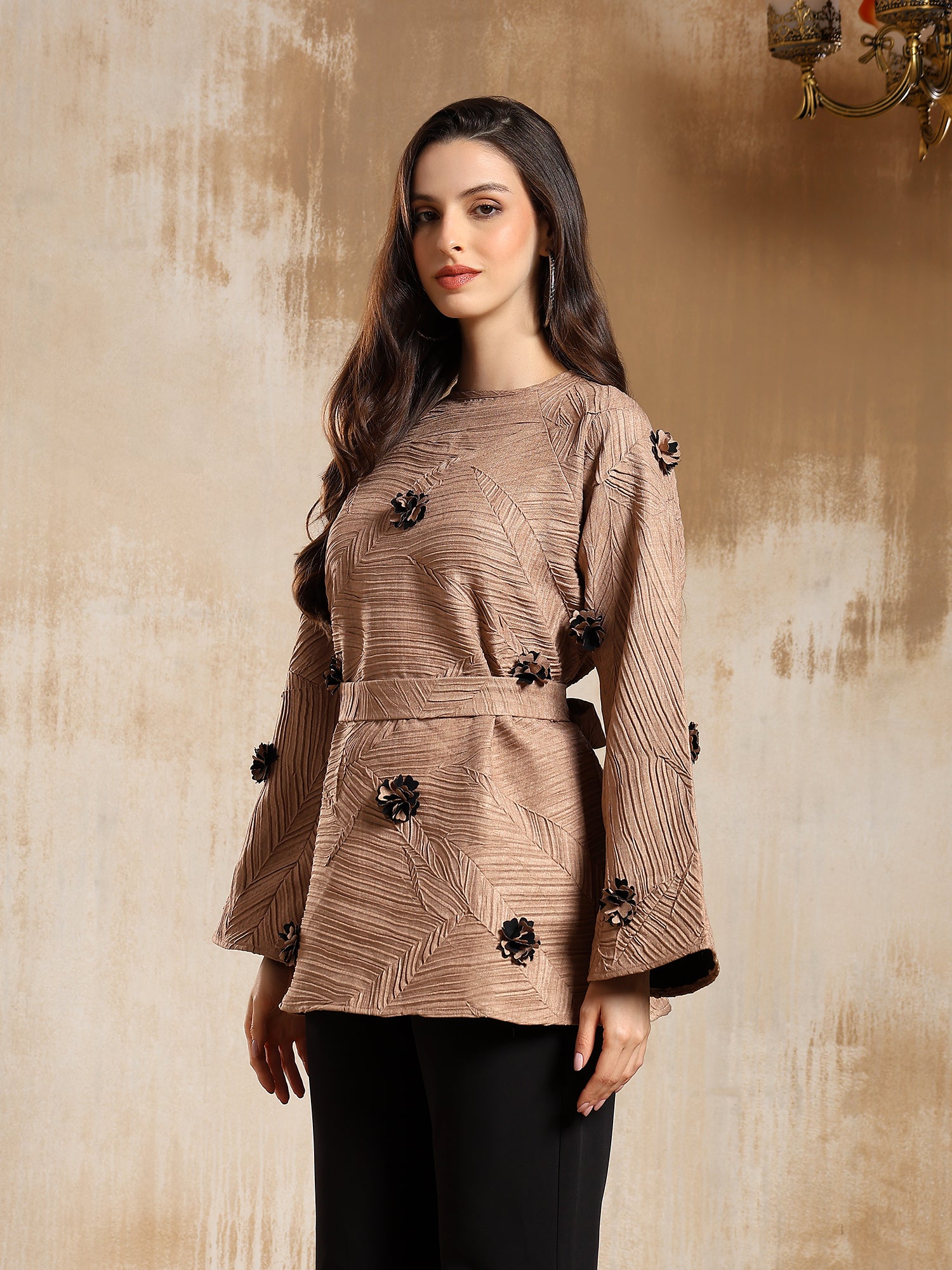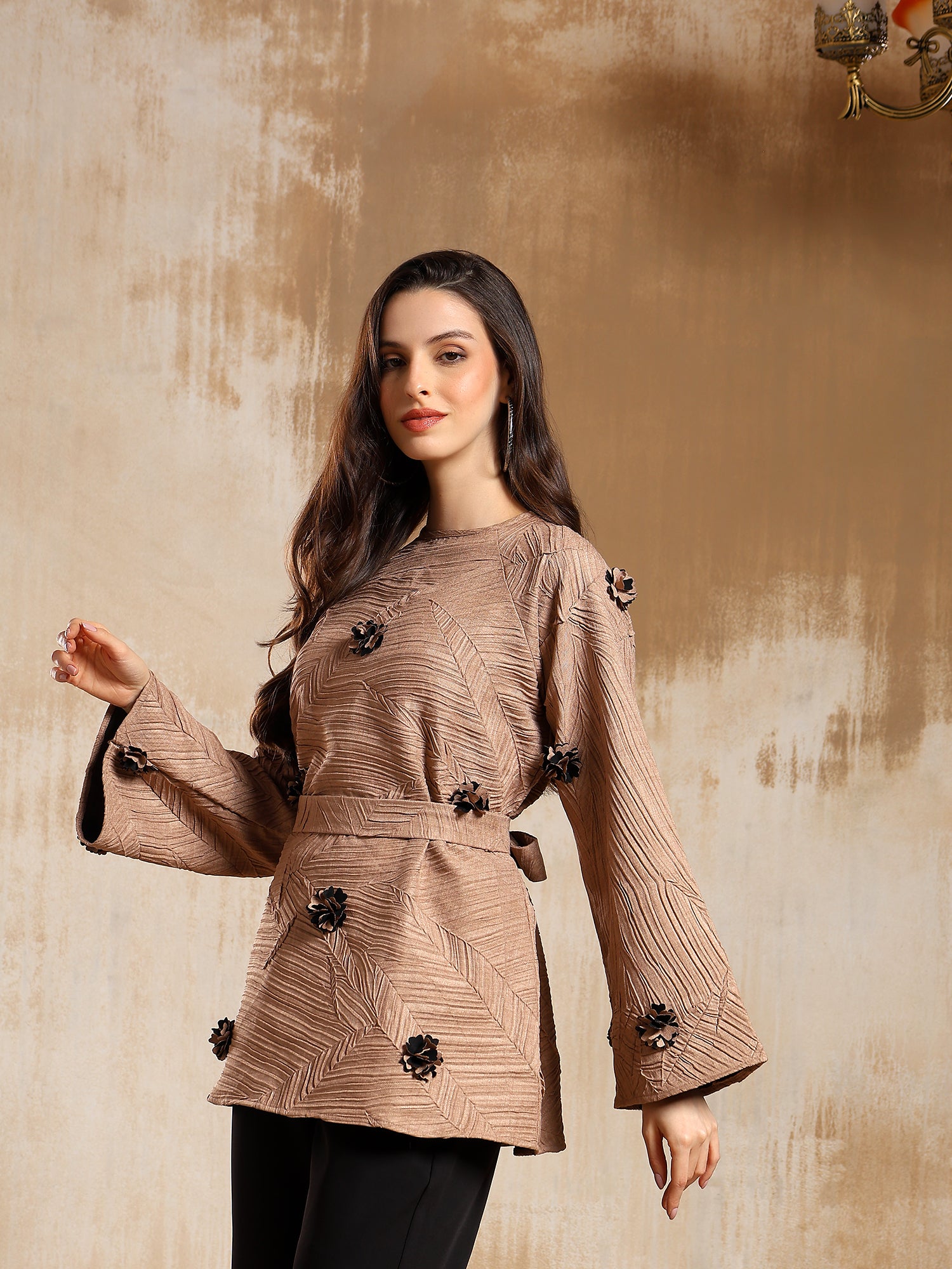The Elira Top embodies understated luxury with its rich texture and thoughtful detailing. Crafted in a soft winter-weight fabric, it features intricate pleated texturing and delicate 3D floral appliqués that add dimension and depth. The Raglan type, flared sleeves and waist tie create a flattering silhouette, while the multiple hues offers a refined, versatile appeal. Elegant yet effortless, this piece transitions seamlessly from day to evening with timeless grace.