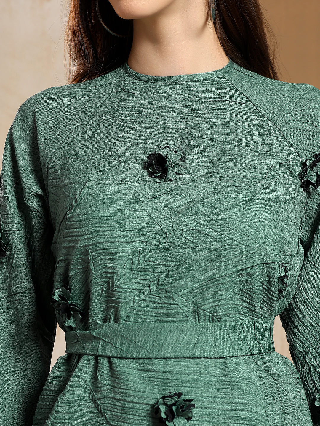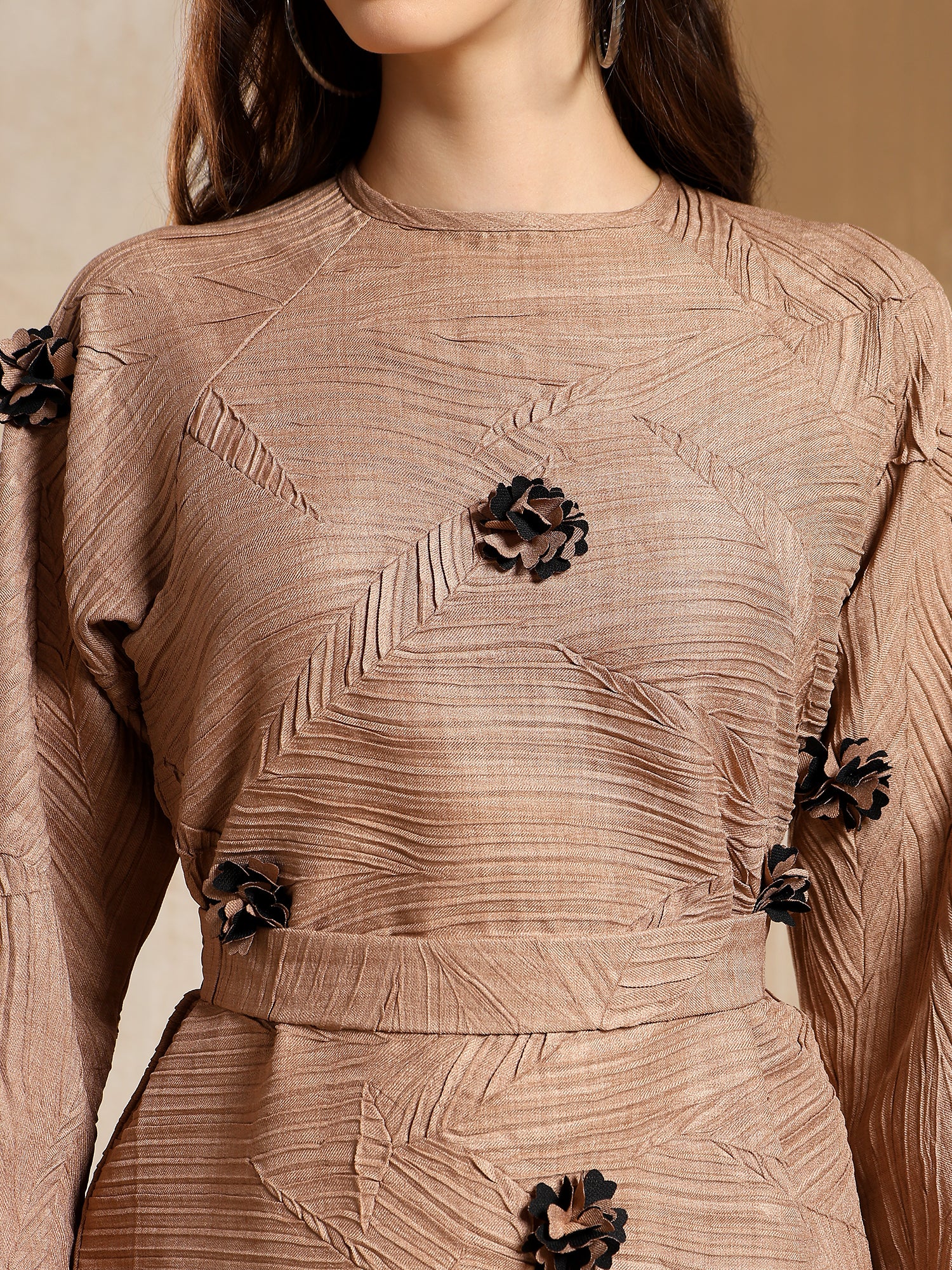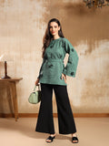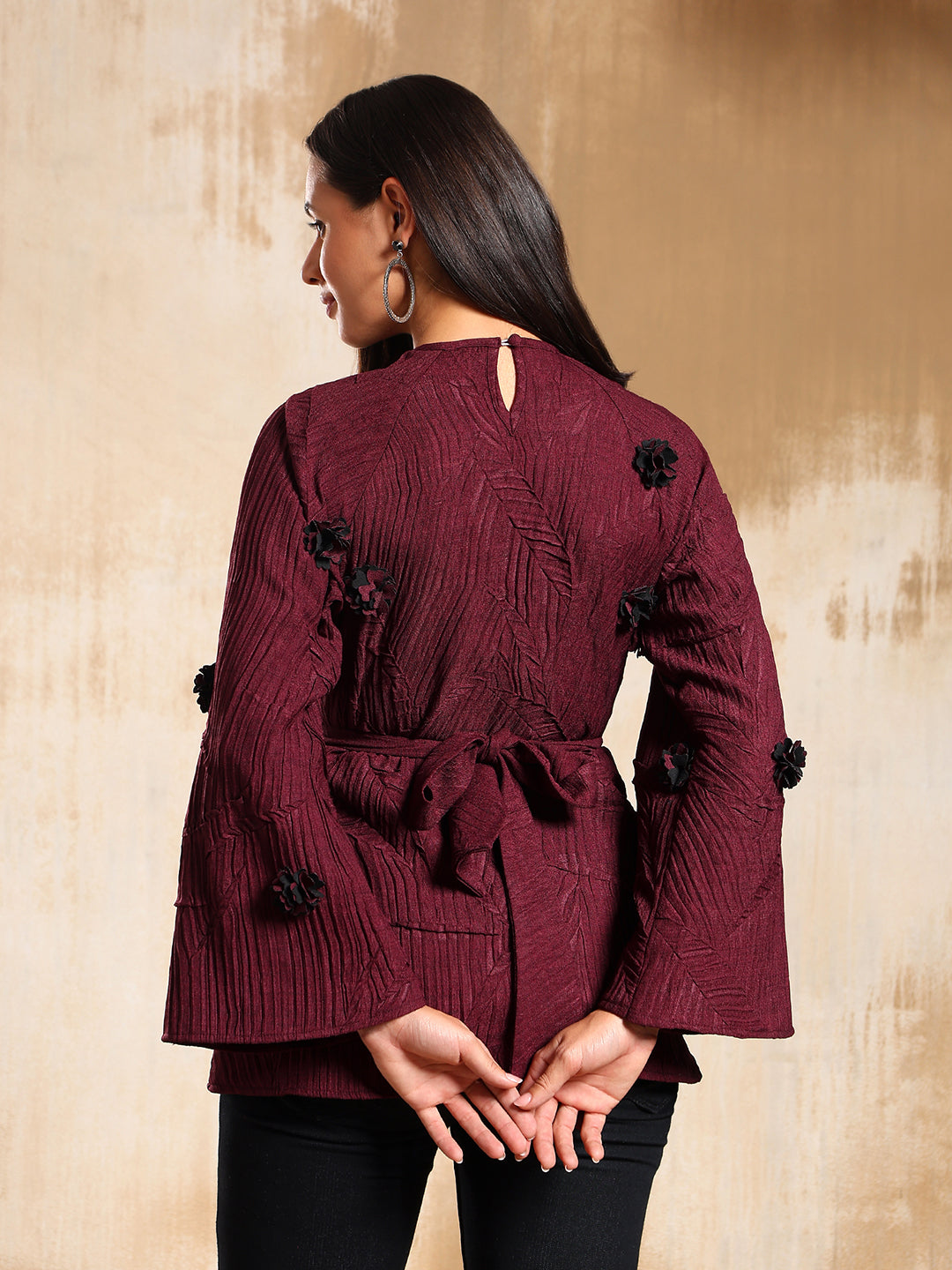 The Elira Top embodies understated luxury with its rich texture and thoughtful detailing. Crafted in a soft winter-weight fabric, it features intricate pleated texturing and delicate 3D floral appliqués that add dimension and depth. The Raglan type, flared sleeves and waist tie create a flattering silhouette, while the multiple hues offers a refined, versatile appeal. Elegant yet effortless, this piece transitions seamlessly from day to evening with timeless grace.