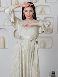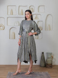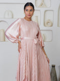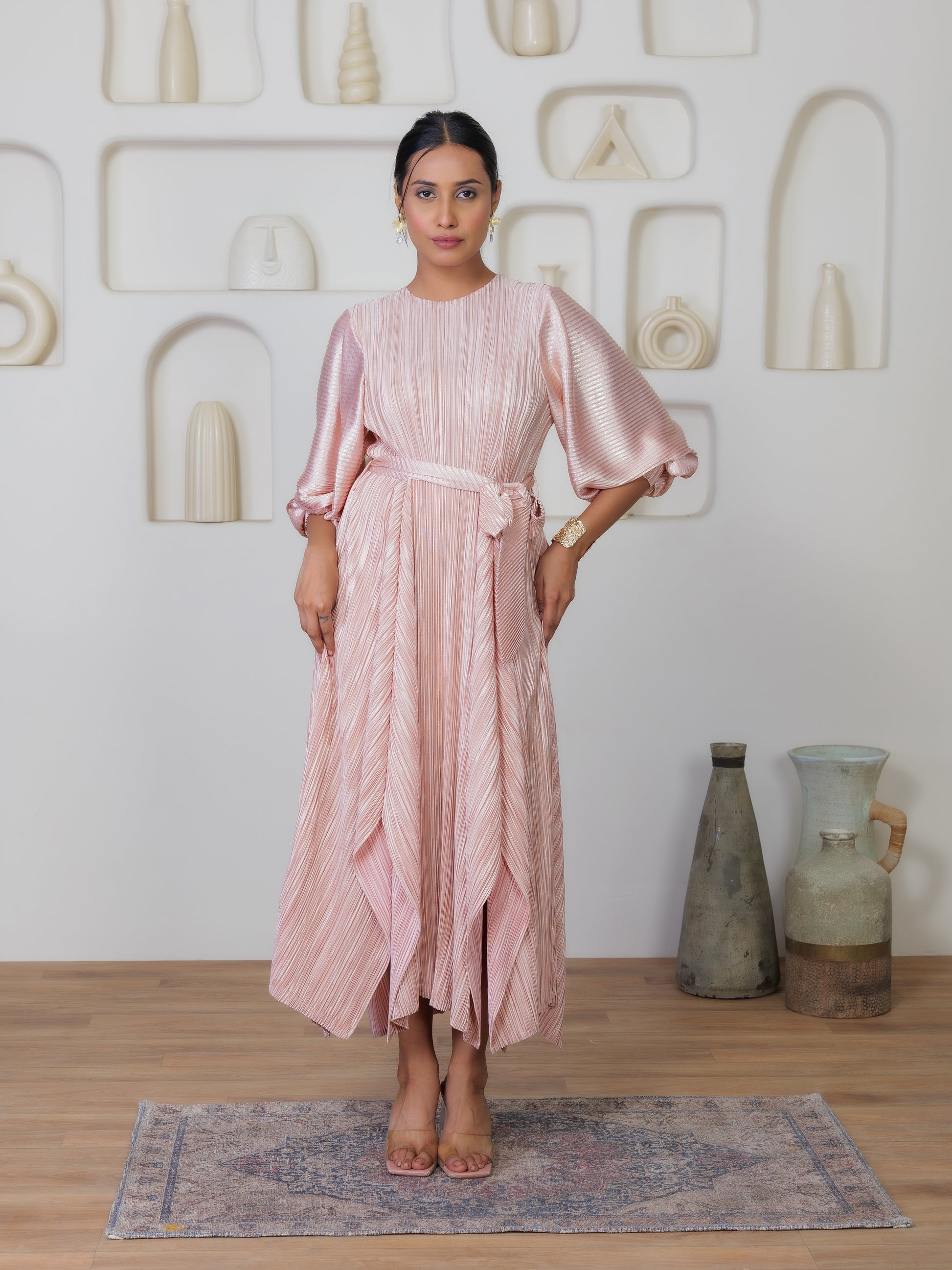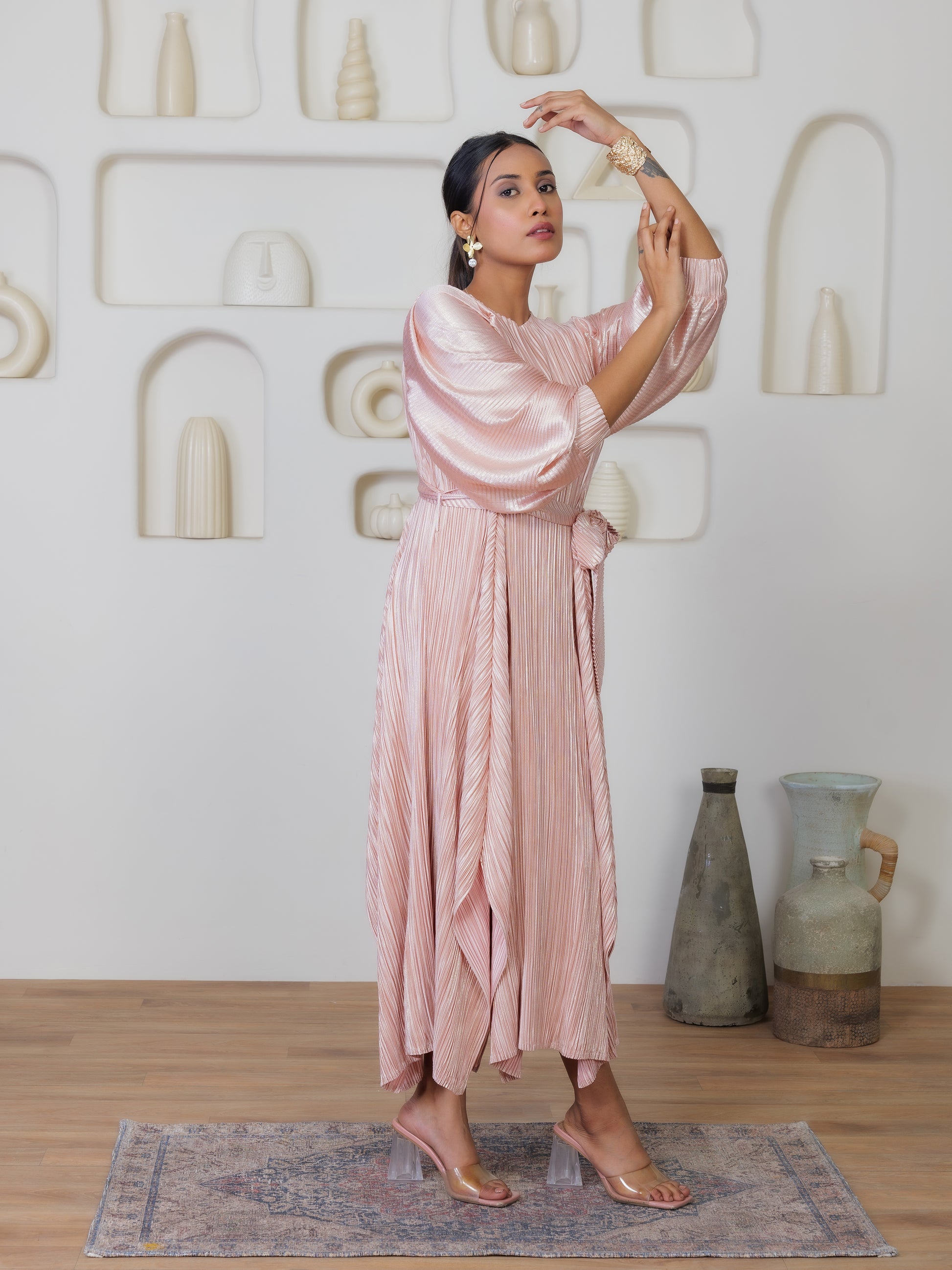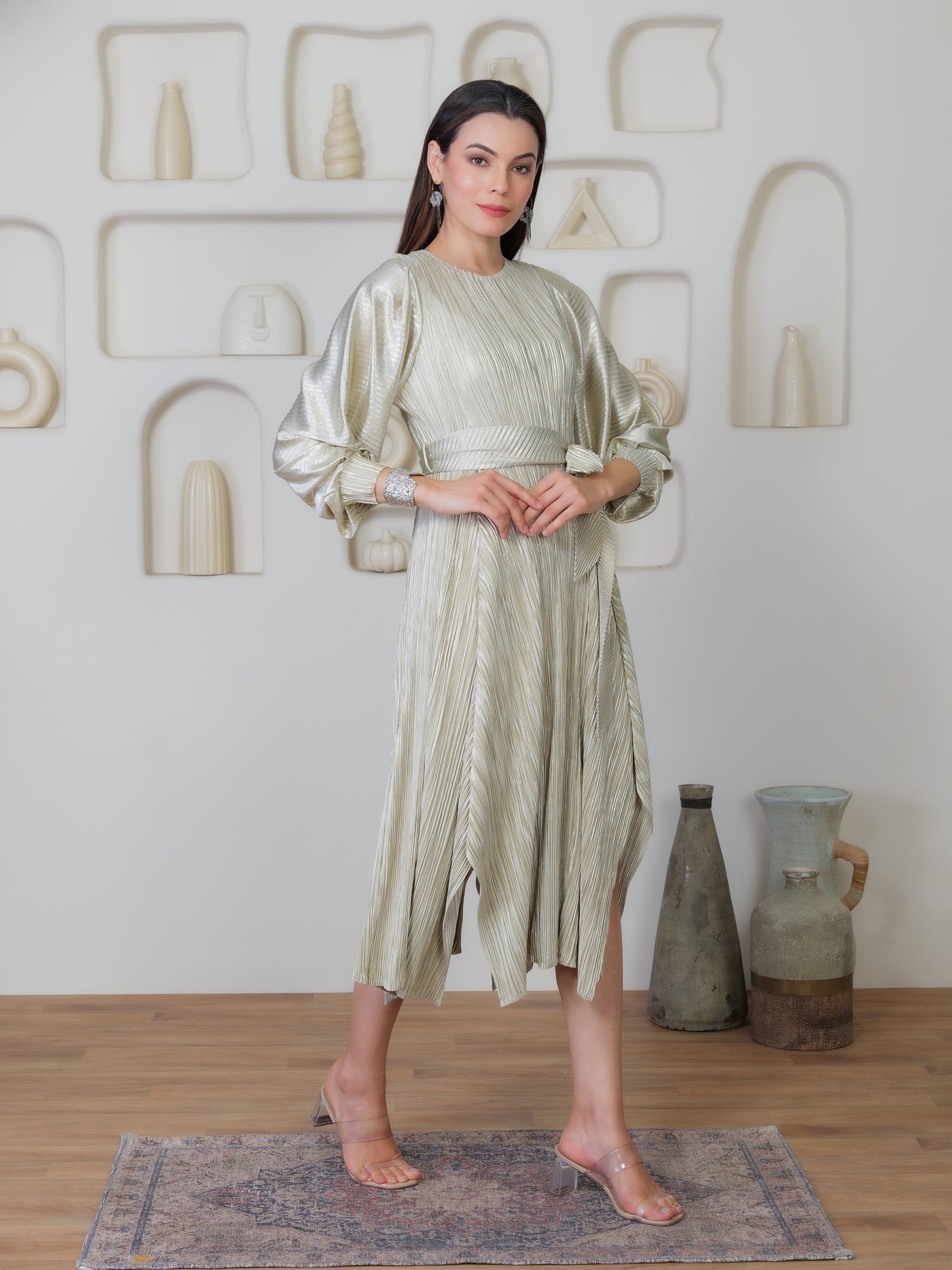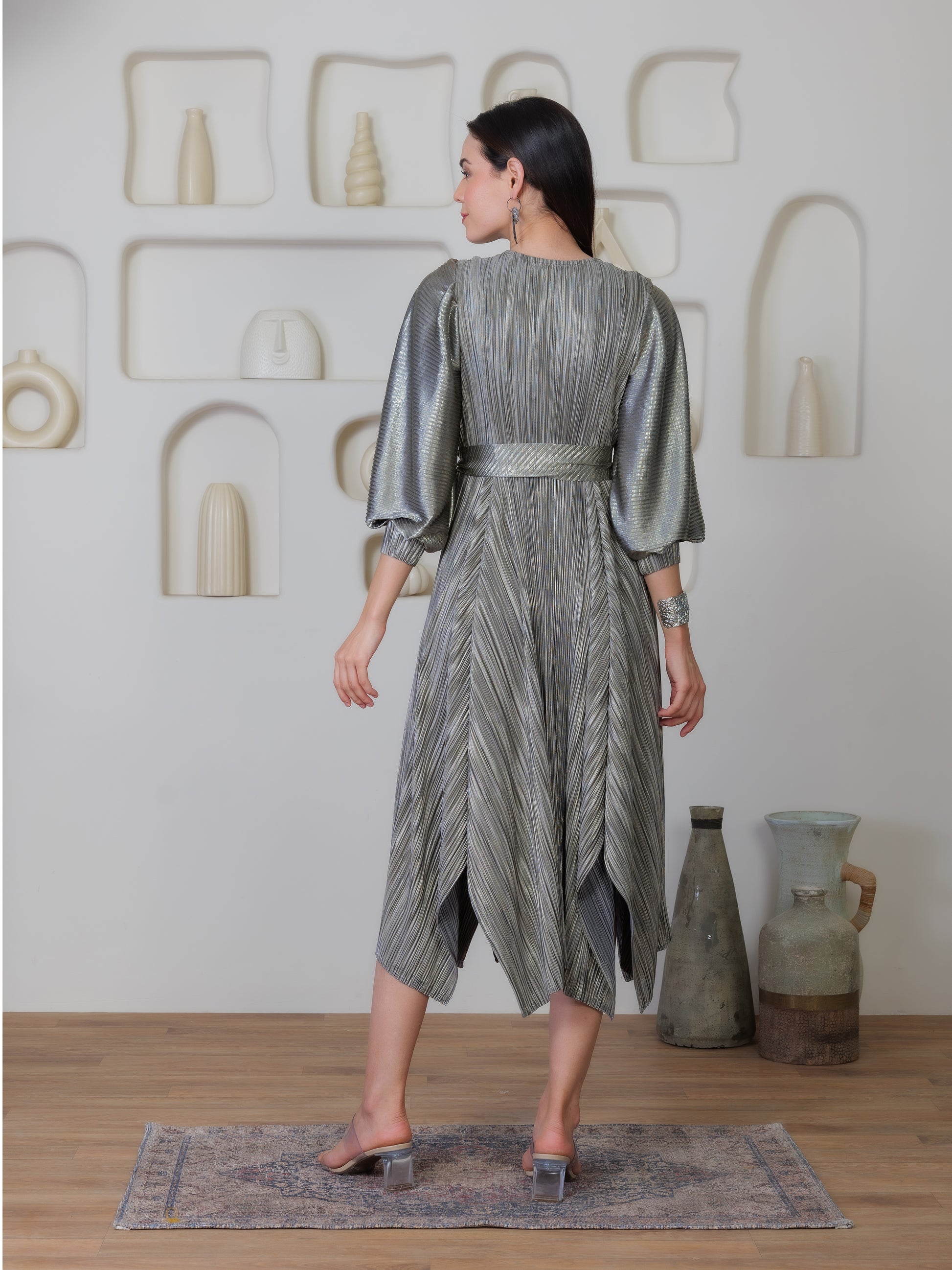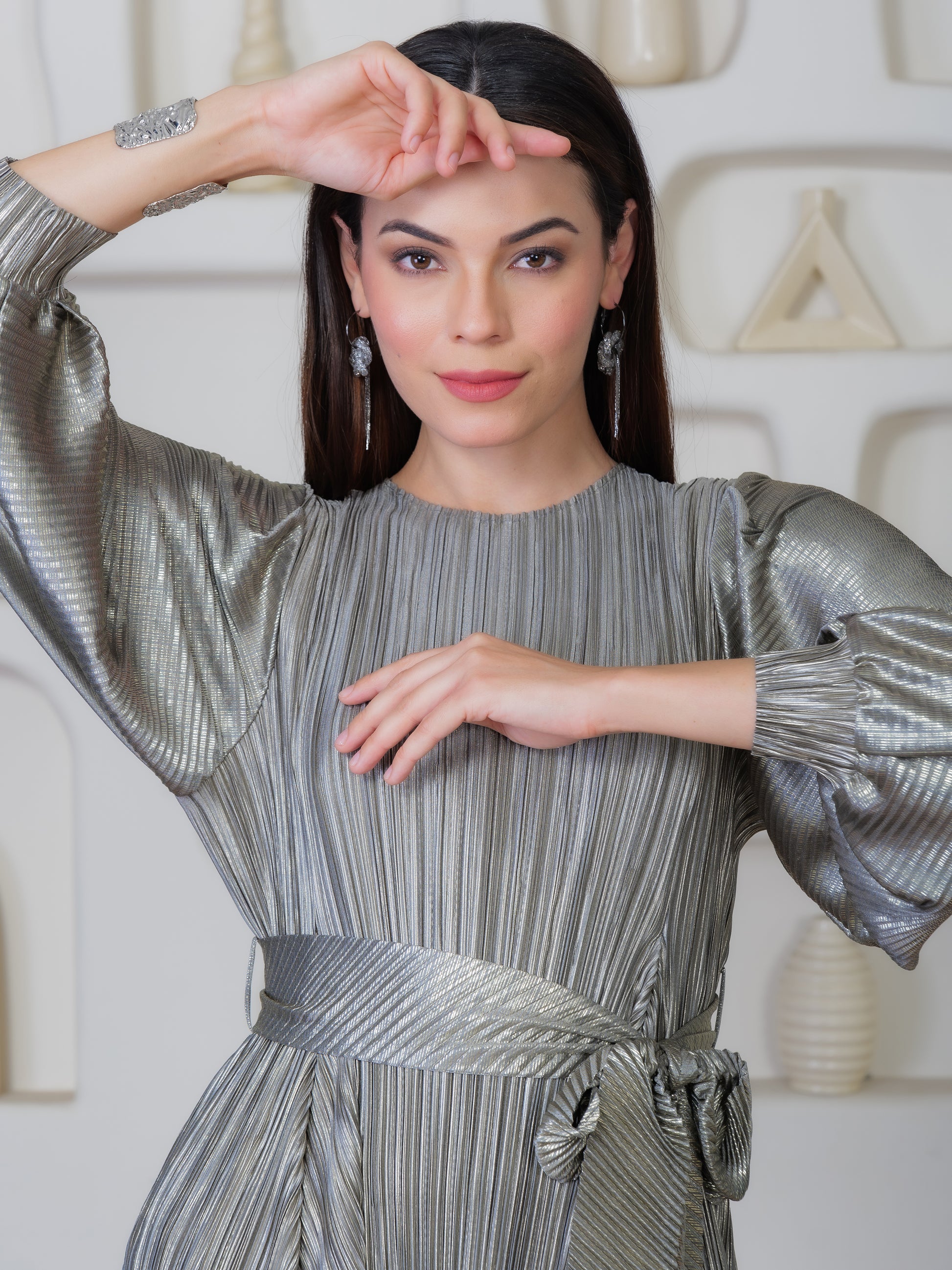 The Euphoria Dress is crafted from a sumptuous fabric that glistens with a metallic sheen, creating a luxurious look that catches the eye. Its elegant pleating flows beautifully, adding a dynamic and fluid texture to the dress. The design features a flattering, cinched waist tied with a delicate belt, enhancing your silhouette with sophistication.