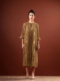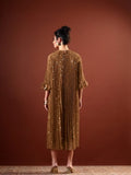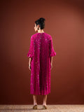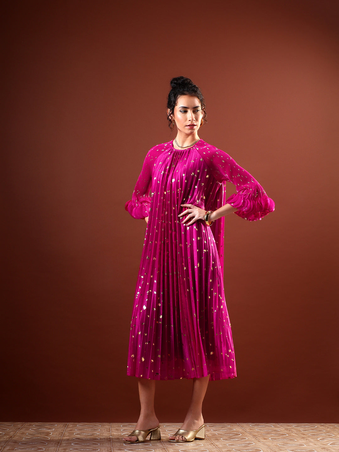 Crafted in a vibrant pink hue with delicate gold foil accents, this pleated midi dress blends effortless elegance with festive charm. The fluid silhouette features fine all-over pleats that create graceful movement, while the gathered round neckline adds a soft, feminine touch. Three-quarter sleeves with subtle cuff detailing balance comfort and style, making it perfect for celebrations, evenings, or intimate festive gatherings. Light, flowy, and refined, this dress is designed to stand out while feeling beautifully easy to wear.