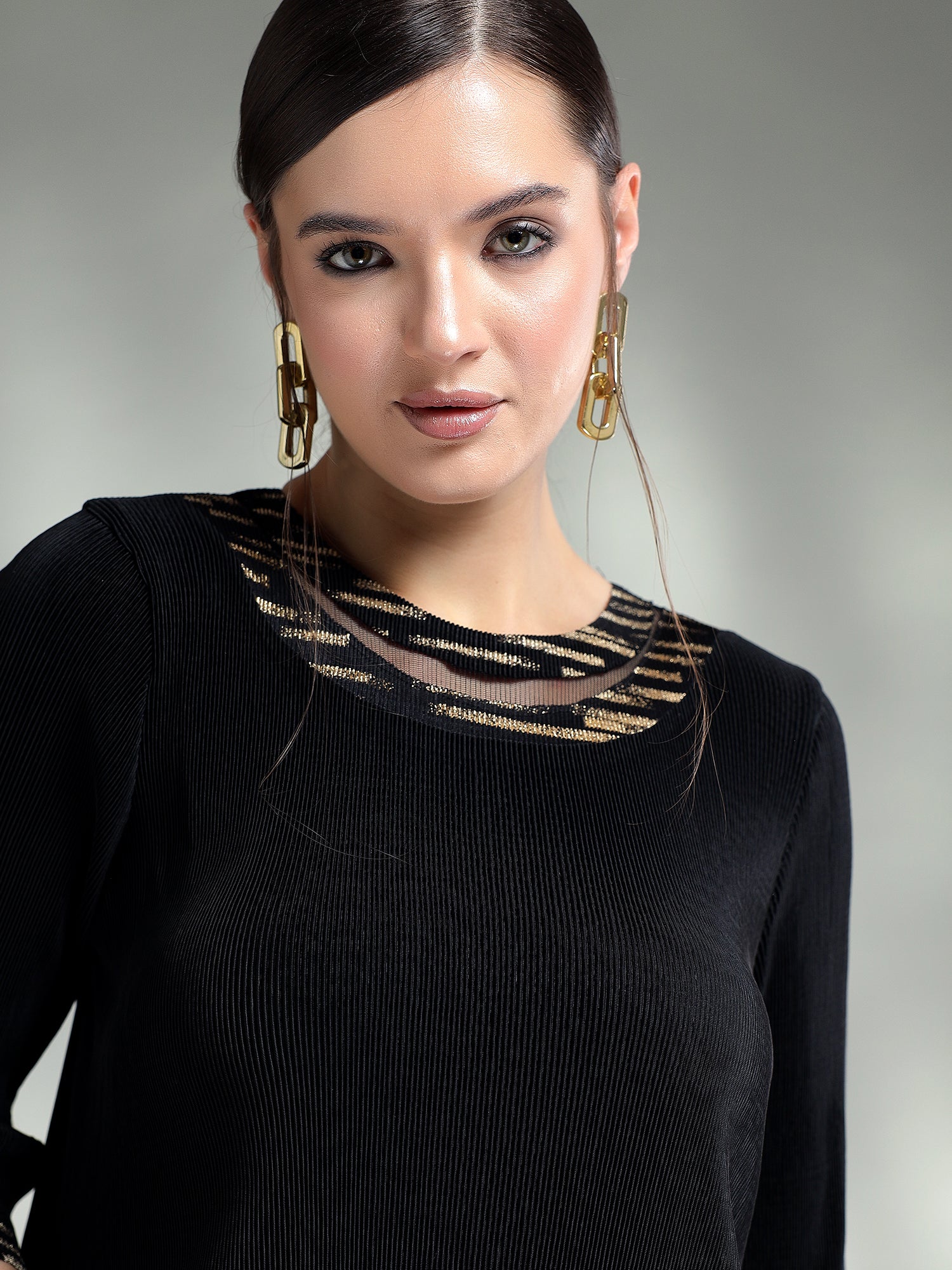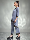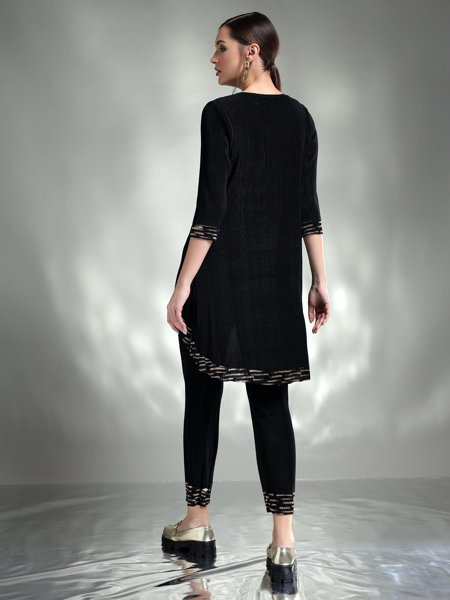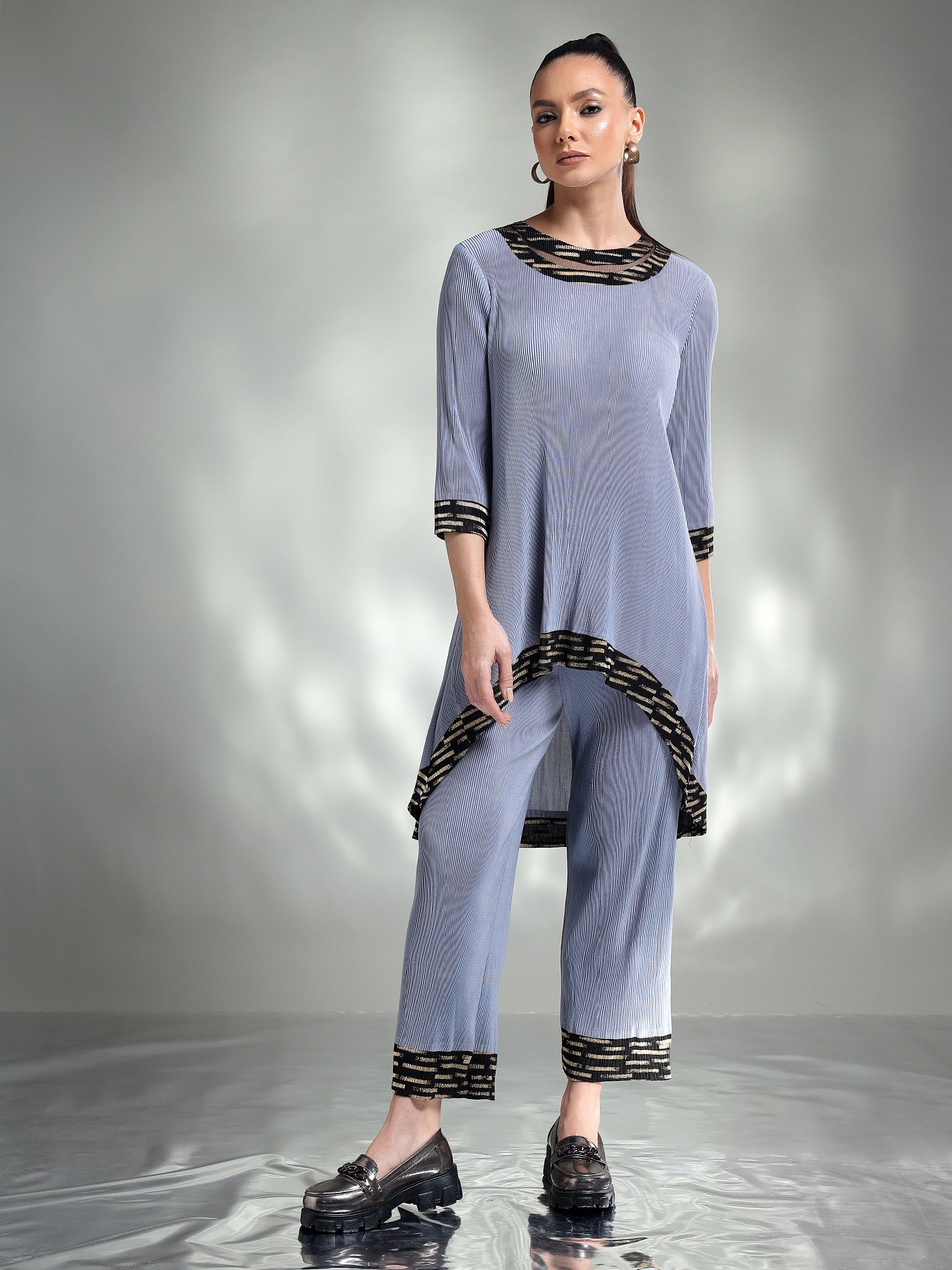 Refresh your wardrobe with this chic coord set, designed to make a bold statement. Featuring sleek black and grey tones, this set is elevated by metallic details on the neck and hem in striking black and gold, creating a fresh and modern look.