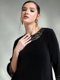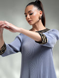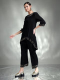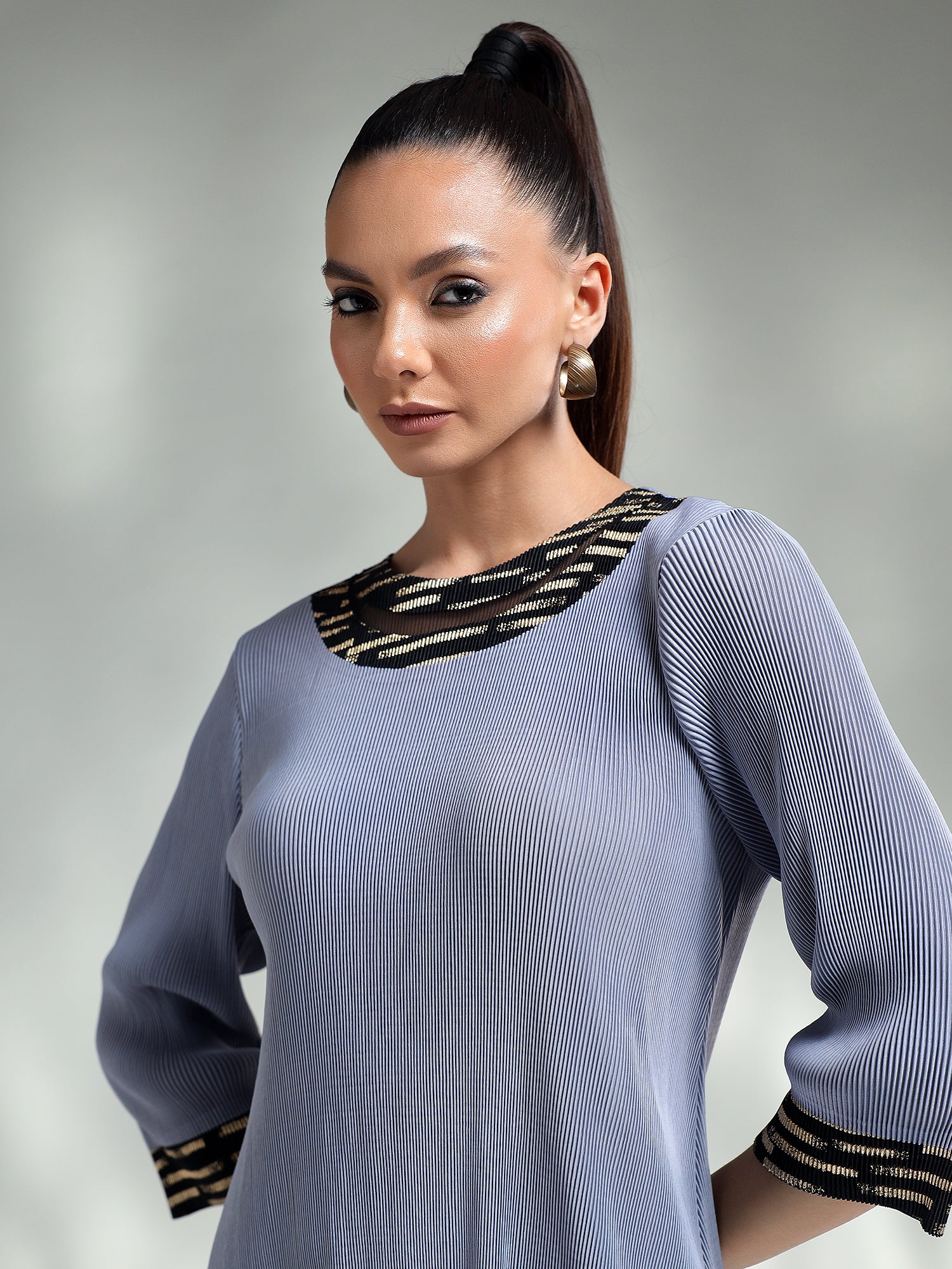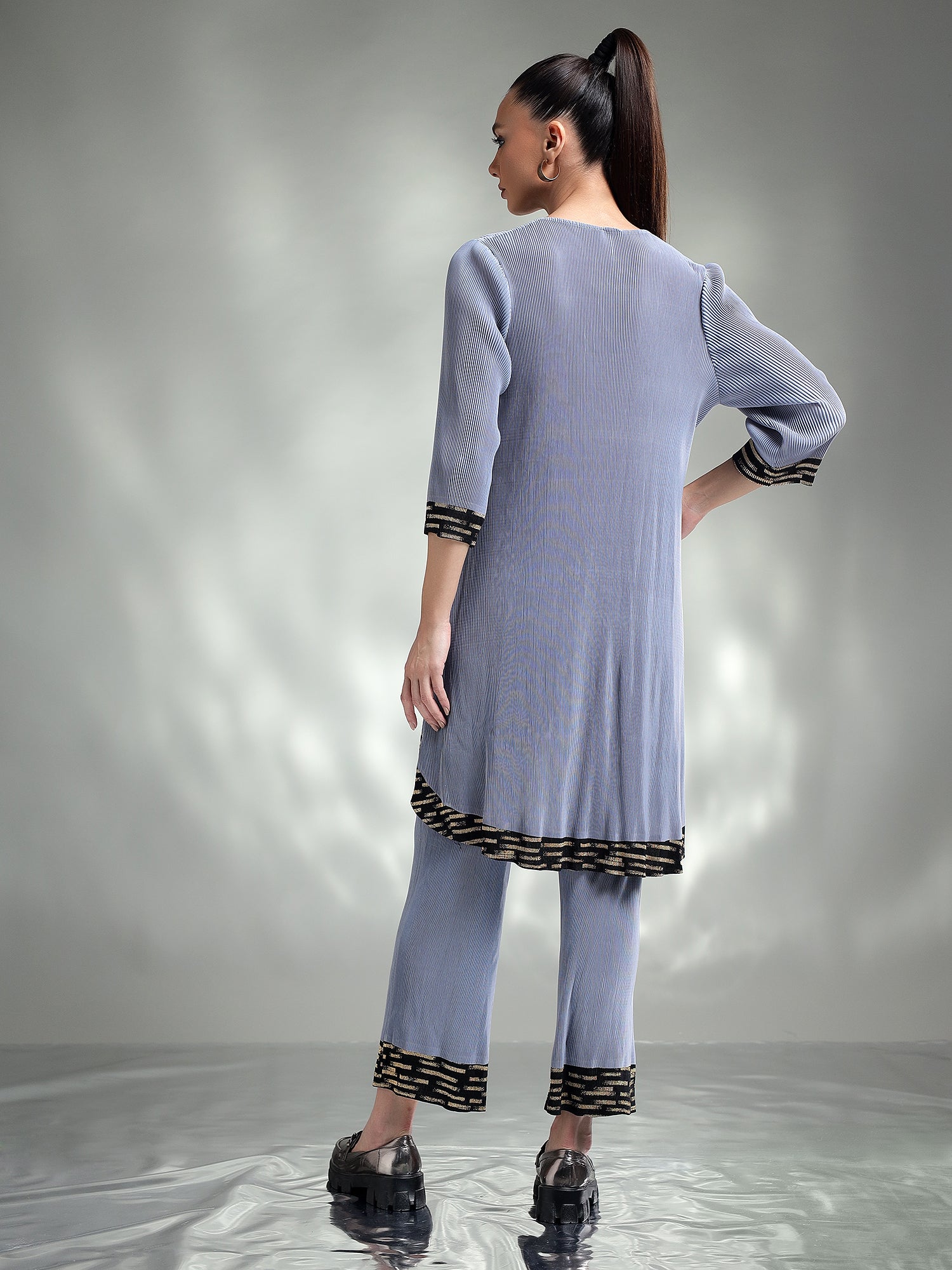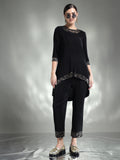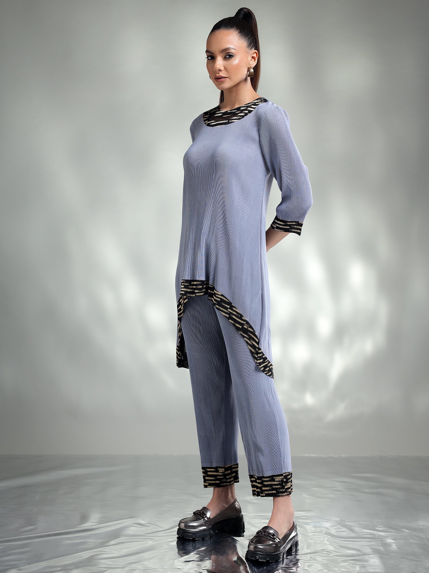 Refresh your wardrobe with this chic coord set, designed to make a bold statement. Featuring sleek black and grey tones, this set is elevated by metallic details on the neck and hem in striking black and gold, creating a fresh and modern look.