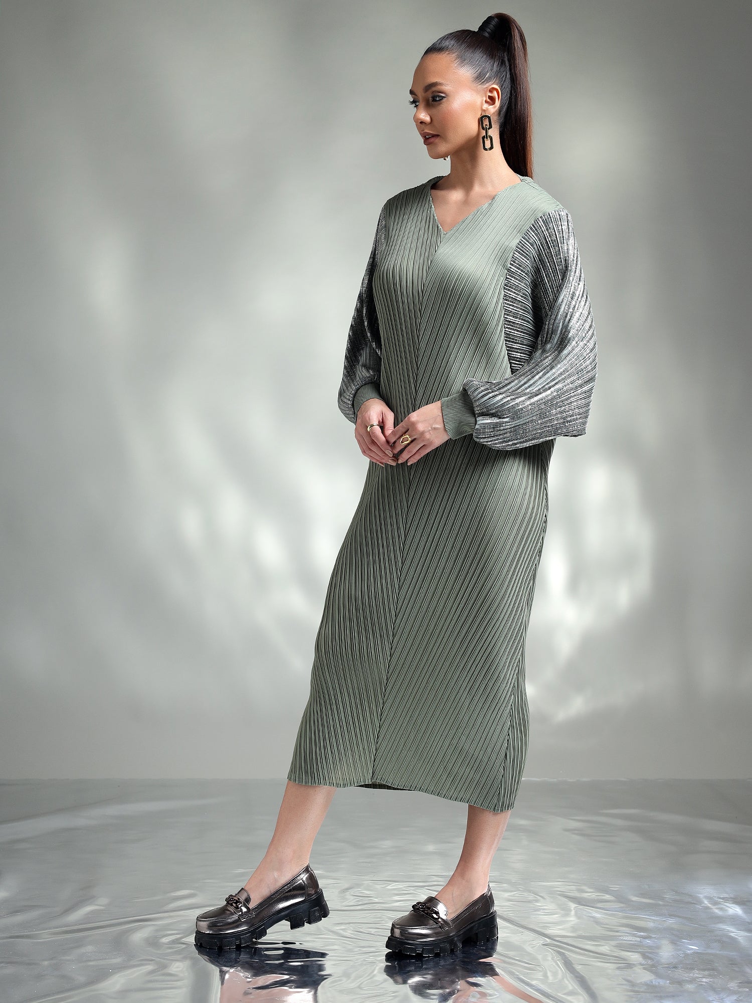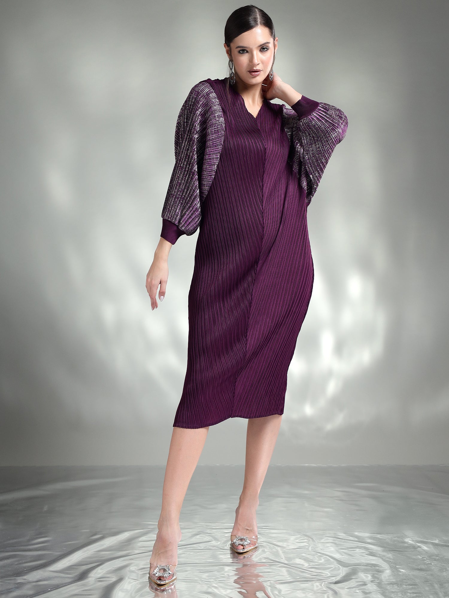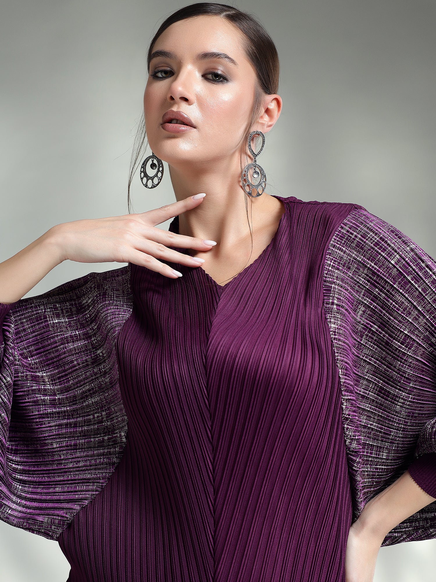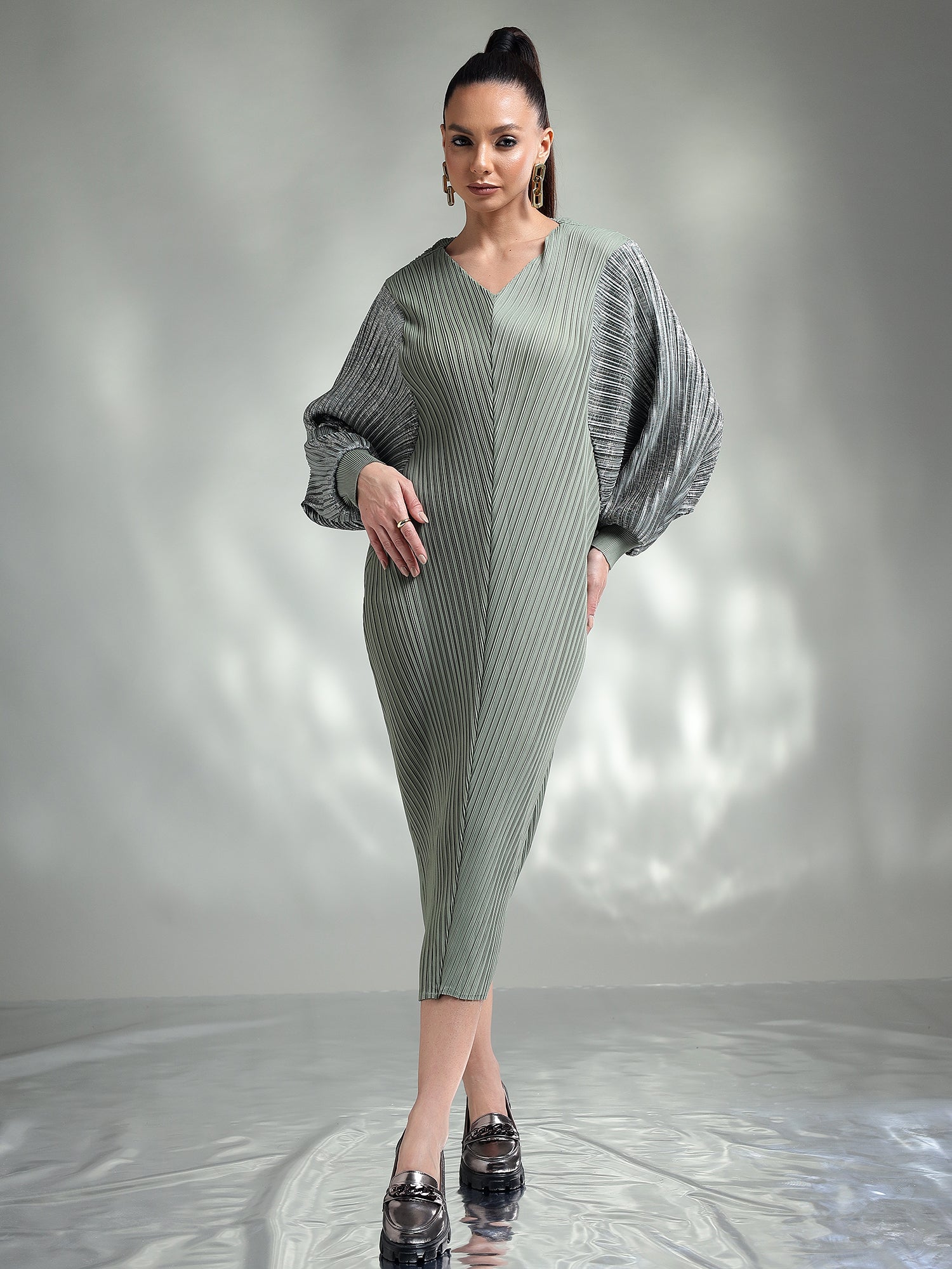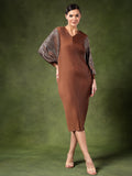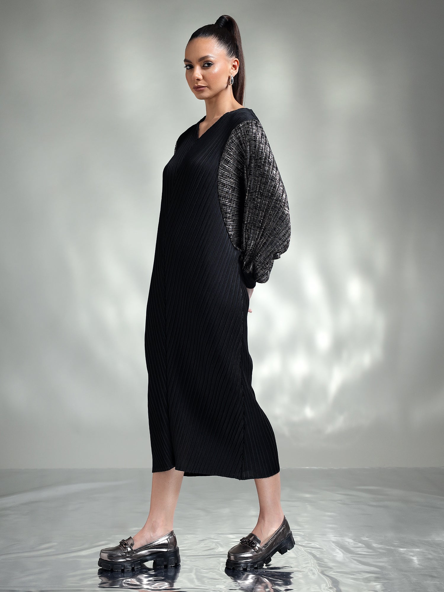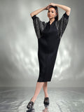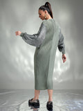 Dazzle in this sophisticated metallic dress, designed to make you the center of attention. Made from shimmering metallic fabric, this dress features flowing kaftan sleeves that add an effortless touch of elegance. The relaxed yet chic silhouette ensures both comfort and style, making it ideal for special occasions.