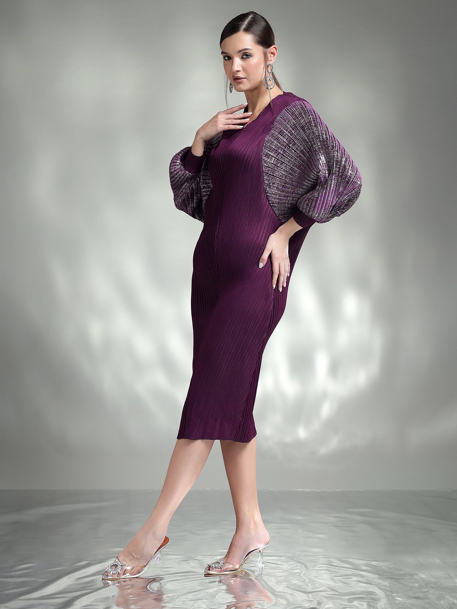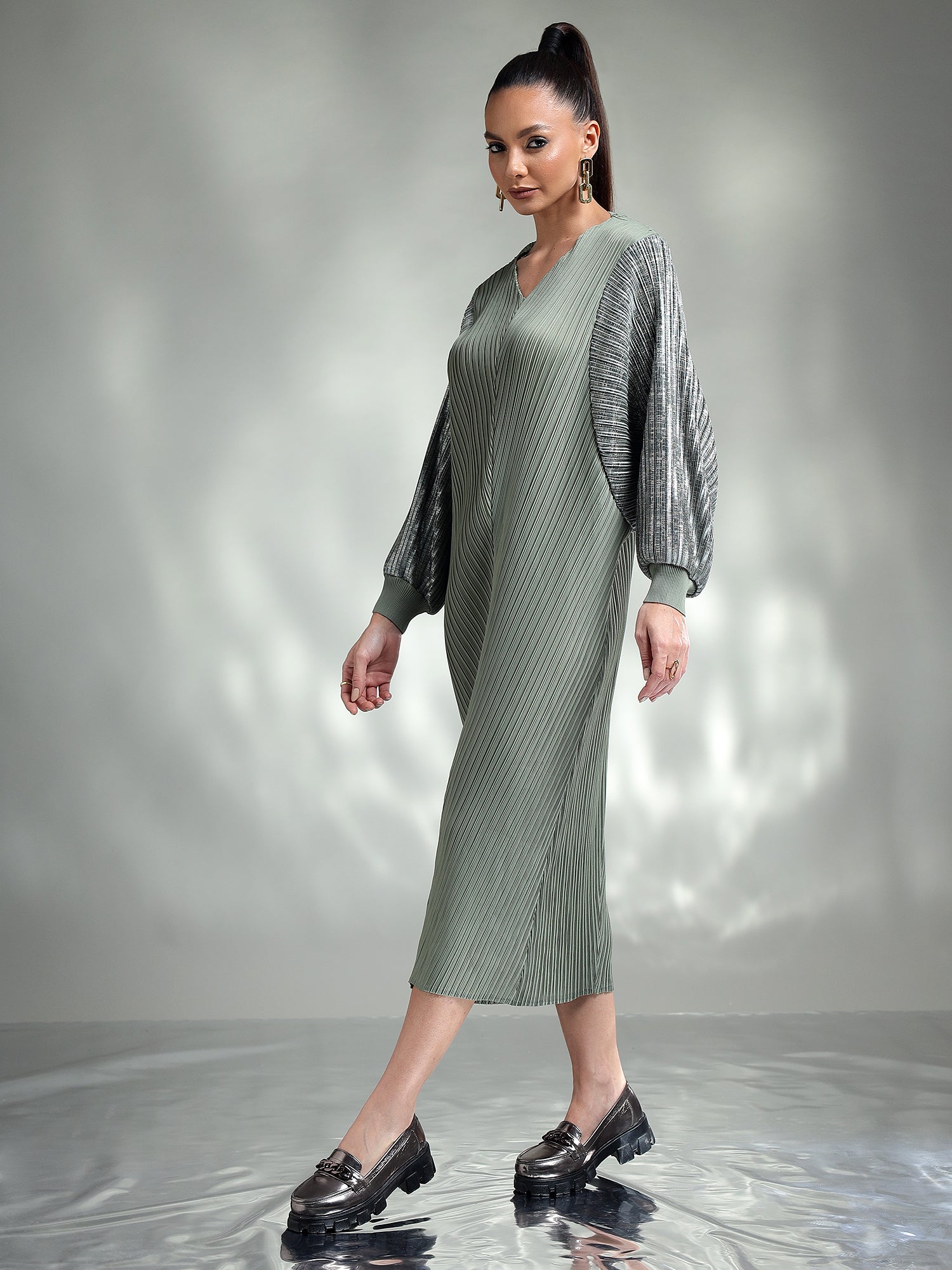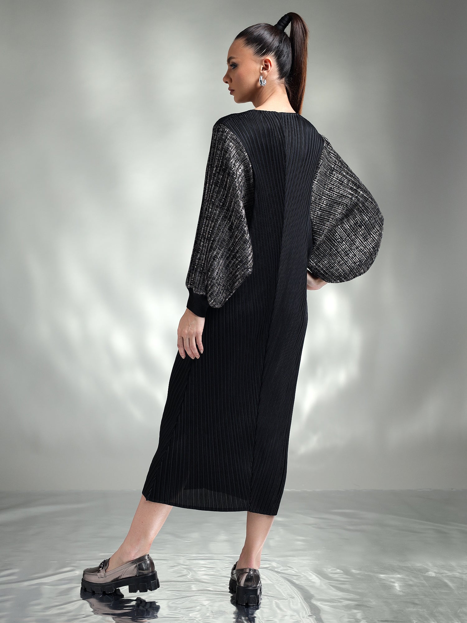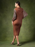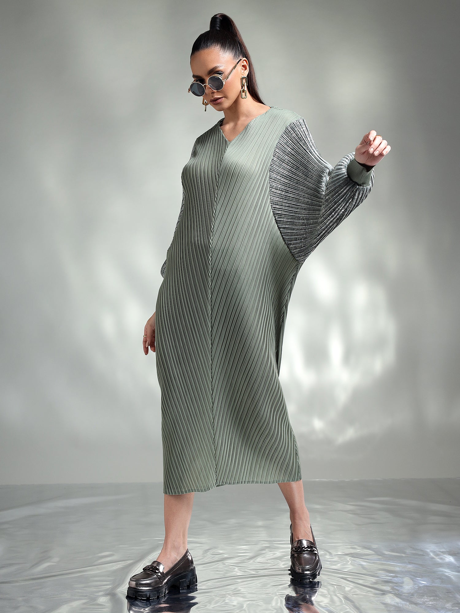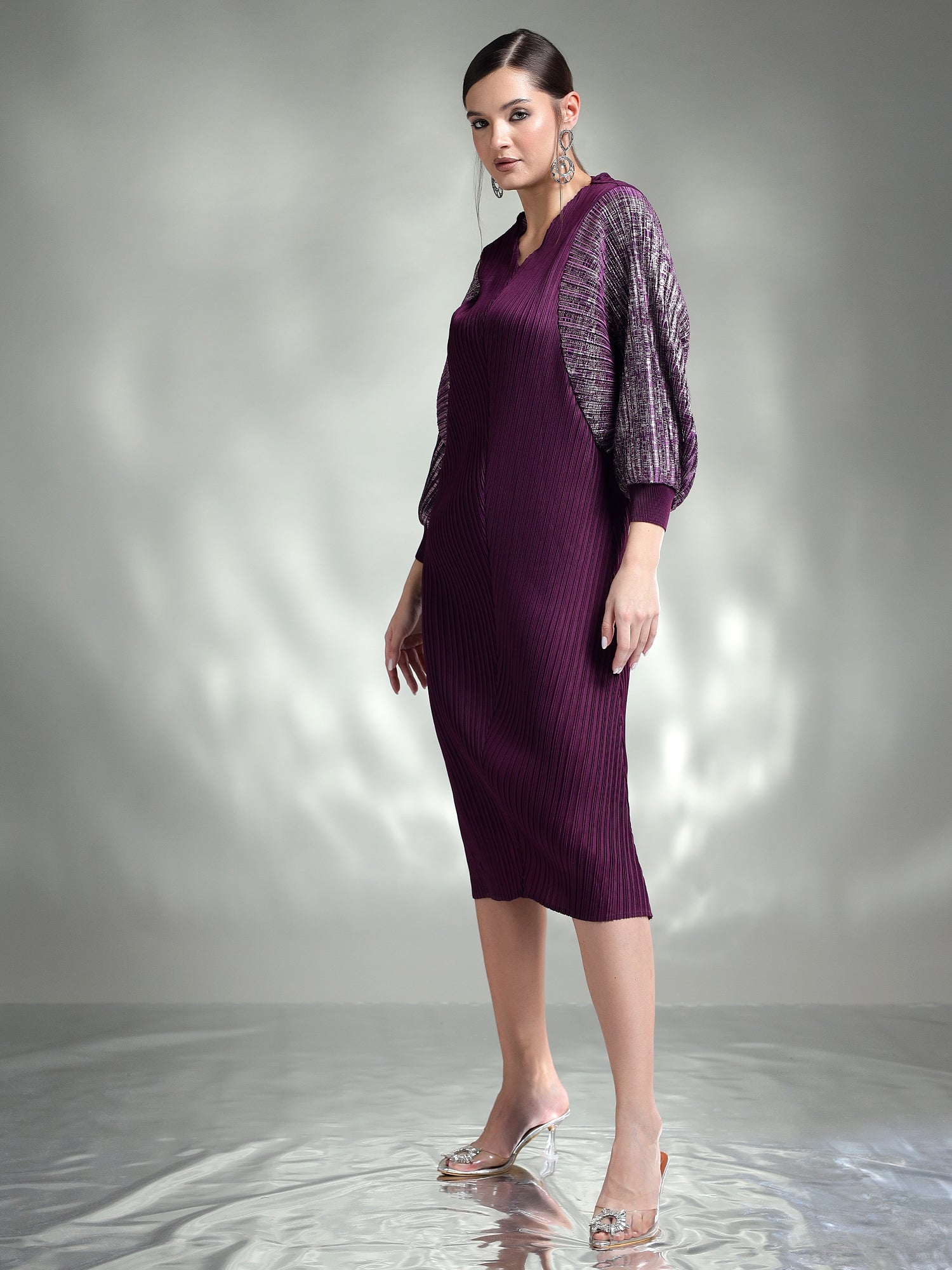 Dazzle in this sophisticated metallic dress, designed to make you the center of attention. Made from shimmering metallic fabric, this dress features flowing kaftan sleeves that add an effortless touch of elegance. The relaxed yet chic silhouette ensures both comfort and style, making it ideal for special occasions.