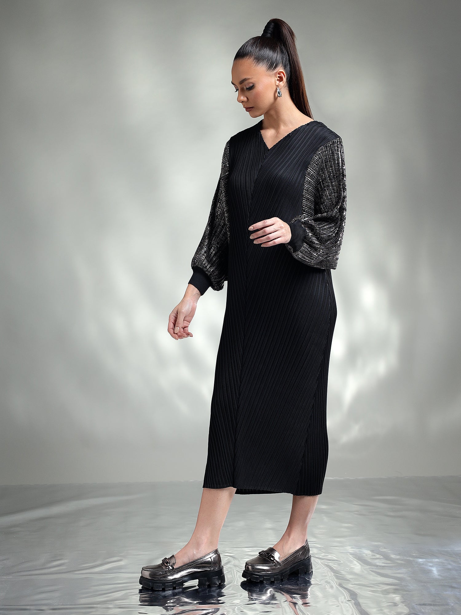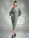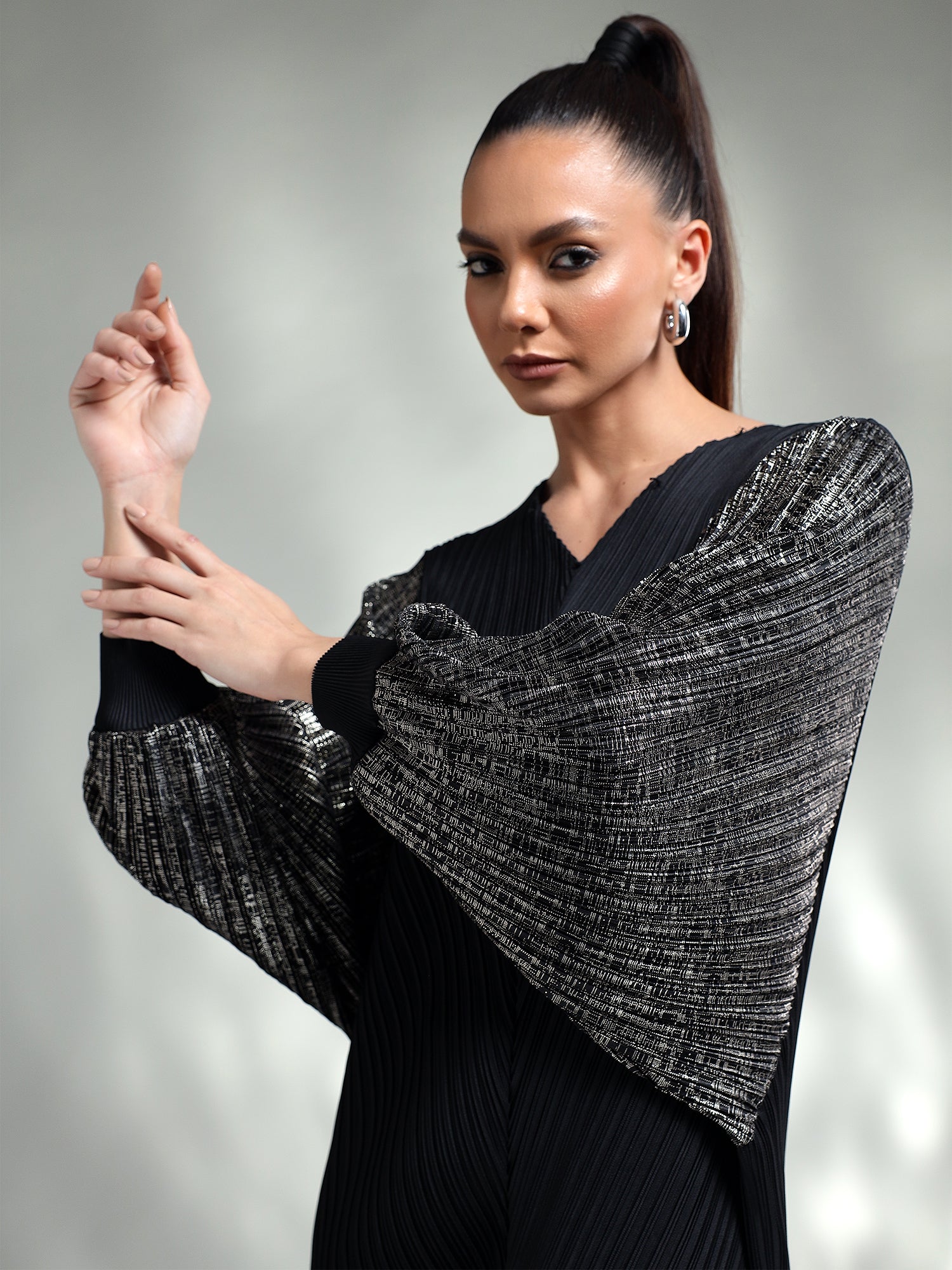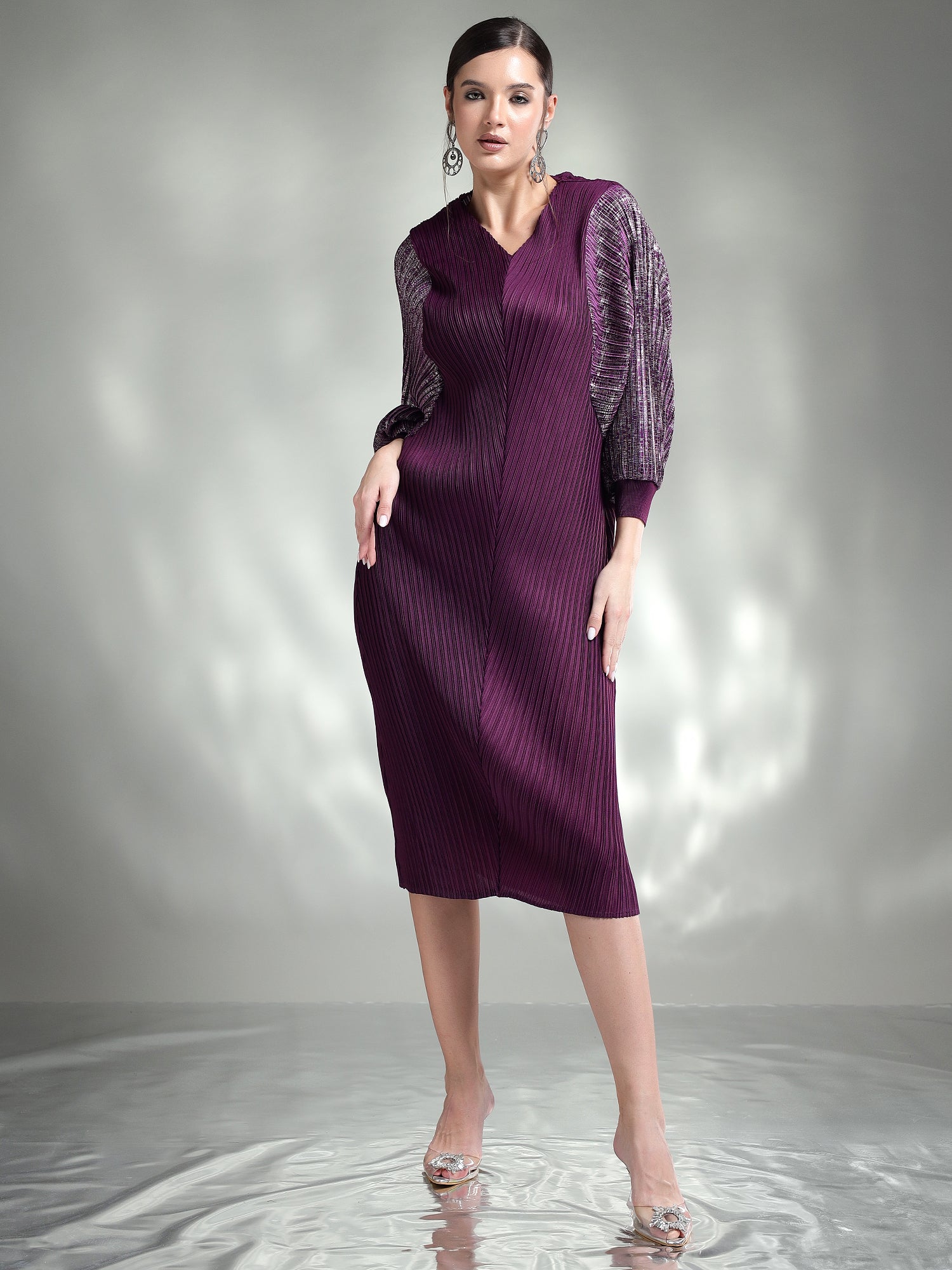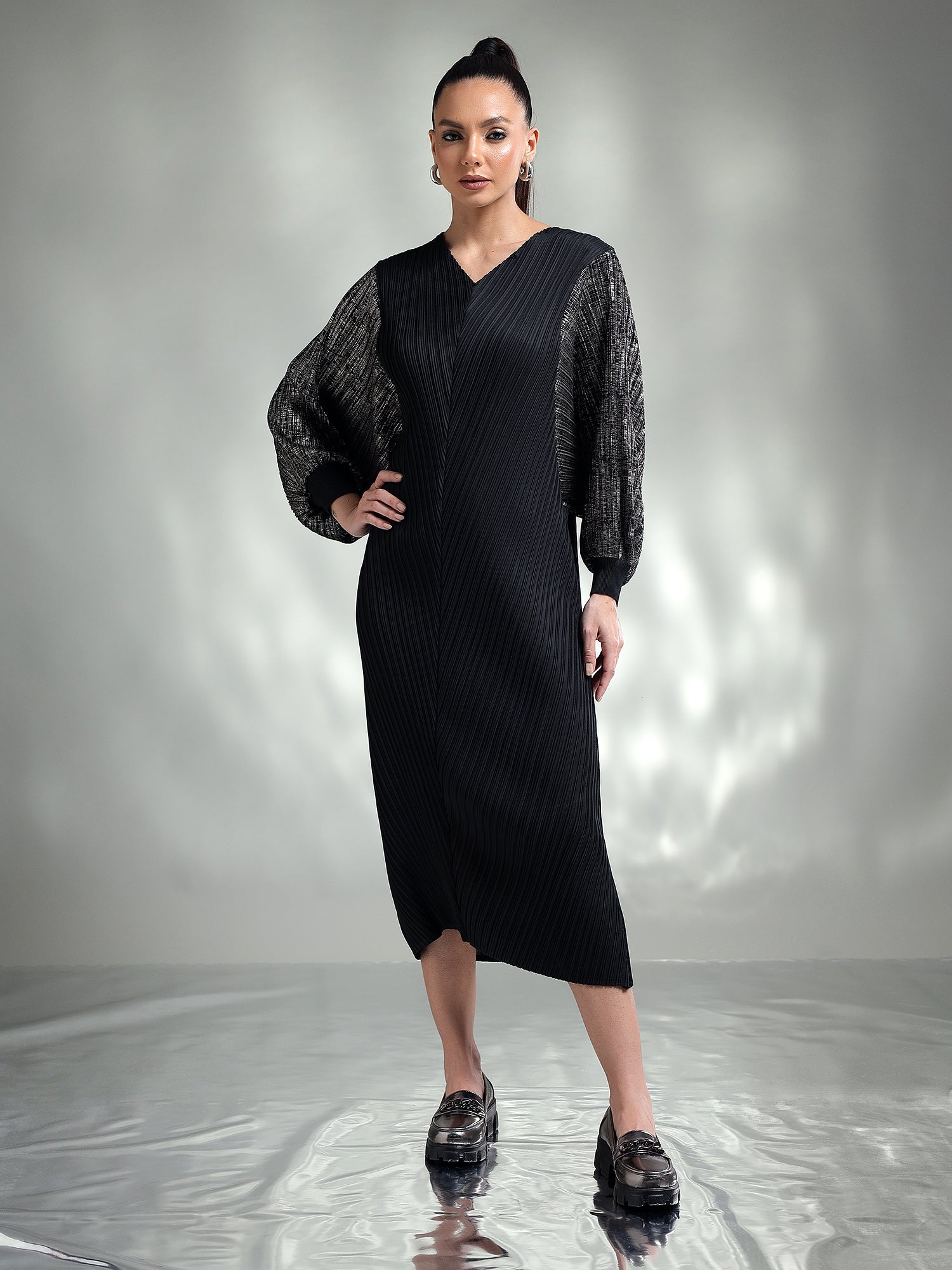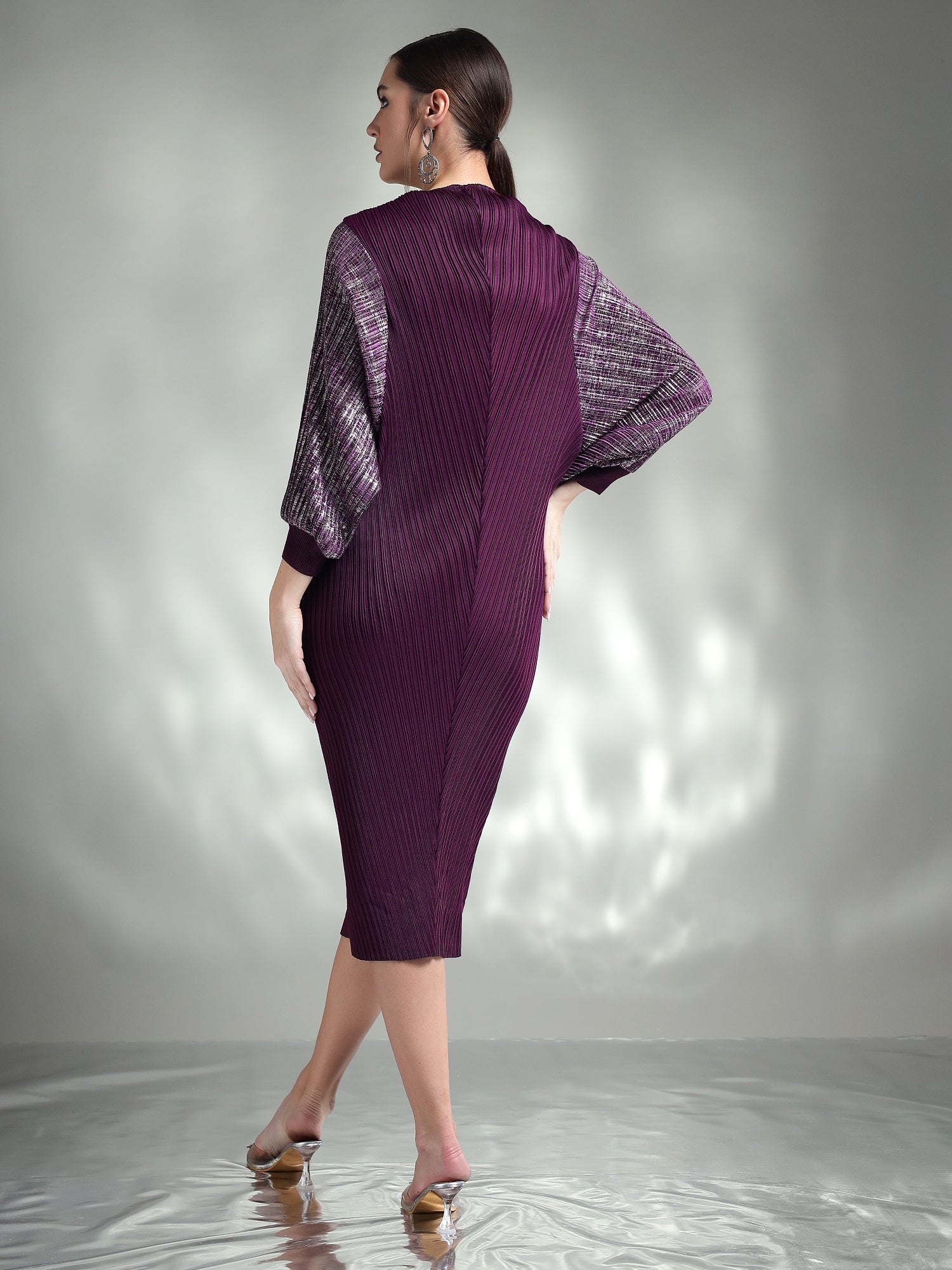 Dazzle in this sophisticated metallic dress, designed to make you the center of attention. Made from shimmering metallic fabric, this dress features flowing kaftan sleeves that add an effortless touch of elegance. The relaxed yet chic silhouette ensures both comfort and style, making it ideal for special occasions.