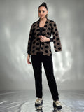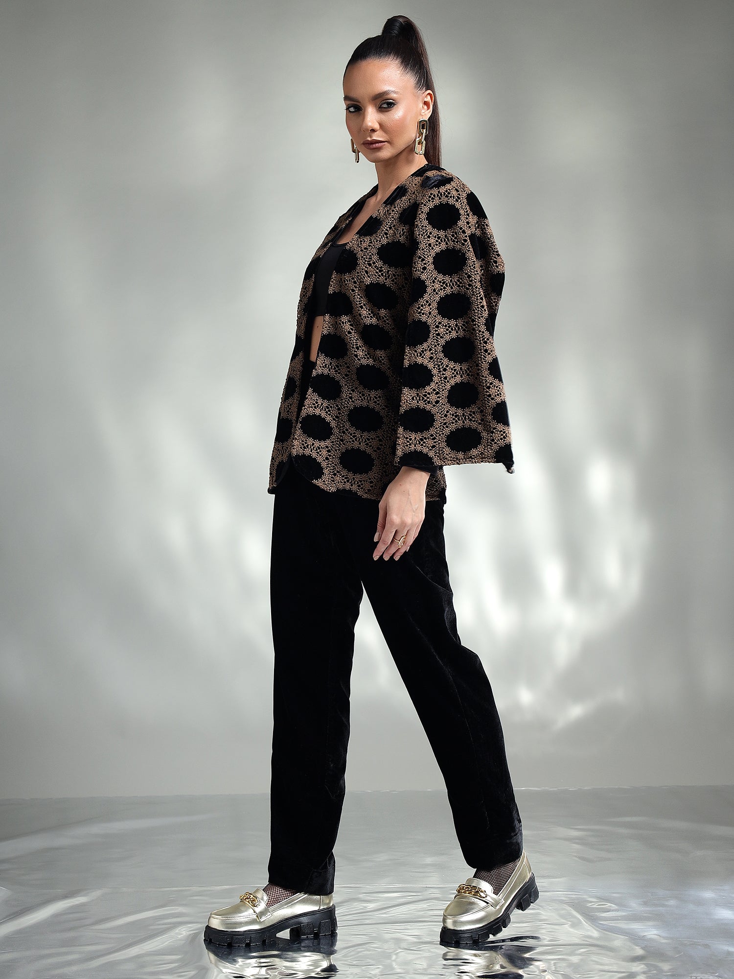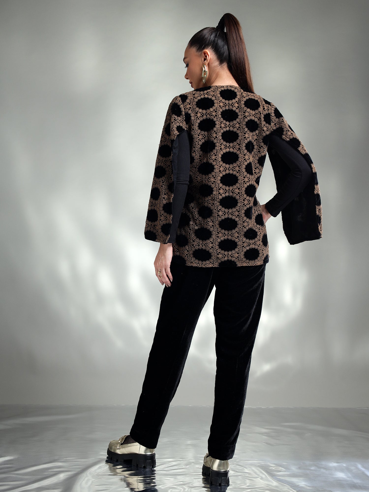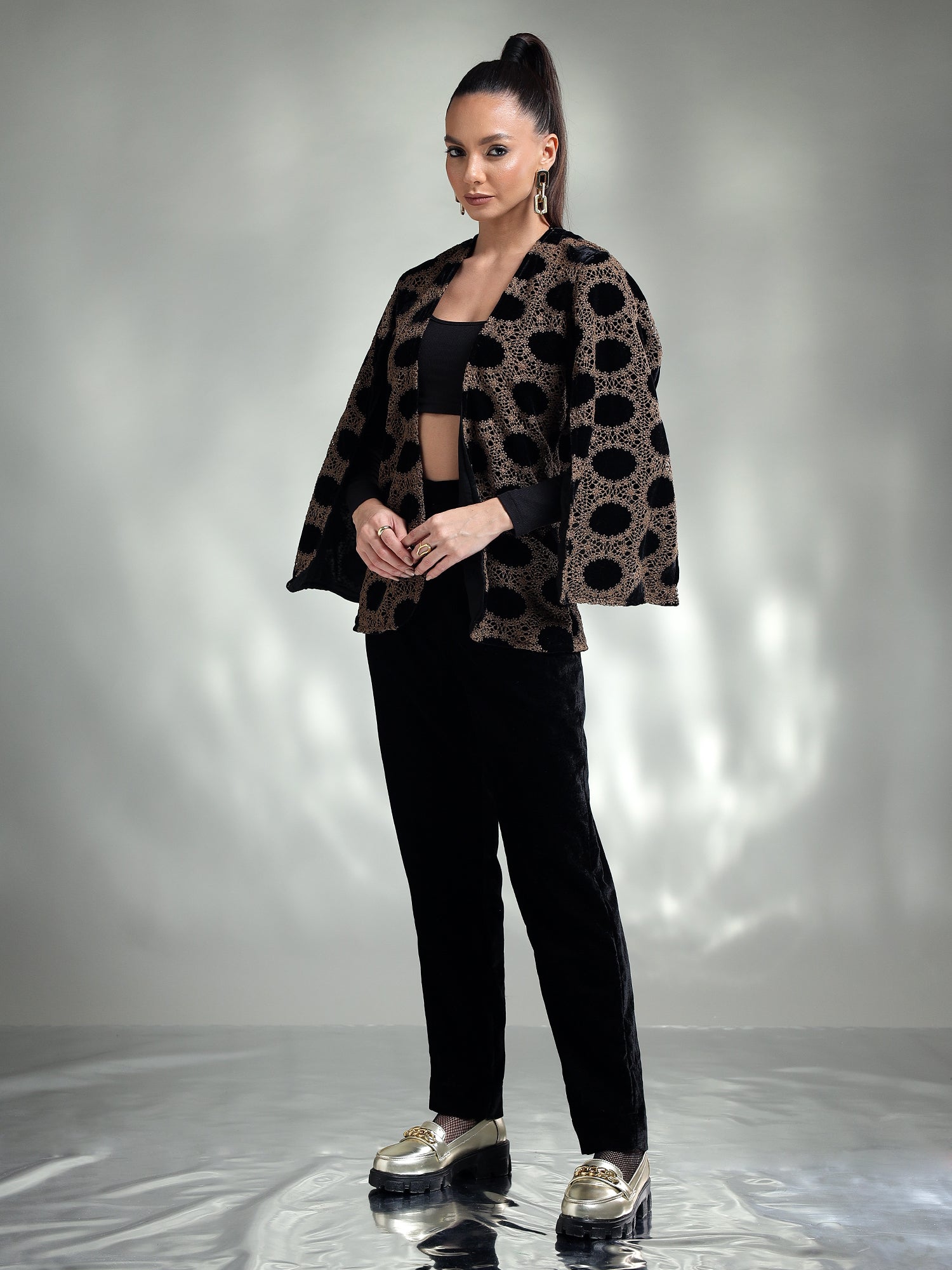 This exquisite black and brown velvet open jacket redefines elegance with its rich textures and intricate craftsmanship. The luxurious velvet fabric forms the perfect canvas for delicate detailing, blending sophistication with artisanal artistry. The interplay of deep black and earthy brown tones creates a dramatic and timeless aesthetic, ideal for making a bold yet refined style statement.