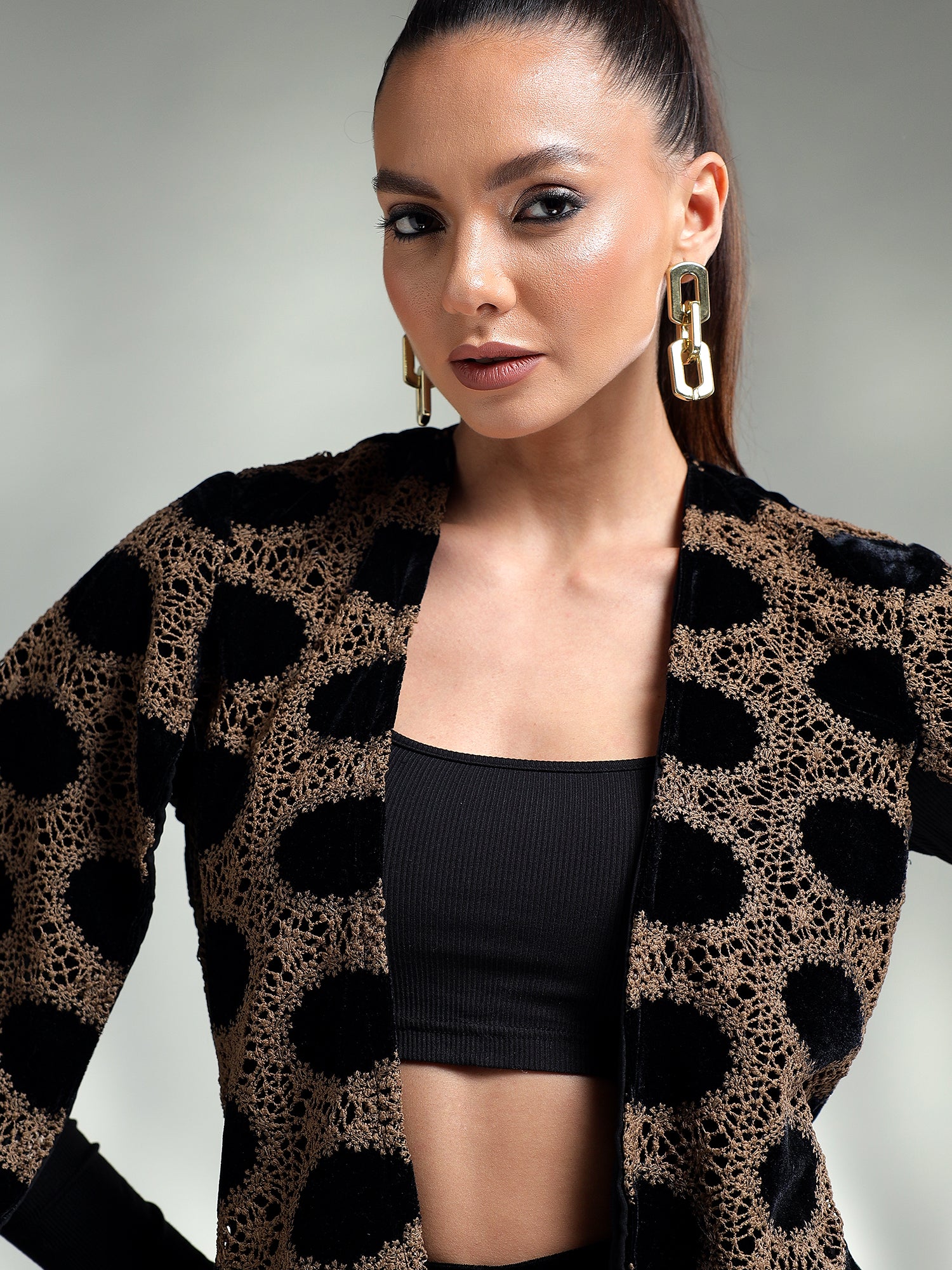 The jacket is adorned with intricate crochet work, showcasing impeccable craftsmanship that adds texture and depth to the design. This is further enhanced by velvet cutwork detailing, which creates an interplay of light and shadow, lending an aura of opulence and finesse. The open-front design offers versatility and layering options, making it a stunning addition to any wardrobe.