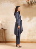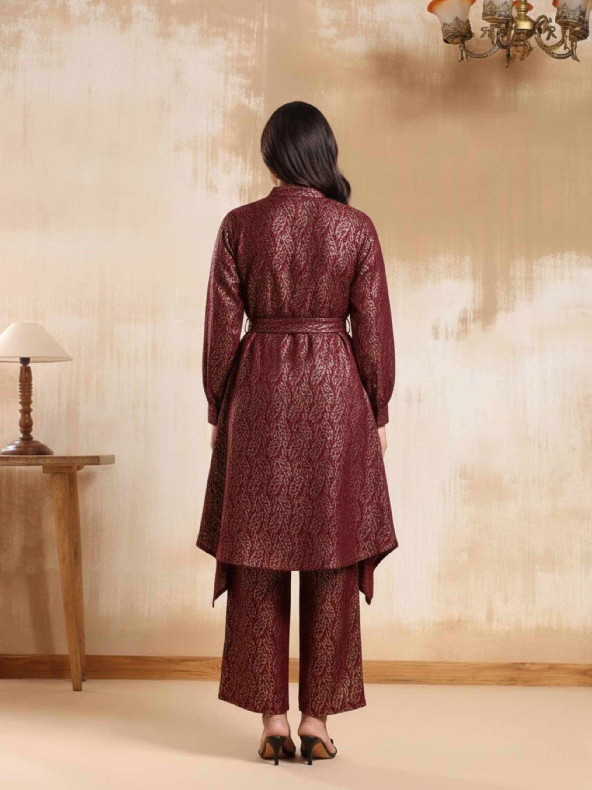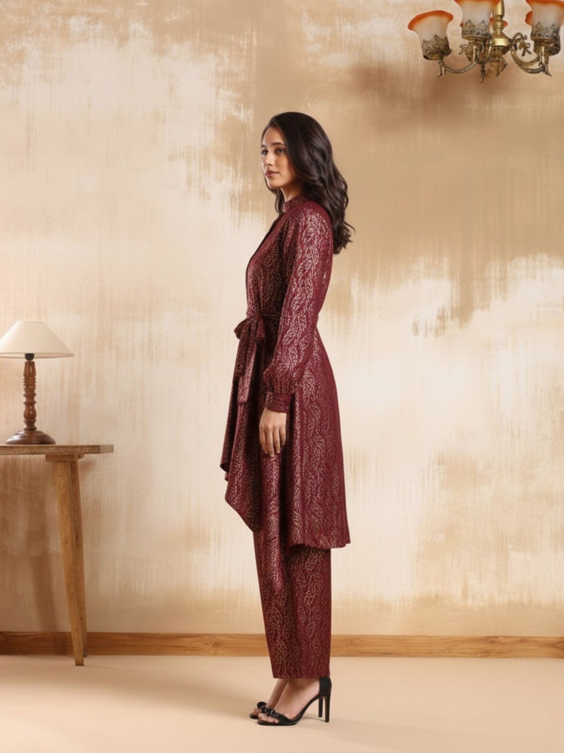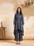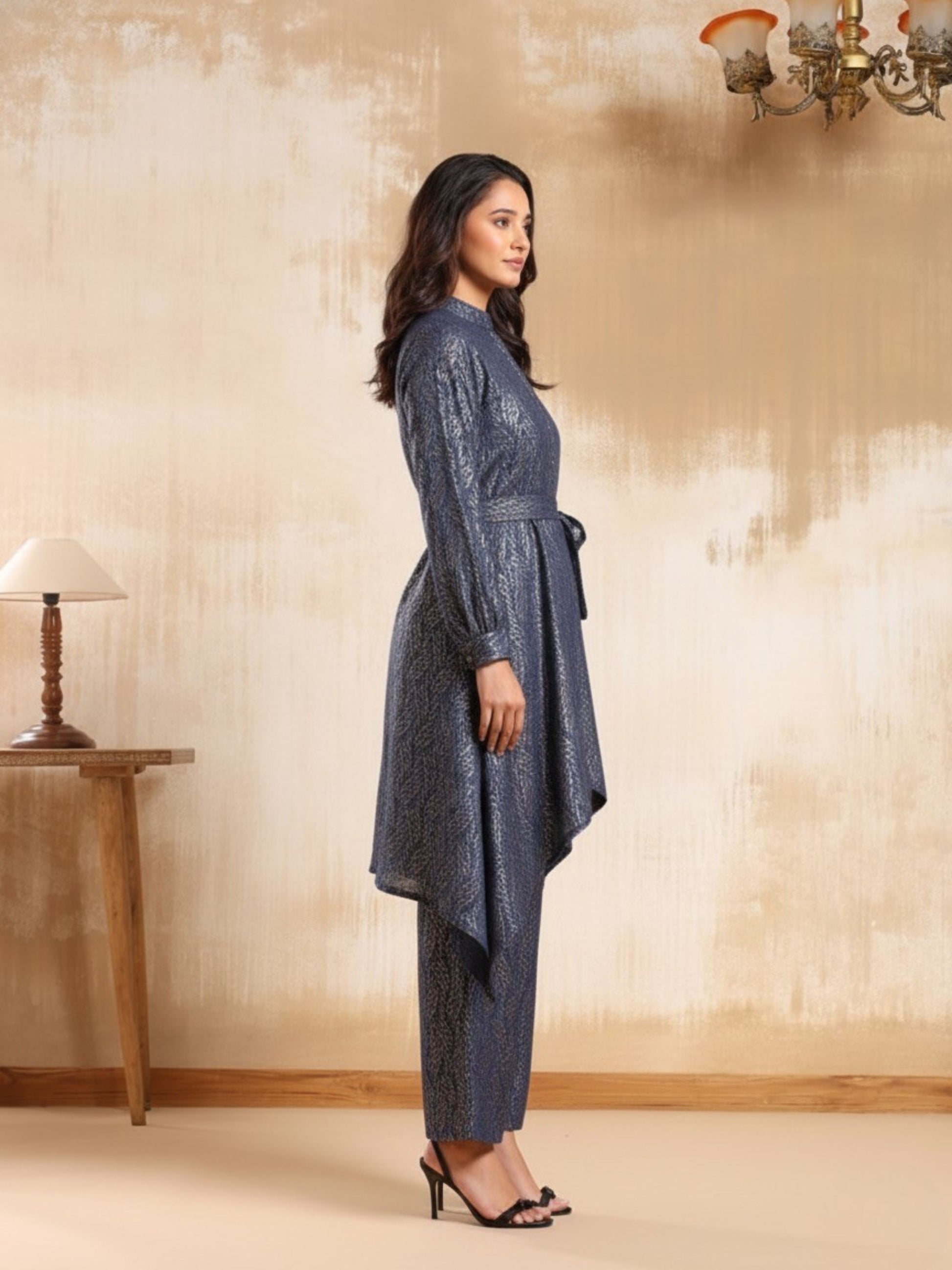 Elevate your festive-winter wardrobe with this stunning metallic jacquard co-ord. Crafted in a deep midnight blue with subtle gold accents, the set features a flowy asymmetrical tunic paired with straight-fit trousers for effortless elegance. The high-neck detail and self-tie waist create a structured yet feminine shape, while the rich fabric adds a touch of understated luxury. Perfect for evening gatherings, intimate celebrations, and elevated winter dressing.