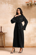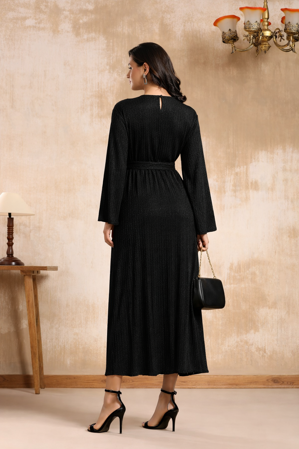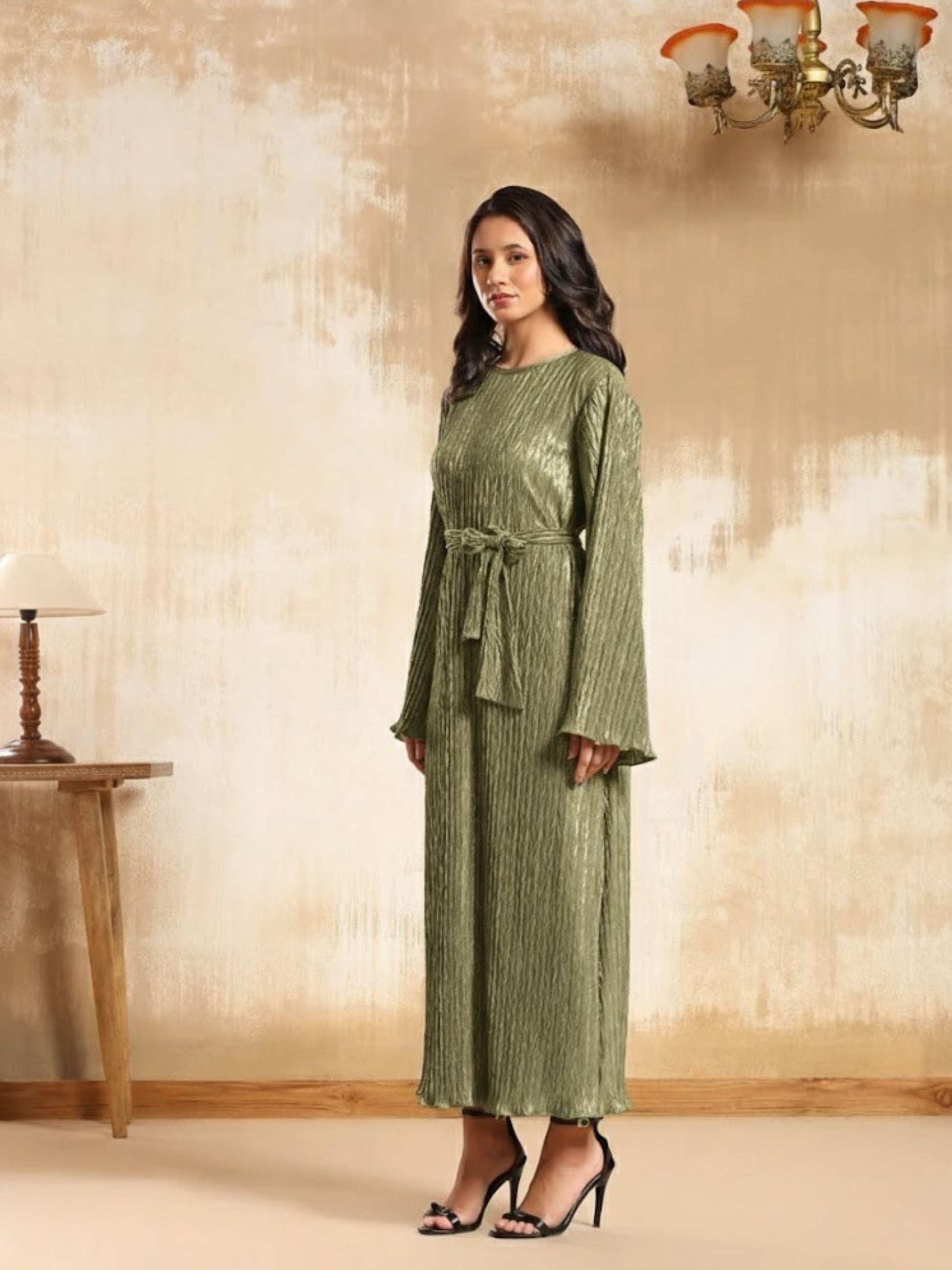 Make a graceful statement in our Lume Shimmer Dress, designed in a soft pleated metallic fabric that shimmers subtly with movement. The full-length silhouette drapes beautifully, while the self-tie belt cinches the waist for a flattering, feminine shape. Featuring long sleeves and a round neckline, this dress blends comfort and sophistication — perfect for evening occasions, festive gatherings, or modern celebrations.