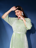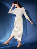 The pleated skirt flows gracefully, offering both movement and elegance, while the metallic sheen of the fabric catches the light beautifully, ensuring all eyes are on you. The color options allow you to choose a hue that best complements your style and personality, whether it’s the regal purple, the vibrant green, or the classic ivory.