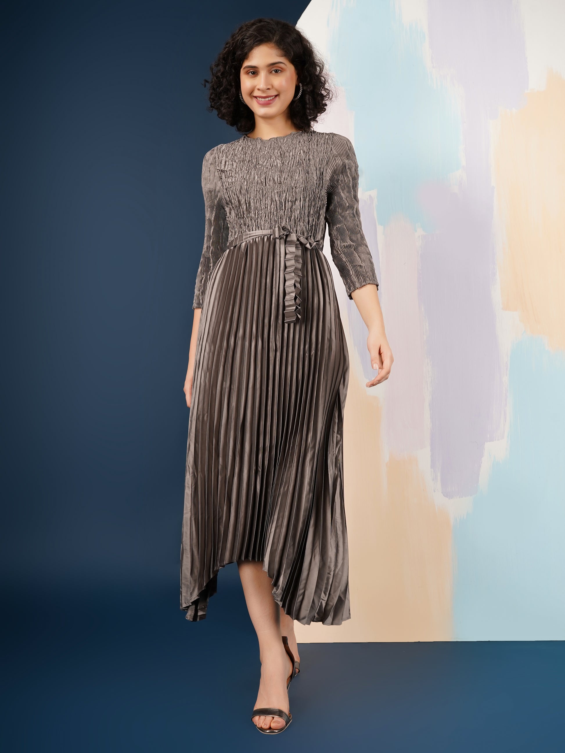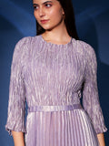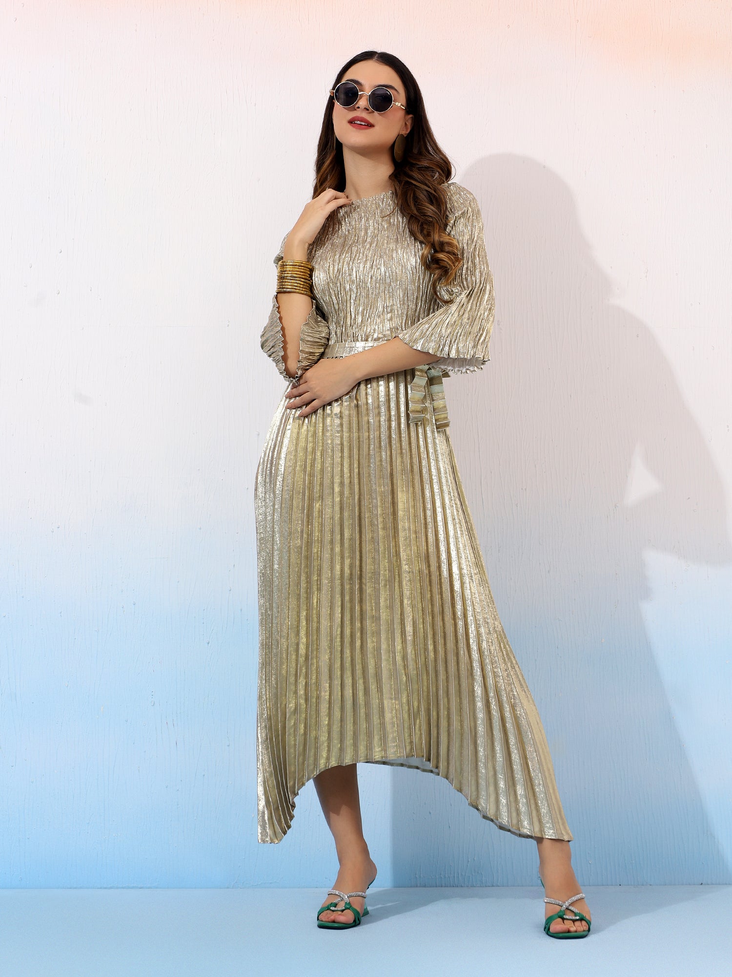 Step into the spotlight with this captivating metallic dress, available in stunning shades of purple, green, and ivory. This dress is a perfect blend of glamour and sophistication, designed to make you shine at any event. The bodice features a unique crushed texture that adds depth and dimension, creating a striking contrast with the smooth, pleated skirt.