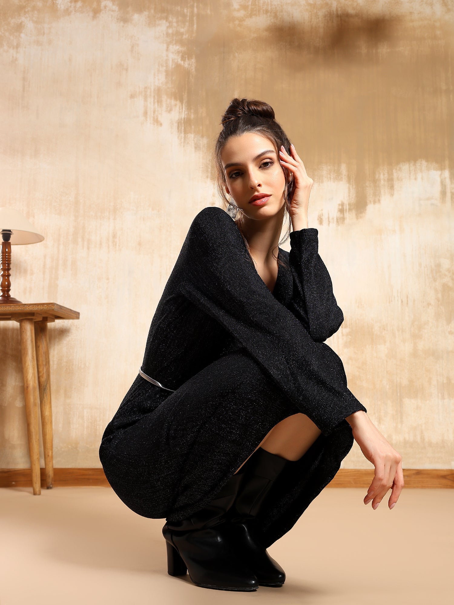 The Lunet Drape Dress embodies effortless sophistication with a touch of subtle allure. Crafted from a soft metallic stretch knit, it features a gentle shimmer that catches the light evoking the quiet elegance of moonlit nights. The draped detailing at the waist enhances the natural silhouette, while the V-neckline and long sleeves create a balance of comfort and refinement.