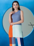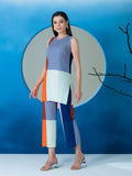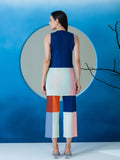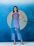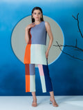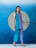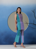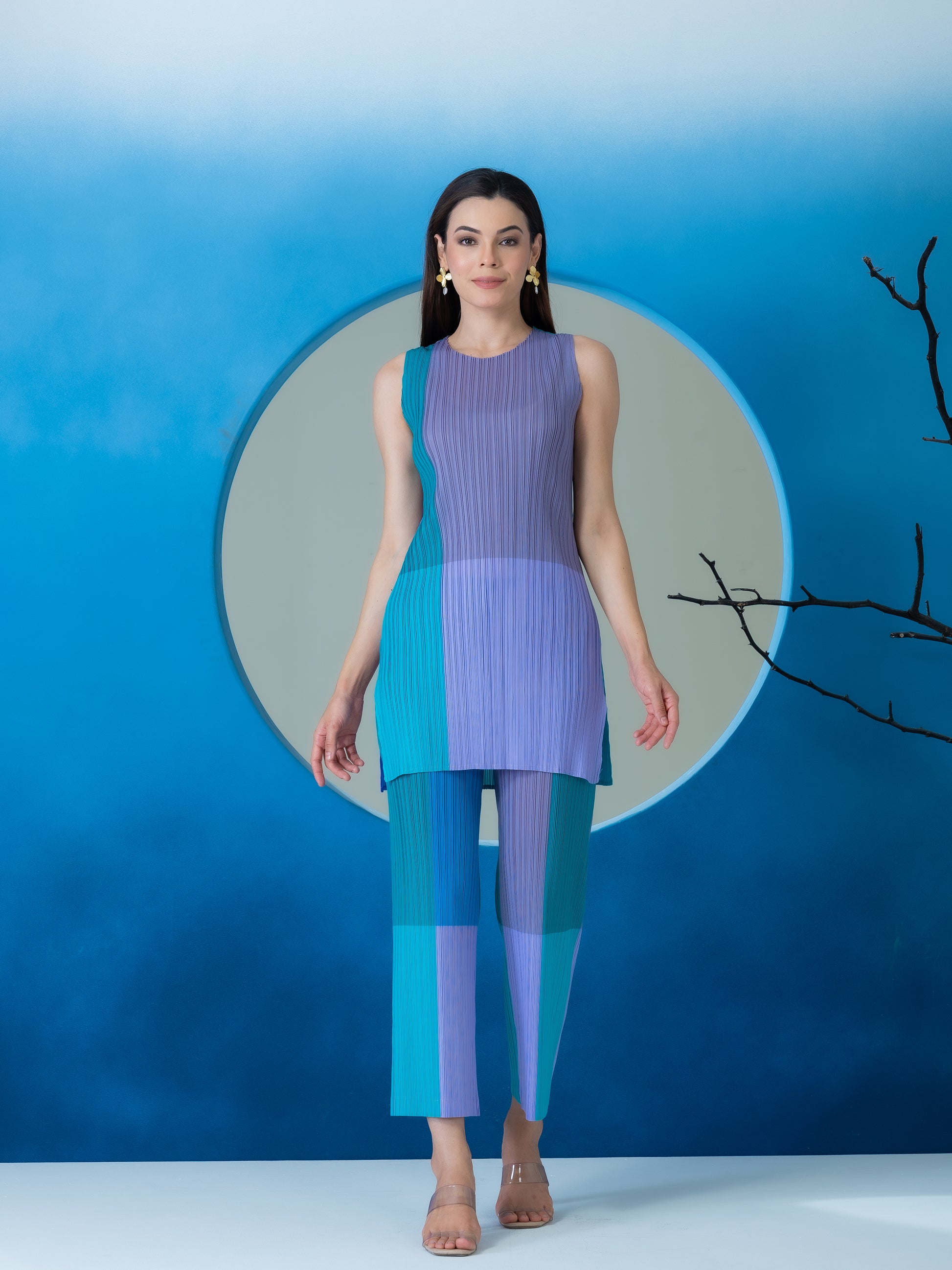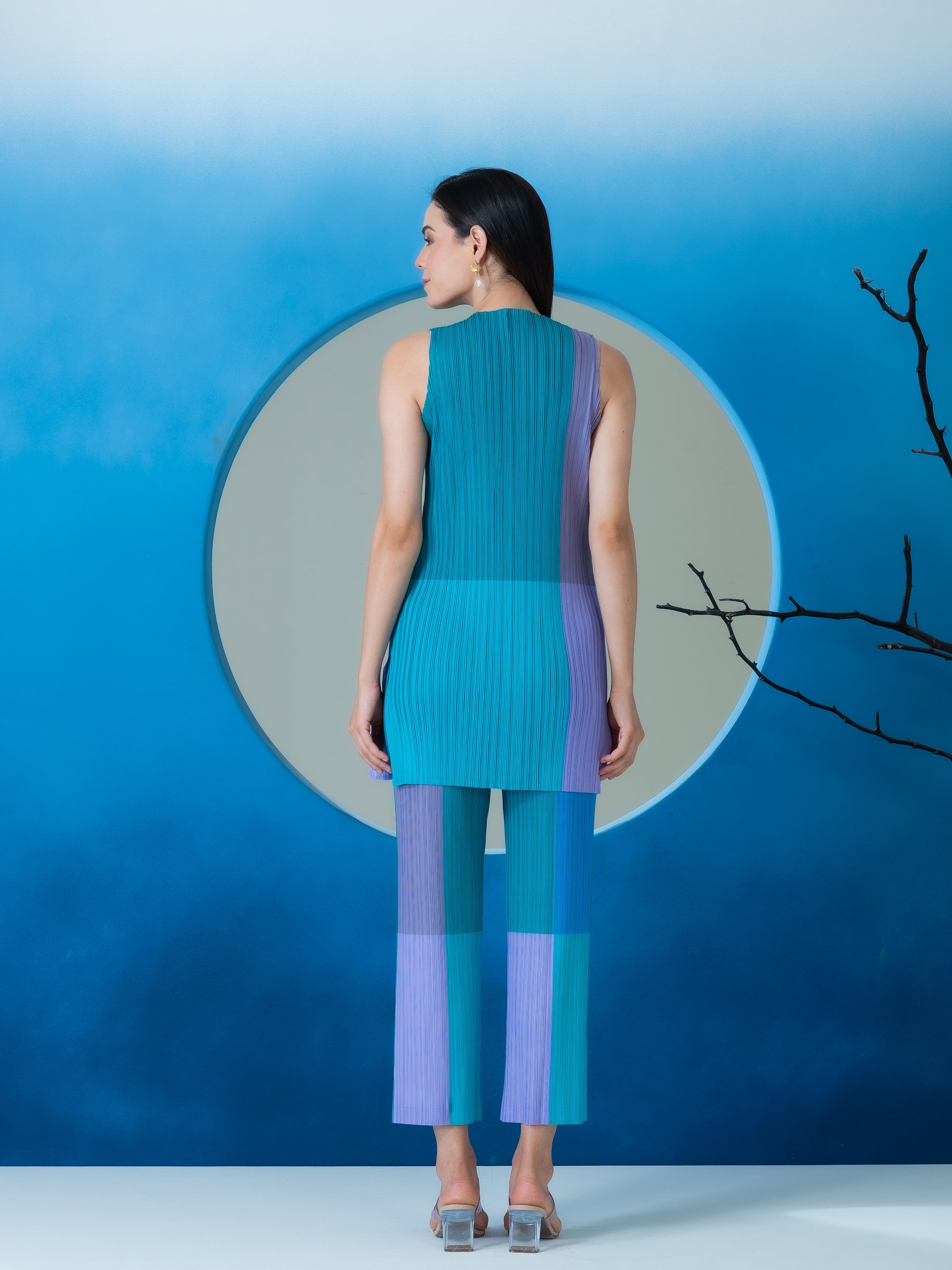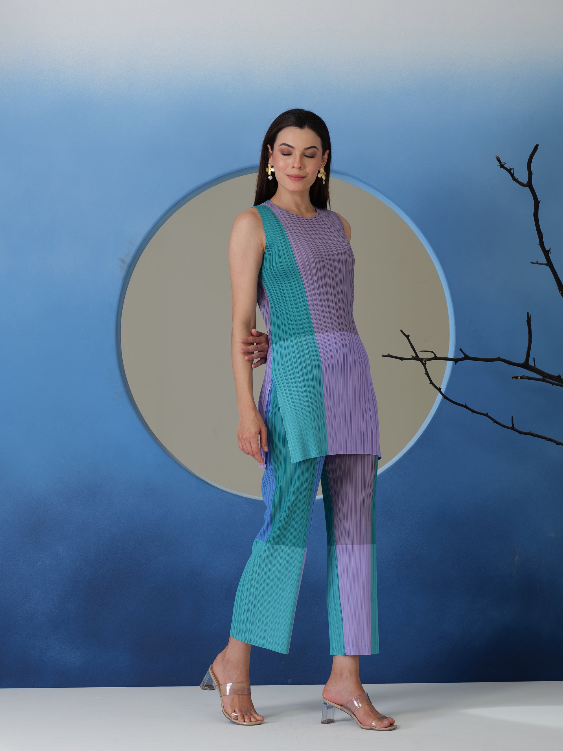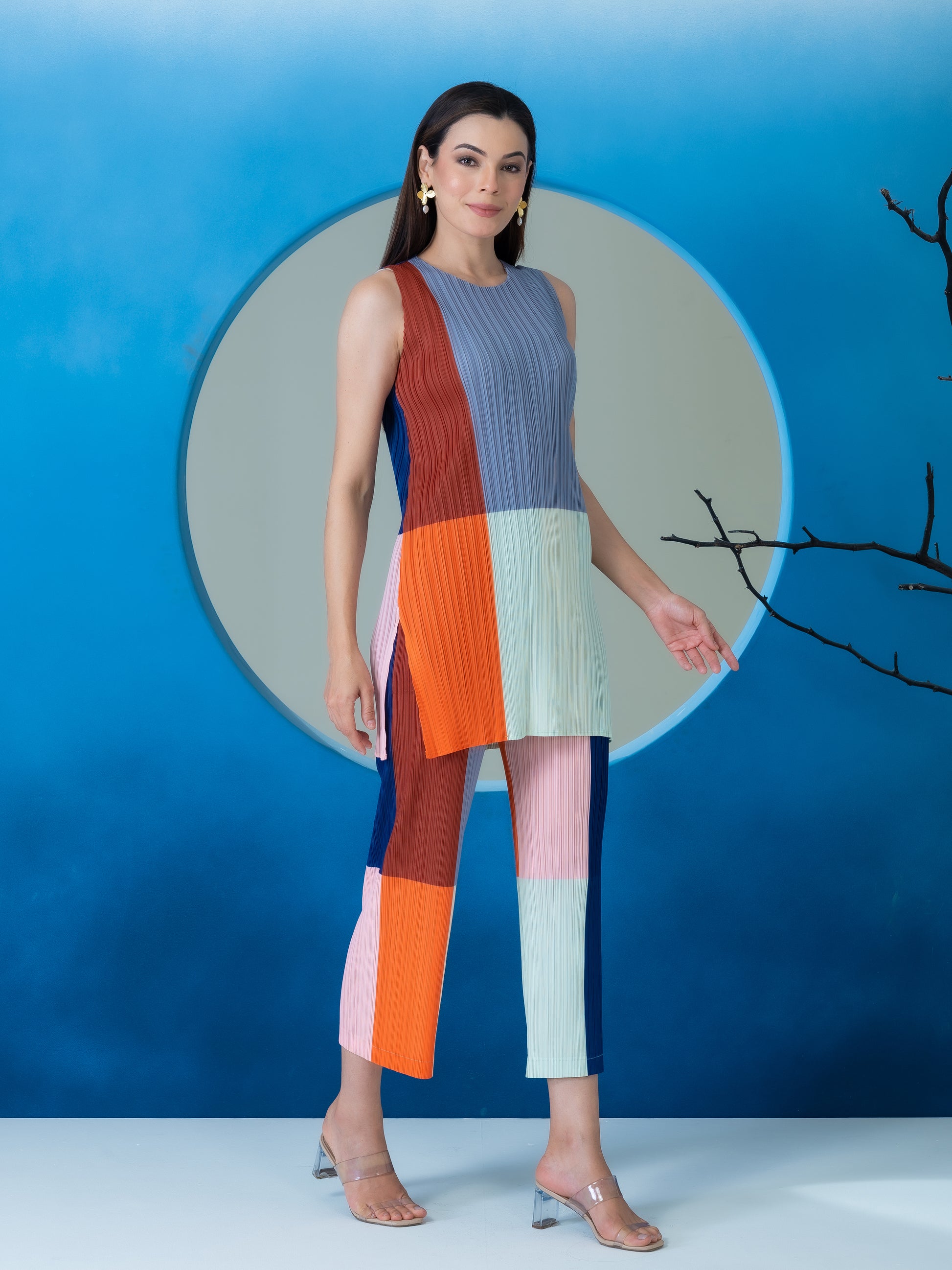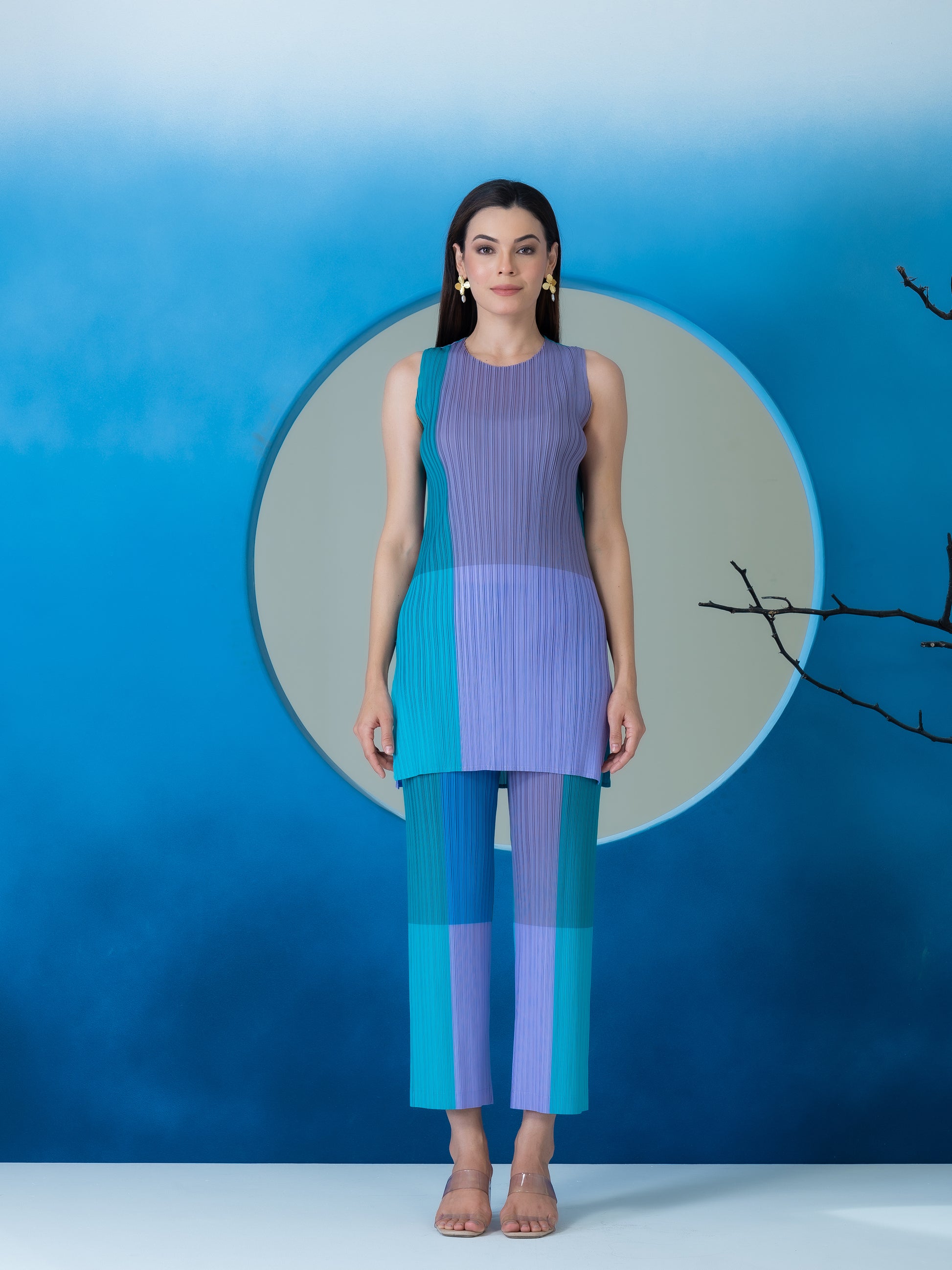 The Majesty Co-Ord set features a sleek, sleeveless top with vertical pleating that creates a slender silhouette. The top's color-block pattern showcases sharp lines and bold contrasts, exuding confidence and poise. The high neckline adds a touch of sophistication, making it an ideal piece for refined layering or standalone wear.