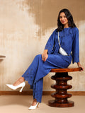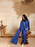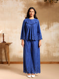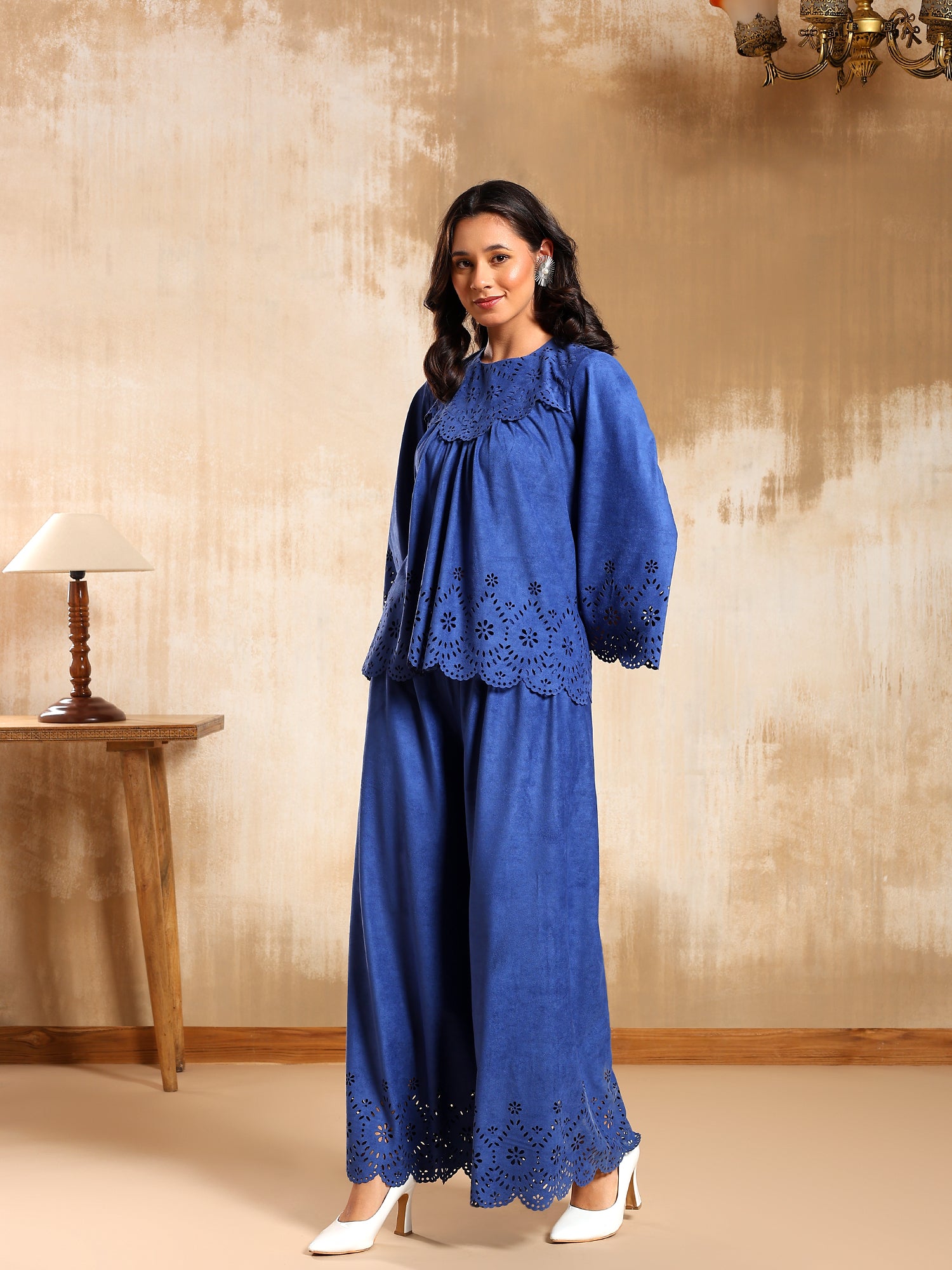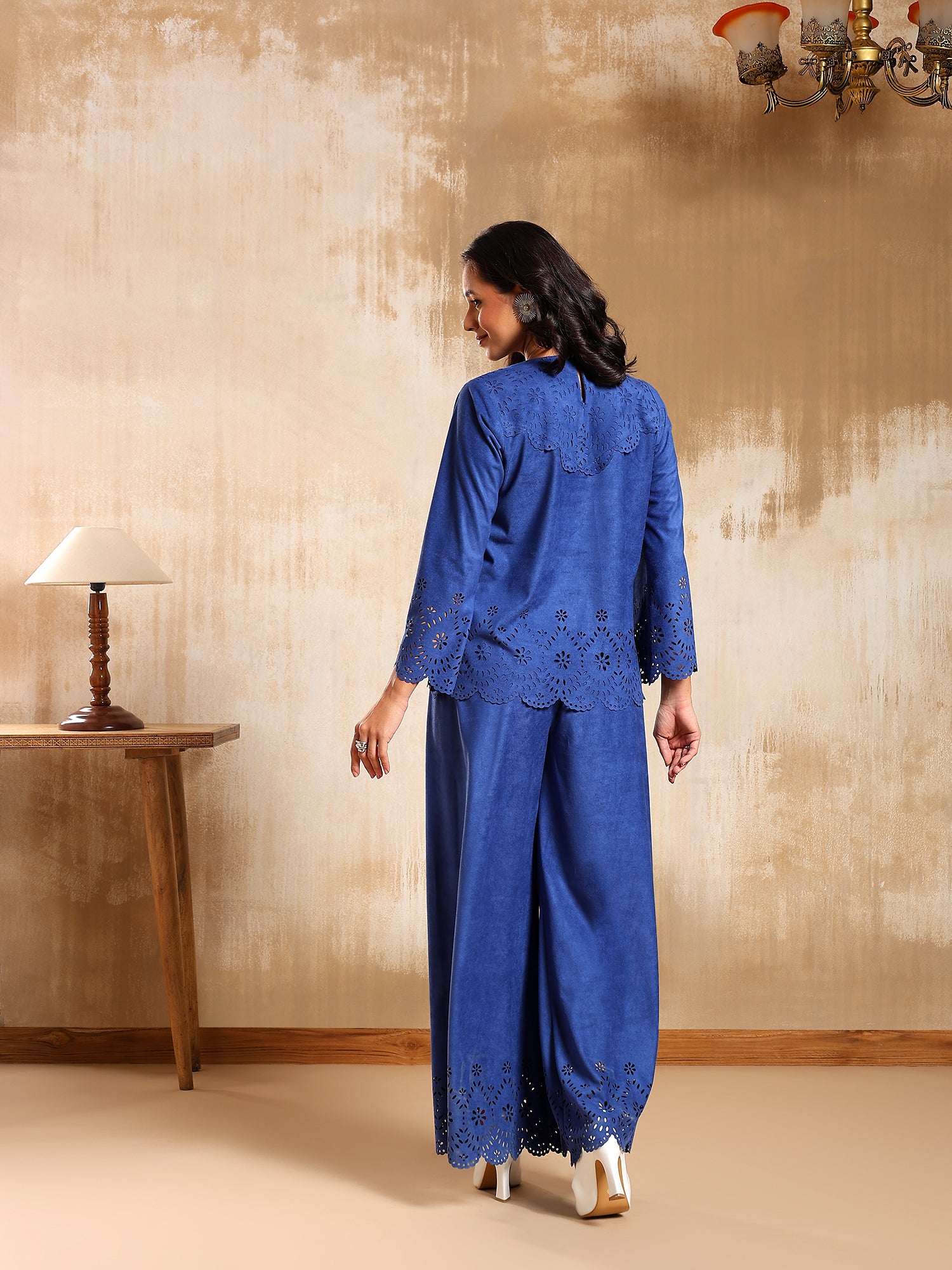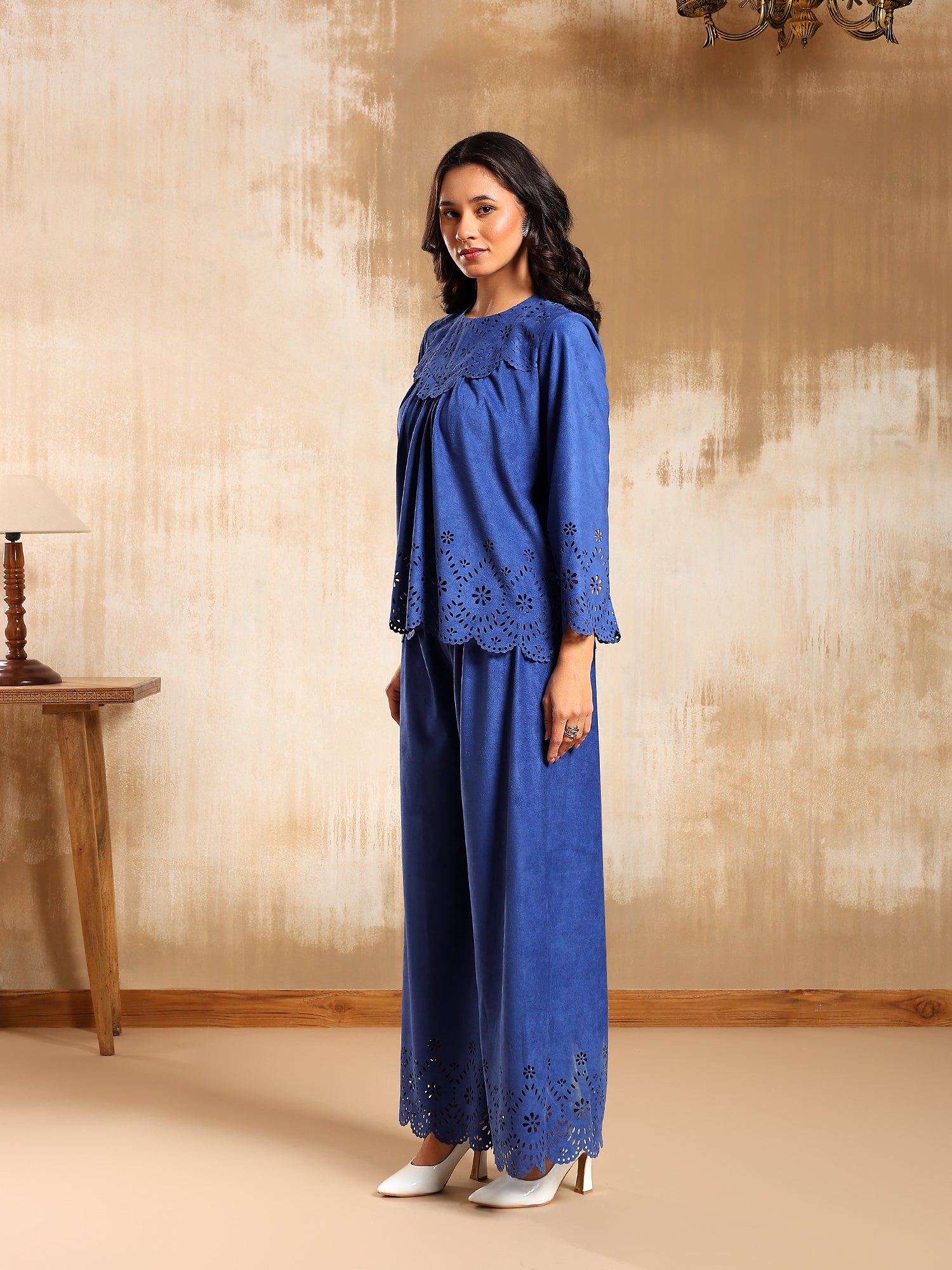 Crafted in soft suede fabric, this co-ord set brings warmth and elegance together for the season. The deep azure blue hue adds a touch of sophistication, while intricate laser-cut floral detailing enhances its charm. The top features a relaxed silhouette with a scalloped hem and matching cutwork on the sleeves, perfectly paired with straight-fit pants adorned with coordinated hem detailing. Ideal for cozy winter outings or effortless day-to-night transitions.