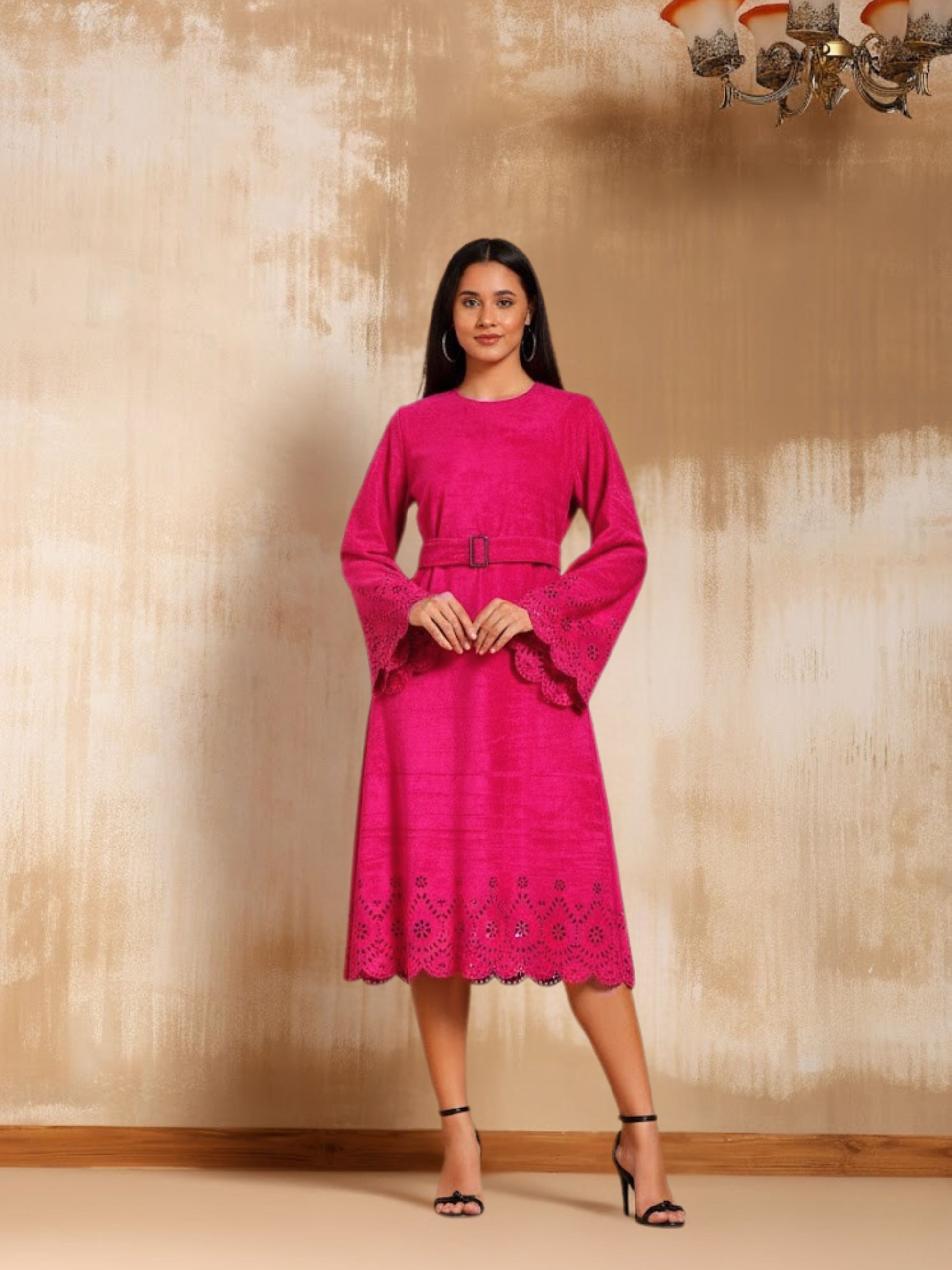 Elegance meets comfort in our Marin Cutwork Dress. Crafted from ultra-soft suede, this dress features delicate laser-cut floral details along the hem and sleeves for a touch of femininity. The belted waist flatters your silhouette, while the full sleeves and classic round neckline add timeless sophistication. Perfect for cozy winter evenings or refined daytime outings, this piece brings warmth and understated luxury to your wardrobe.