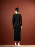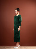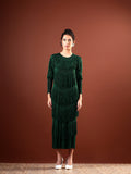Graceful and fluid, this fringe midi dress is designed to move beautifully with every step. Crafted in a soft, flowy fabric, it features layered fringe detailing across the bodice and skirt, creating texture, rhythm, and subtle drama. The clean round neckline and full sleeves balance the statement fringe with a refined silhouette, while the midi length keeps it effortlessly elegant. Perfect for evening gatherings, festive occasions, or elevated celebrations, this dress is a timeless blend of sophistication and movement