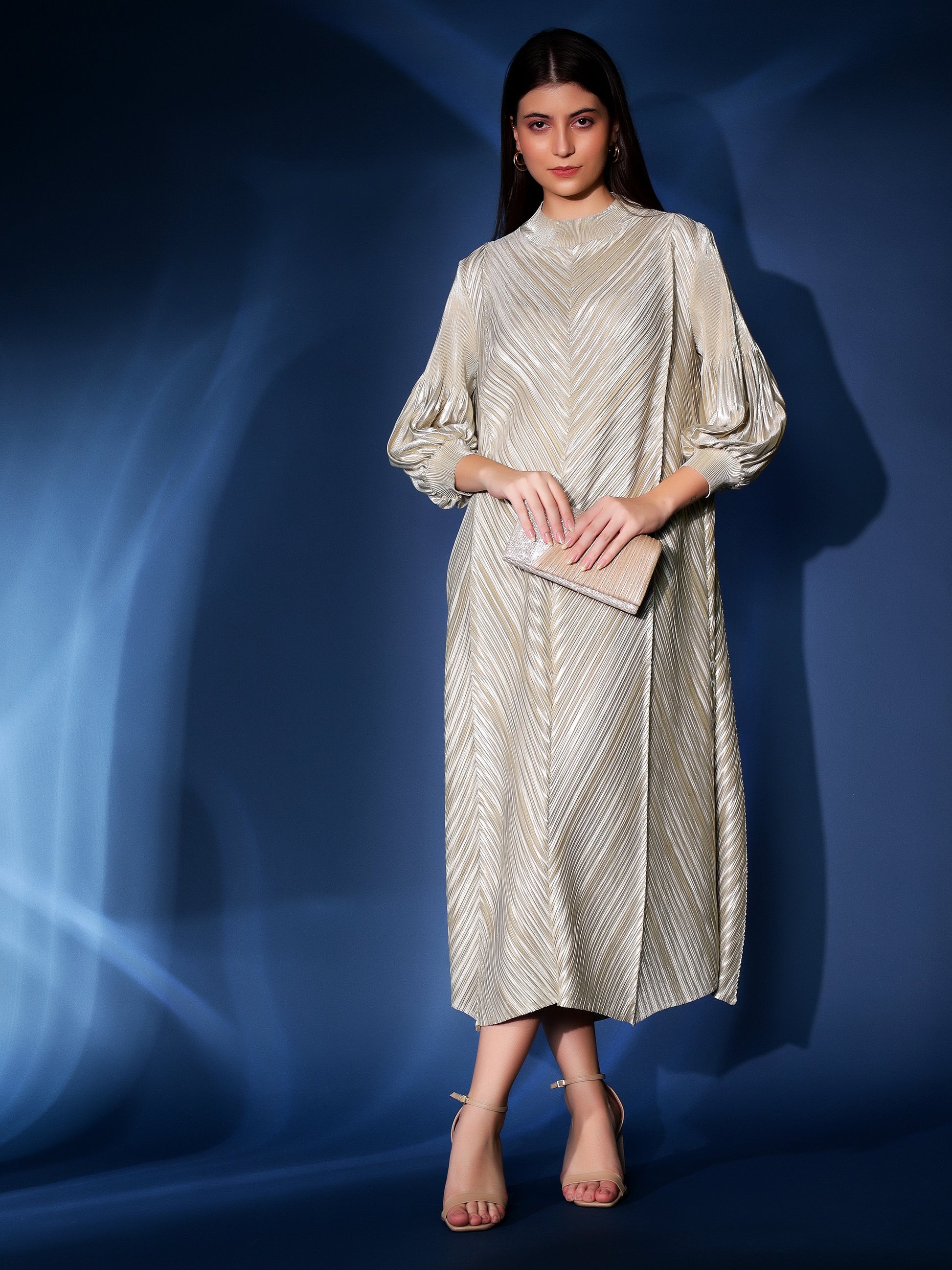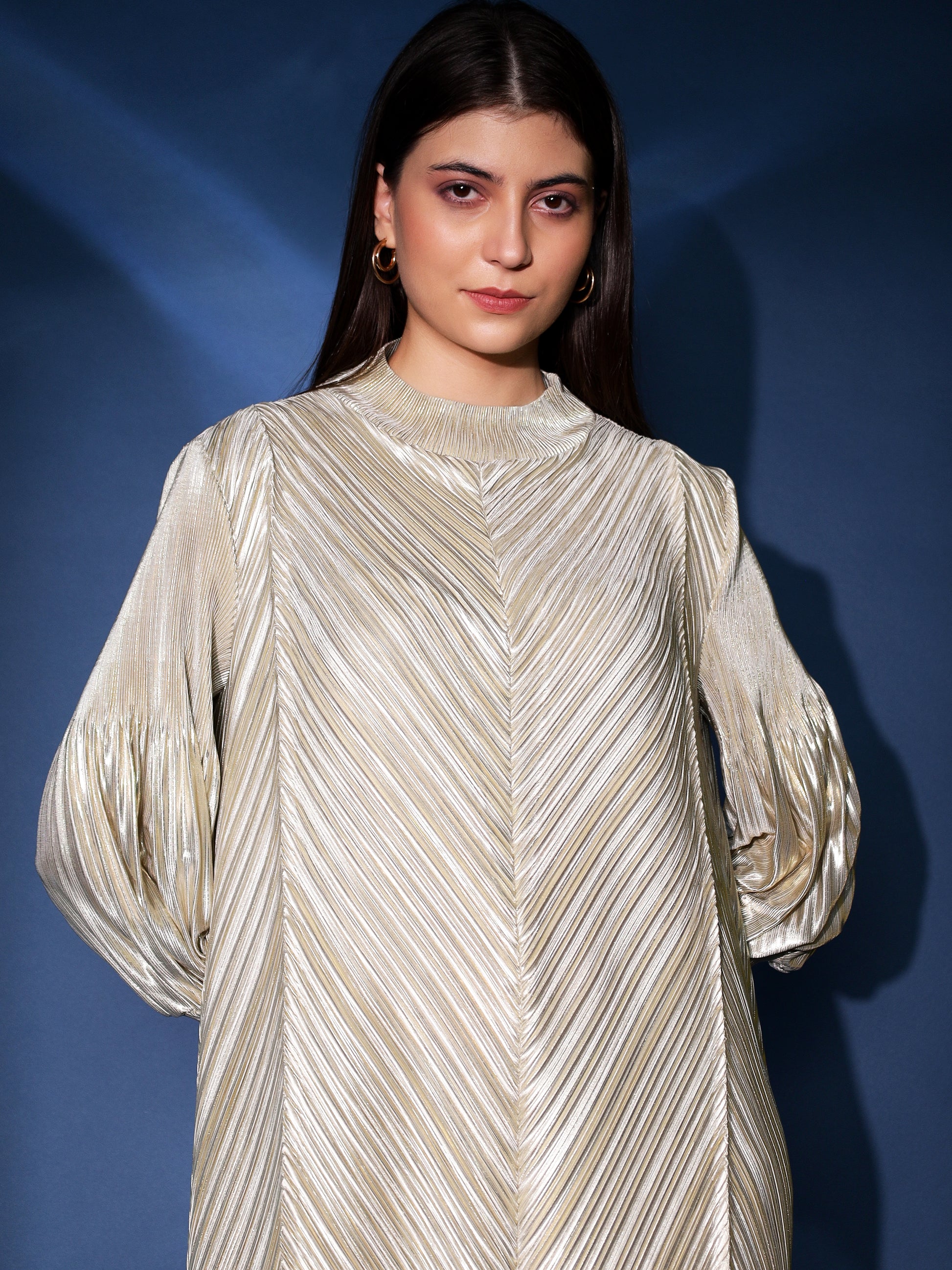 Crafted from a luxurious fabric that skims gracefully over the body, the Nahria Dress features a sophisticated mid-length cut and an alluring high neckline. Its intricate pleated design not only adds an element of texture and depth but also flatters the figure, creating a silhouette that is both modern and timeless.