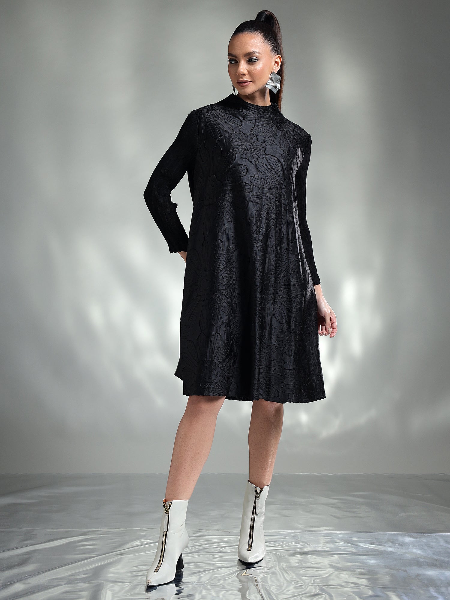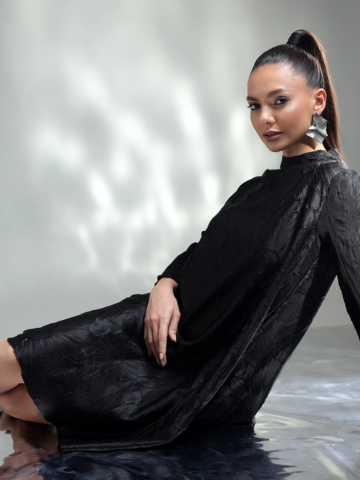 This elegant dress exudes refined beauty, featuring exquisite appliqué flower detailing with subtle accents that add a touch of sophistication. The dress is designed with crushed sleeves that create a unique texture, adding an element of drama and luxury. Available in two stunning colors, Black and Rose Pink, it offers versatility for both formal and semi-formal occasions. Whether you're attending a wedding, gala, or an evening event, this dress promises to make a graceful and memorable statement.