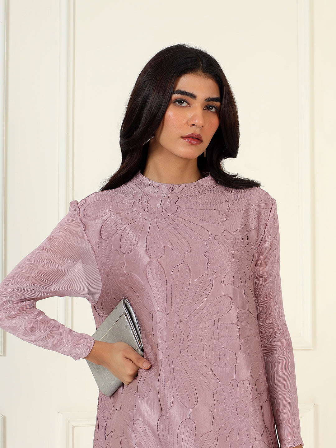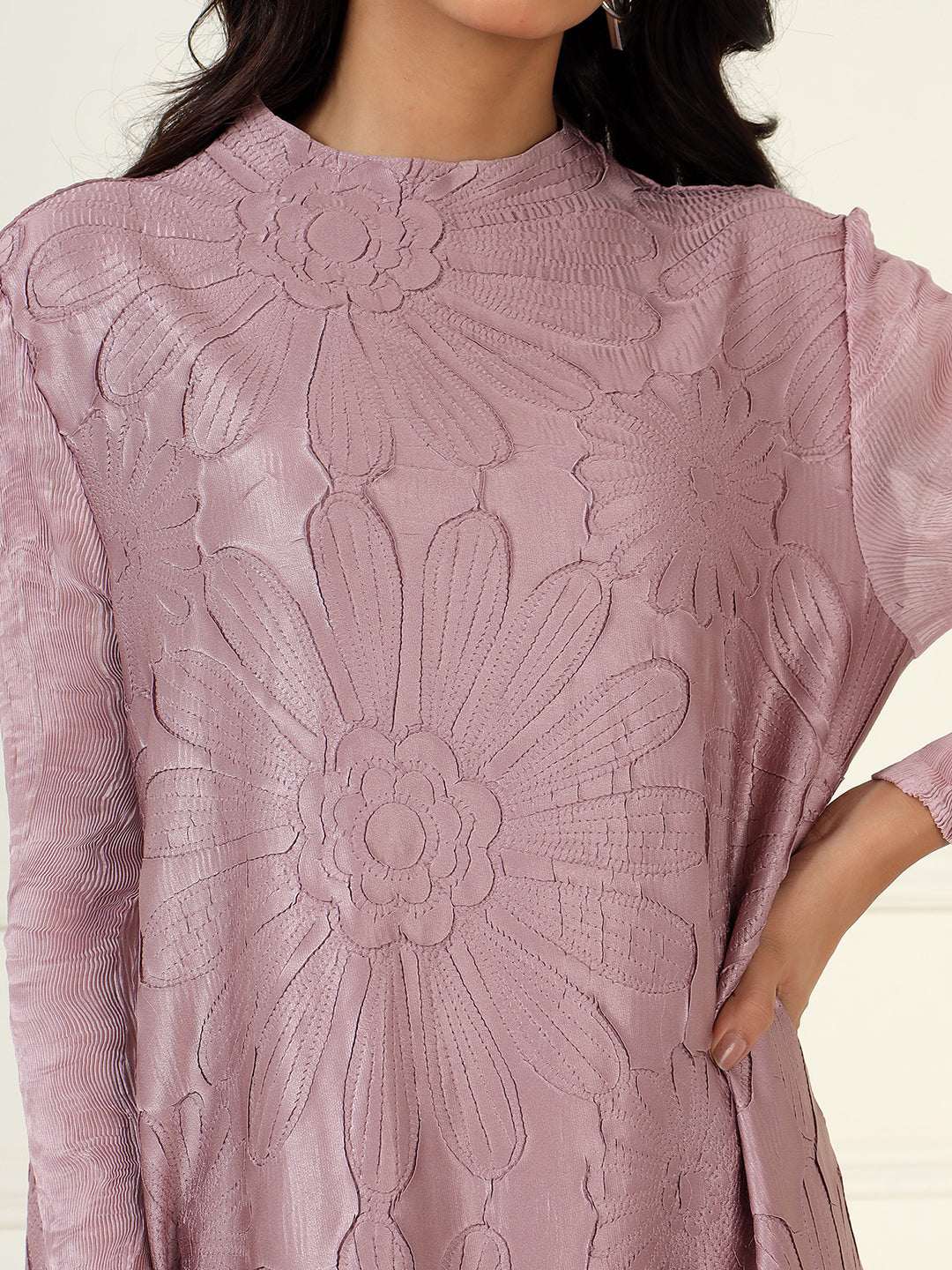This elegant dress exudes refined beauty, featuring exquisite appliqué flower detailing with subtle accents that add a touch of sophistication. The dress is designed with crushed sleeves that create a unique texture, adding an element of drama and luxury. Available in two stunning colors, Black and Rose Pink, it offers versatility for both formal and semi-formal occasions. Whether you're attending a wedding, gala, or an evening event, this dress promises to make a graceful and memorable statement.