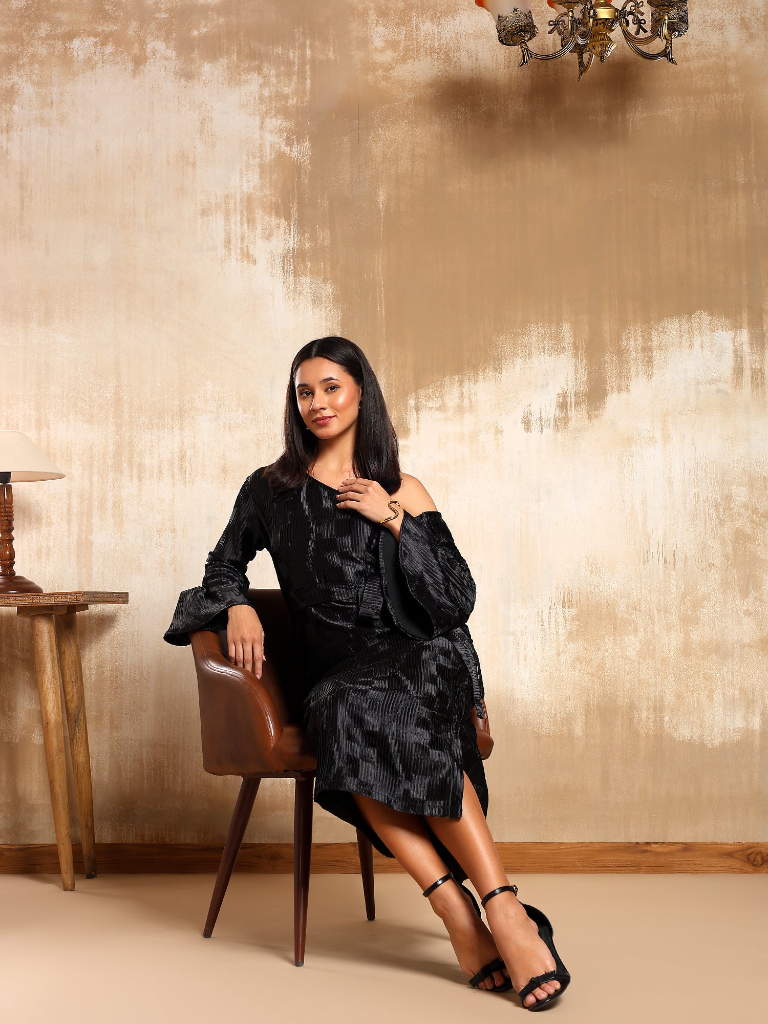 The Nora Dress is designed for effortless sophistication with its clean asymmetric neckline and single sculpted sleeve. Crafted in a soft textured jacquard, the dress drapes beautifully while adding a subtle sheen to the look. The self–tie belt enhances the waist, offering a flattering and customizable fit. Perfect for dinners, special outings, and elevated day-to-night styling, Nora is a statement piece that stays elegant, modern, and easy to wear.