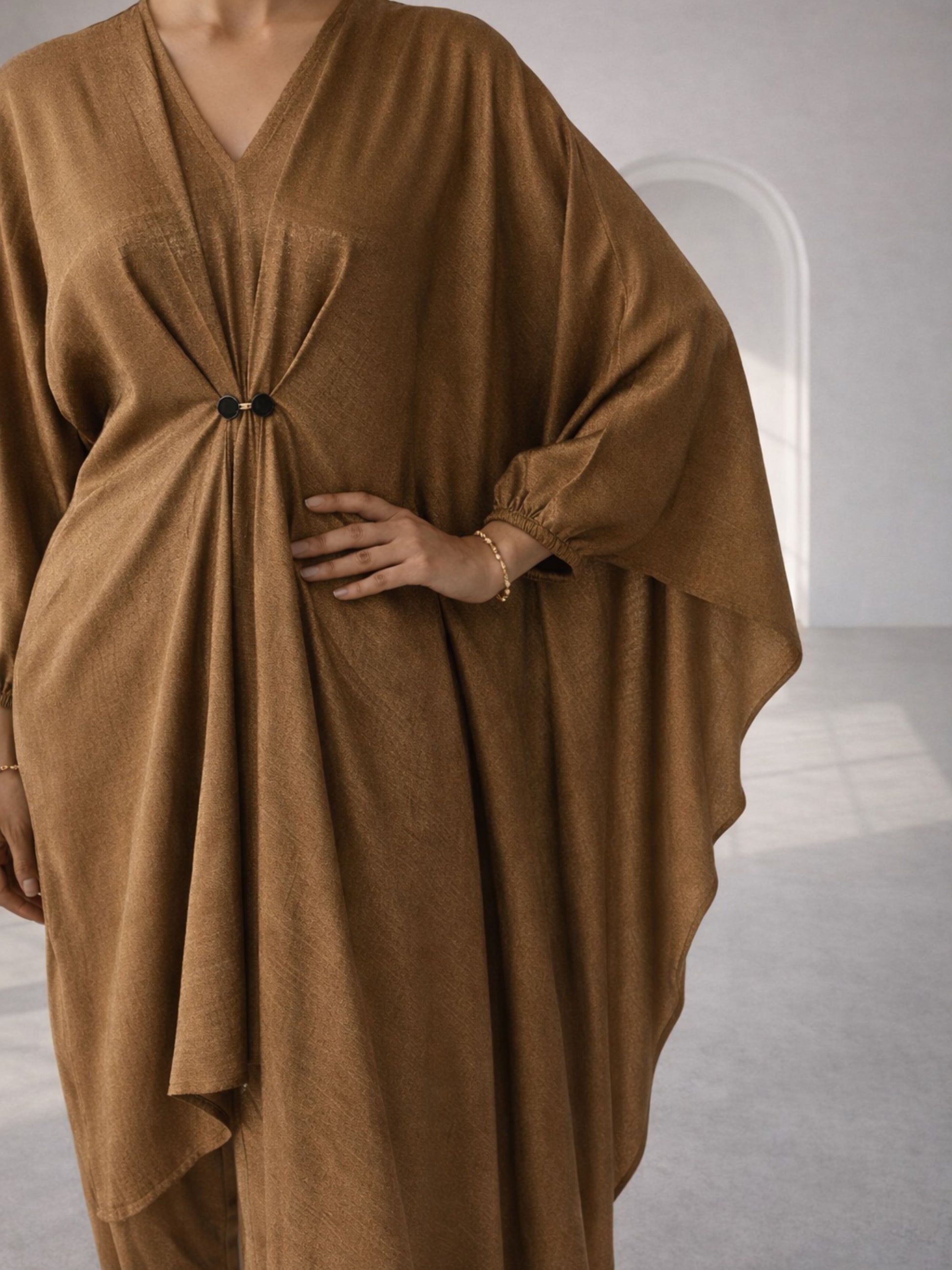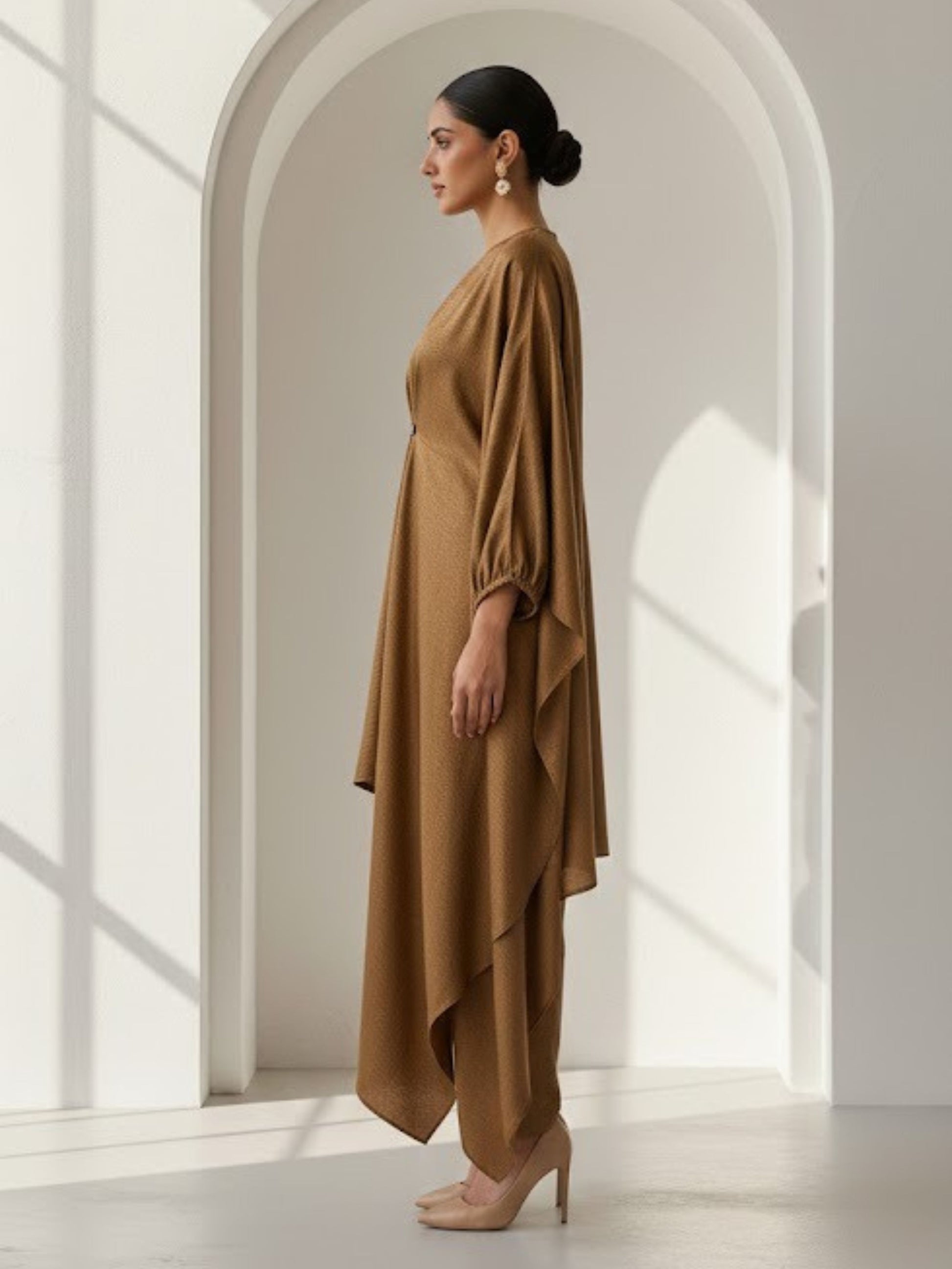 An elegant draped co-ord set featuring a fluid, asymmetric overlay tunic paired with straight, relaxed trousers. The tunic is designed with a gathered center knot detail that creates soft cascading folds, adding sculptural movement and depth. The silhouette is modest yet contemporary, blending comfort with statement draping.