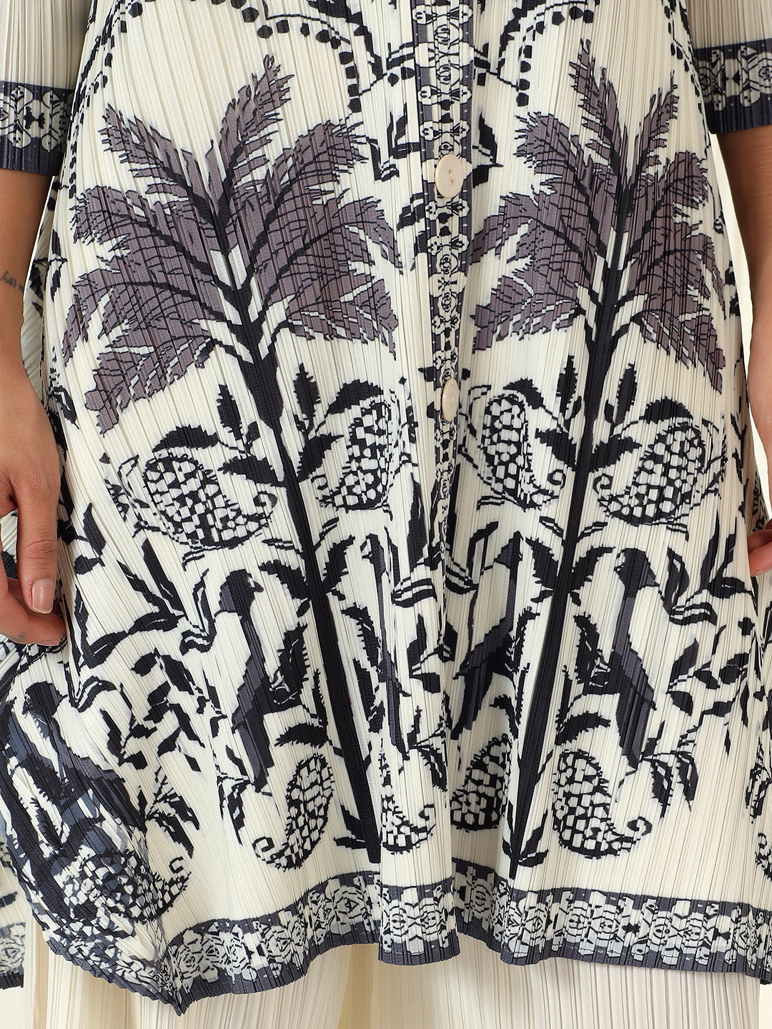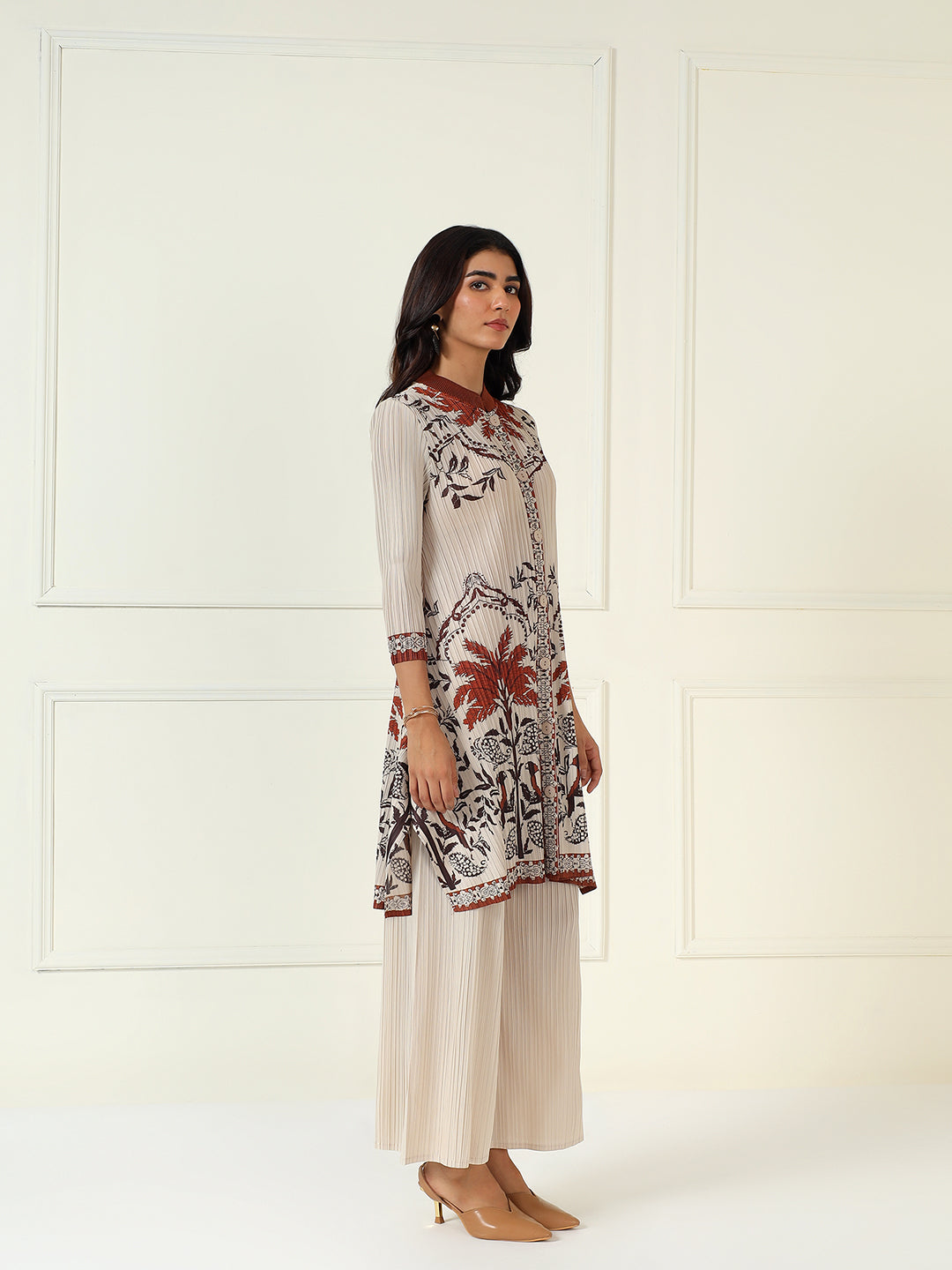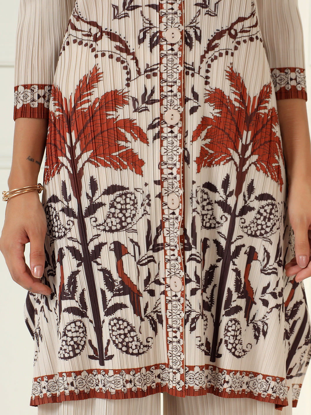 Embrace timeless elegance with the Palm Grove Coord Set, featuring a long pleated kurta with earthy palm motifs in rust and brown, paired with soft, flowy cream trousers. The collared neckline and intricate detailing bring a refined charm, making it a perfect blend of modern tailoring and traditional artistry. Ideal for workwear, casual evenings, or intimate gatherings.
