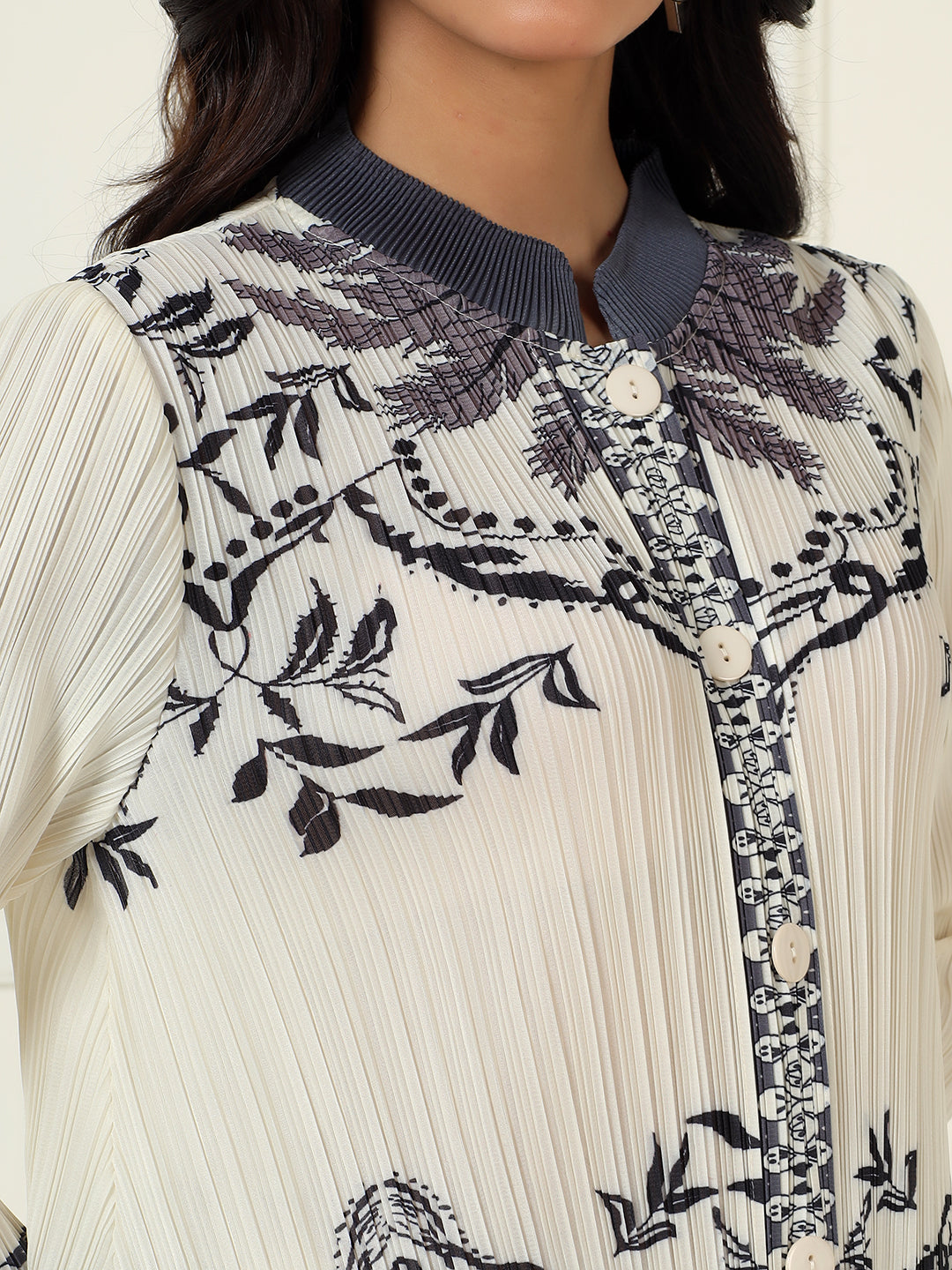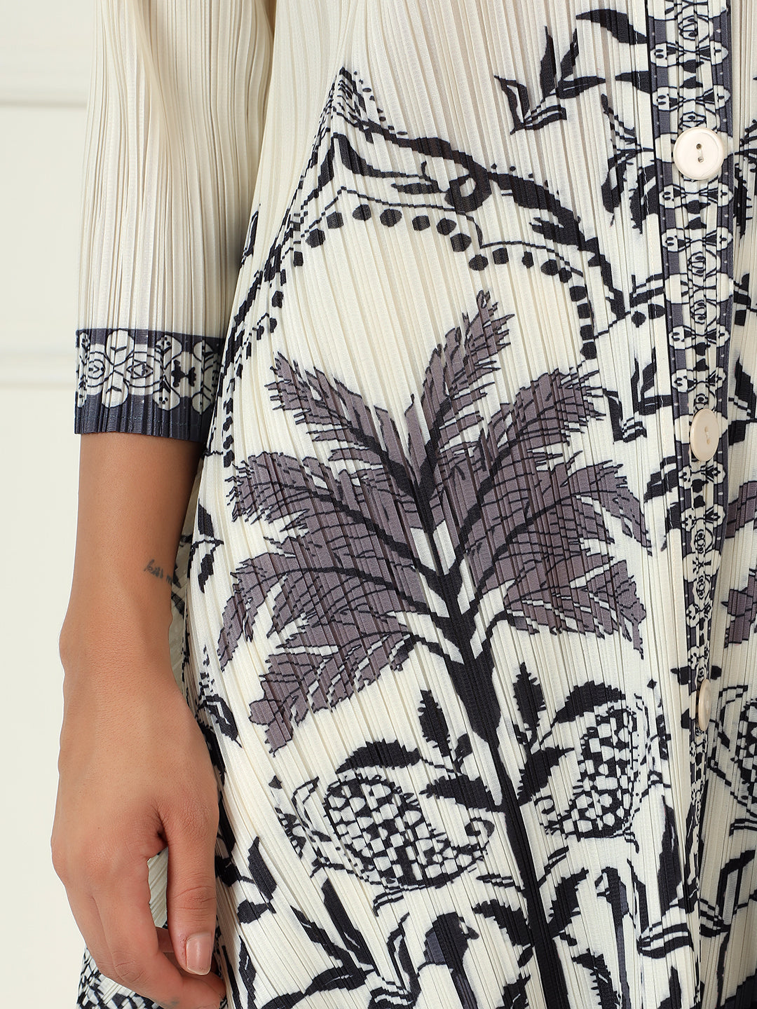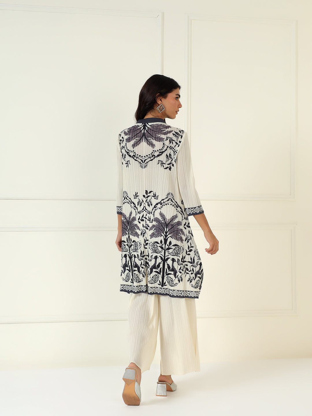 Embrace timeless elegance with the Palm Grove Coord Set, featuring a long pleated kurta with earthy palm motifs in rust and brown, paired with soft, flowy cream trousers. The collared neckline and intricate detailing bring a refined charm, making it a perfect blend of modern tailoring and traditional artistry. Ideal for workwear, casual evenings, or intimate gatherings.