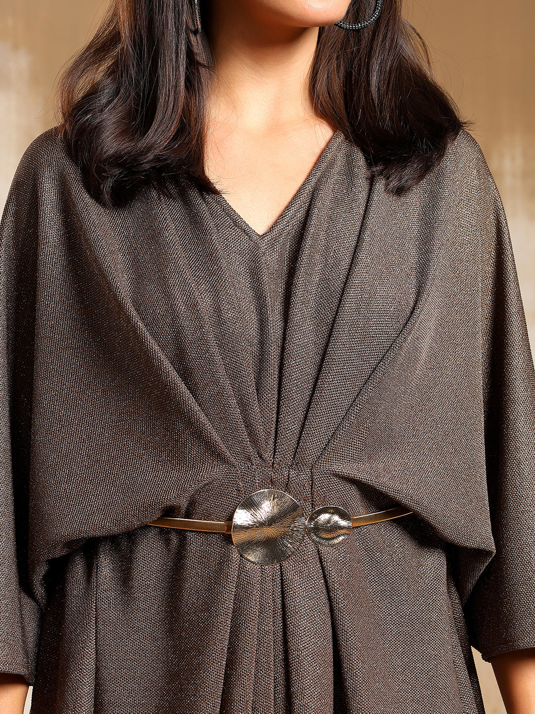 The Raven Drape Dress embodies modern glamour with a touch of effortless sophistication. Crafted from a soft metallic stretch knit, it features a fluid drape that gathers beautifully at the waist to create an elegant, sculpted silhouette. The subtle shimmer catches the light with every movement, while the V-neckline and relaxed sleeves add to its refined ease.