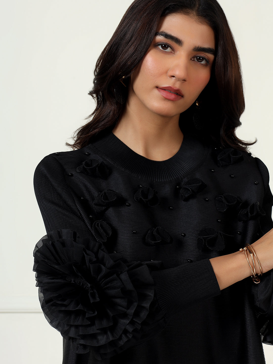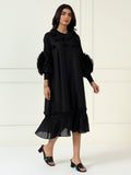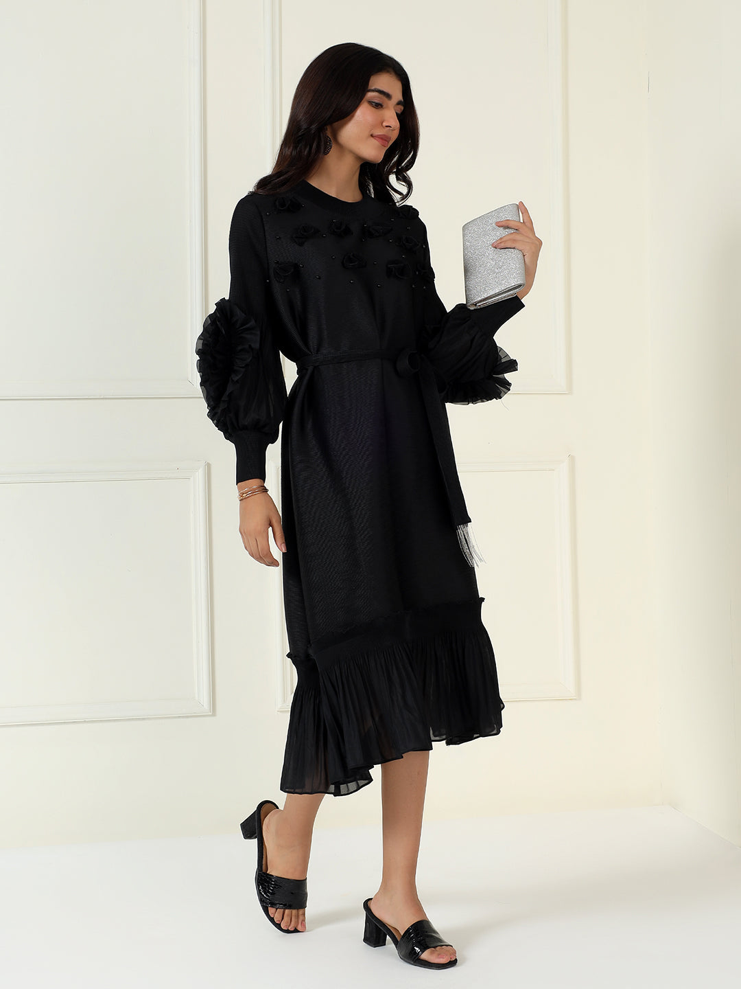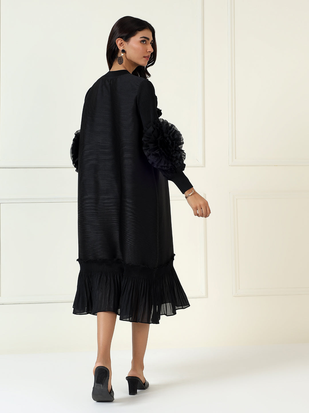 Bold, feminine, and full of movement — the Rosette Flare Dress is your statement-making essential. Designed in a striking rose pink, this dress features sculptural pleated ruffles on the sleeves and hem, adding drama with every step. The fluid silhouette flatters effortlessly, making it perfect for both daytime charm and evening chic.