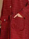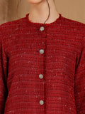 The Roux Tweed Jacket Dress is a statement in timeless sophistication and winter charm. Crafted from rich red tweed interwoven with subtle metallic threads, it radiates warmth and luxury. The structured silhouette features front button detailing, statement pockets, and soft frayed edges — balancing classic tailoring with a modern finish.